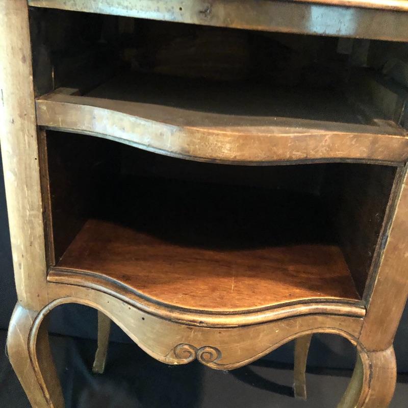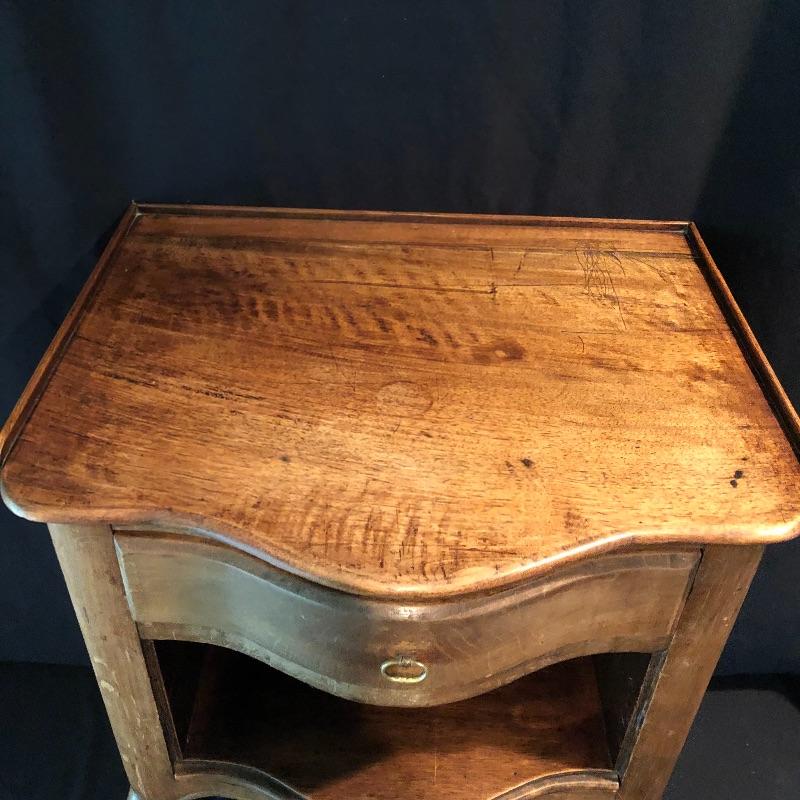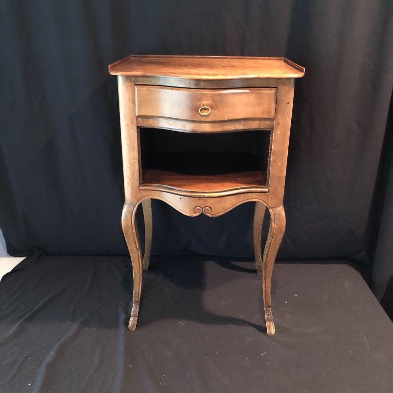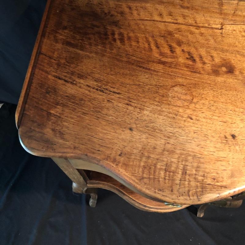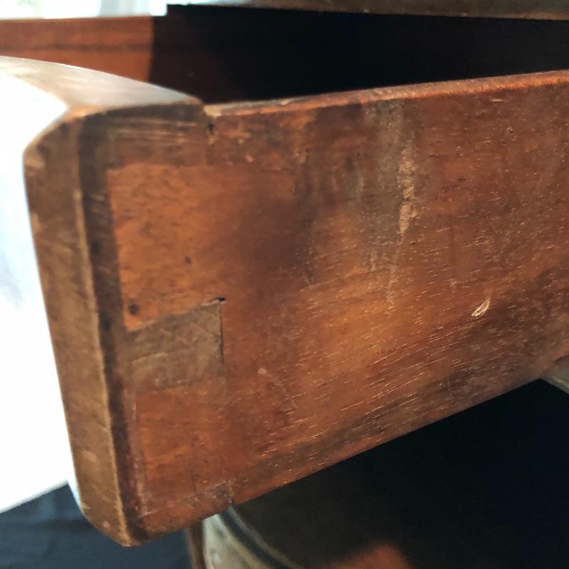 This lovely side table has a dovetailed drawer with a shelf underneath. This table is in nice shape with some scratches, chips on one leg and what appears to be wormholes, see pictures.