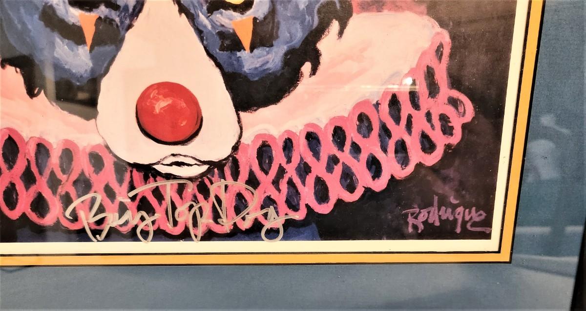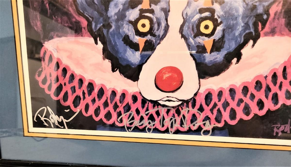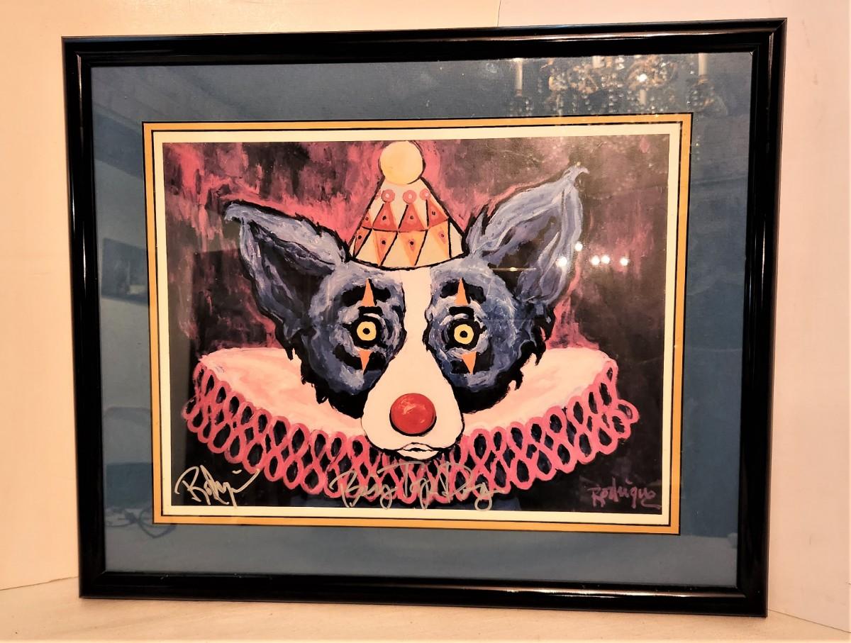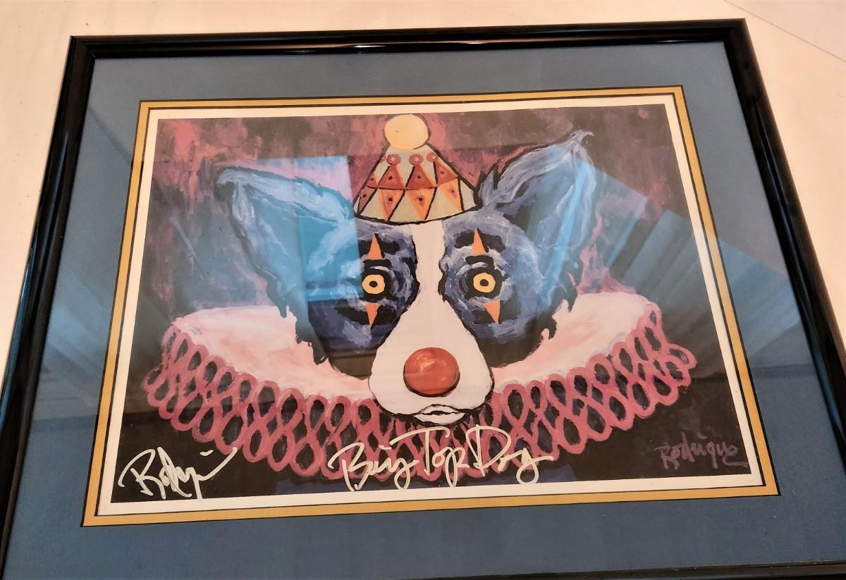 Signed George RODRIGUE Blue Dog Print "Big Top Dog" - he also wrote the name of the piece across the bottom. Double matted - 17" tall, 21" across. We have seen a couple of other sold examples of this piece - none where he also wrote the name of the piece in that distinctive silver marker. Good condition. Guaranteed authentic. You'll love it. Sold with no reserve.
