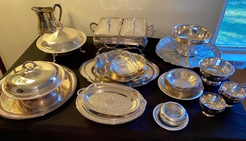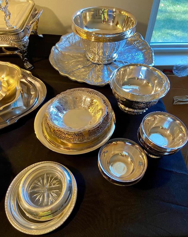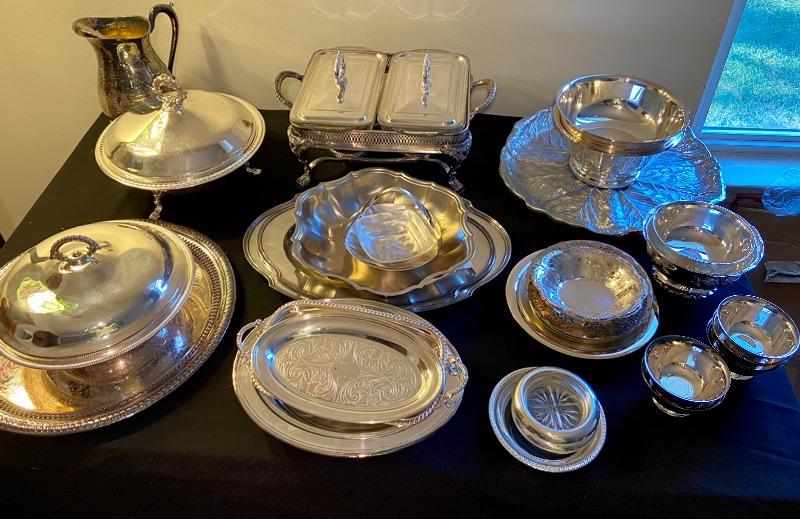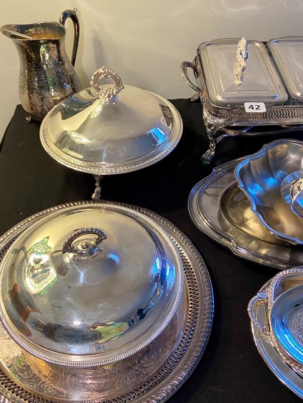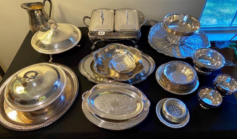 Various silver plated servers, plates, trays, bowls, coasters, and pitcher. GLASS/SILVER COASTERS HAVE BEEN REMOVED FROM THIS LOT.