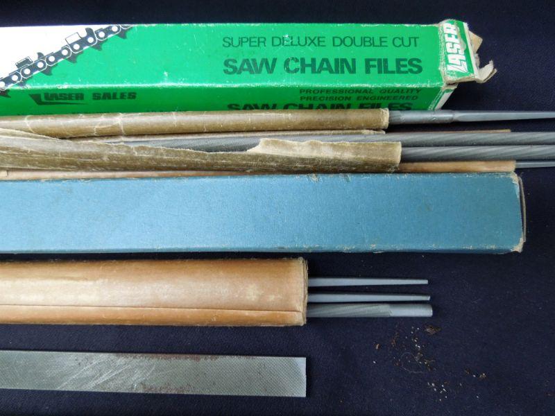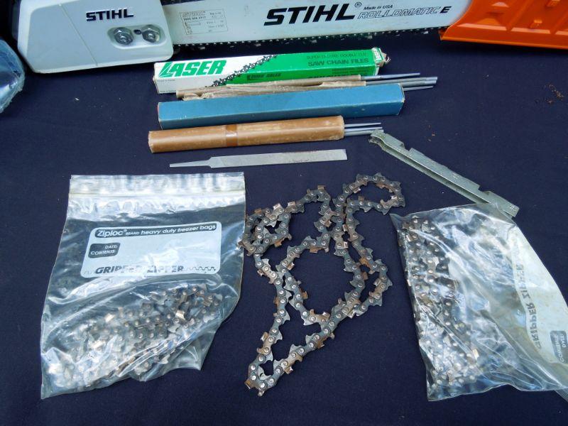 Includes manual, 4 full containers of 2 cycle oil; a jug of bar chain oil; two sets of chain files in box; three extra chains and a orange plastic bar cover.