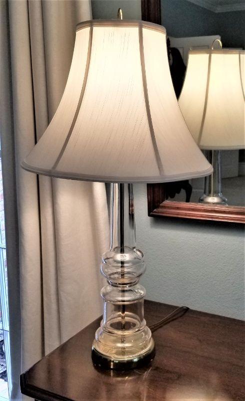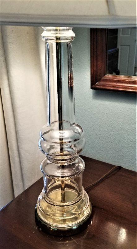 Very Stylish Table Lamp with glass base and brass accents, good shade, 29" tall not counting the finial. Good working condition.