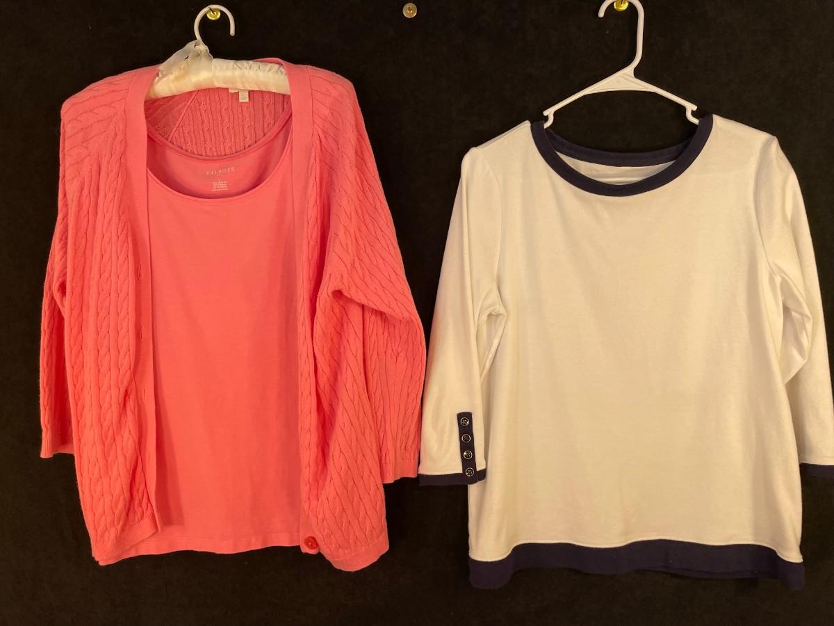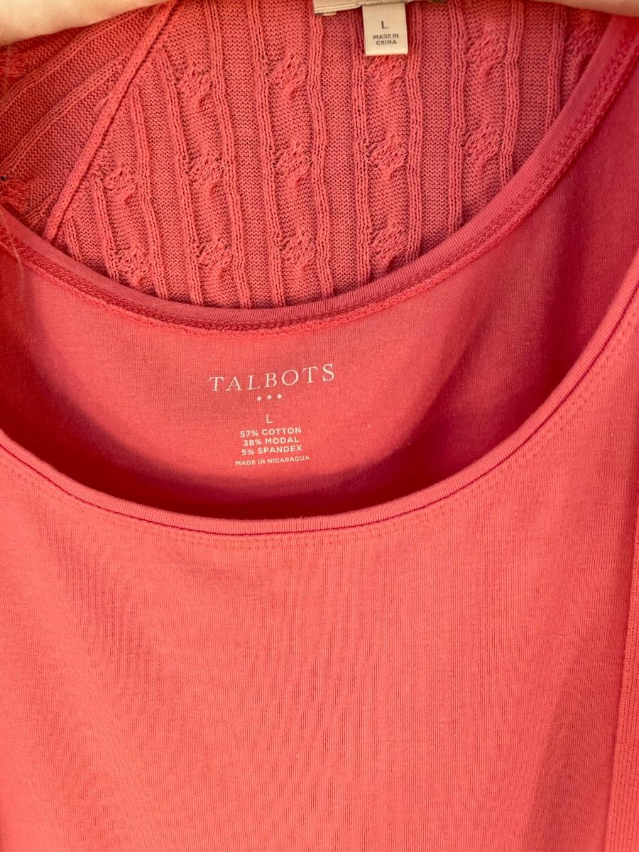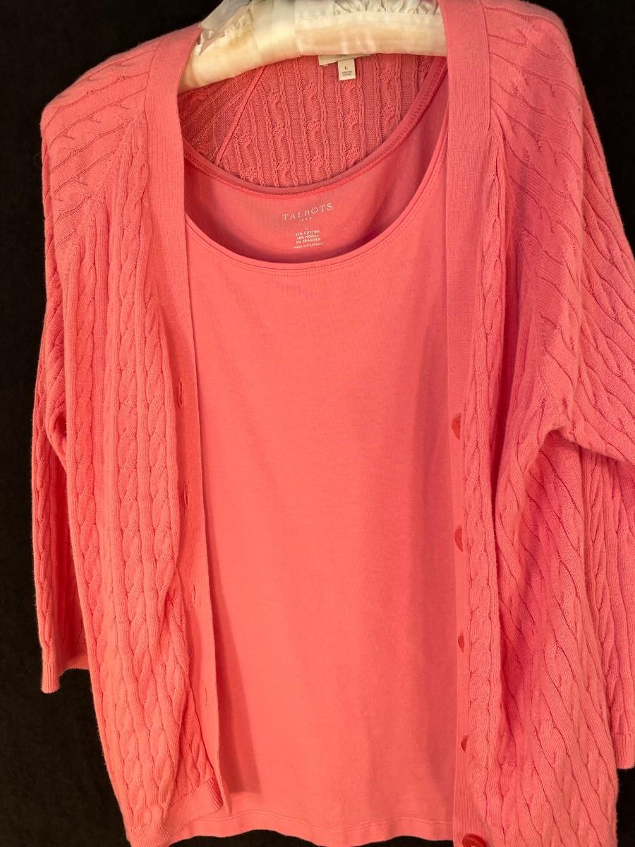 Talbots salmon-colored shell and cardigan, size large. Shell 57% cotton, 38% modal & 5% spandex.