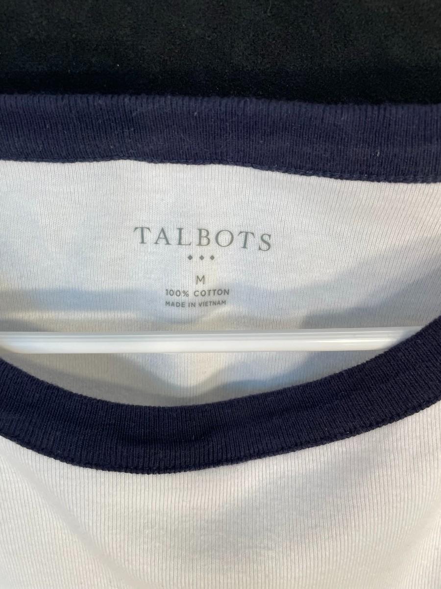 Talbots soft white top with navy trim and button accents. Size medium and 100% cotton.