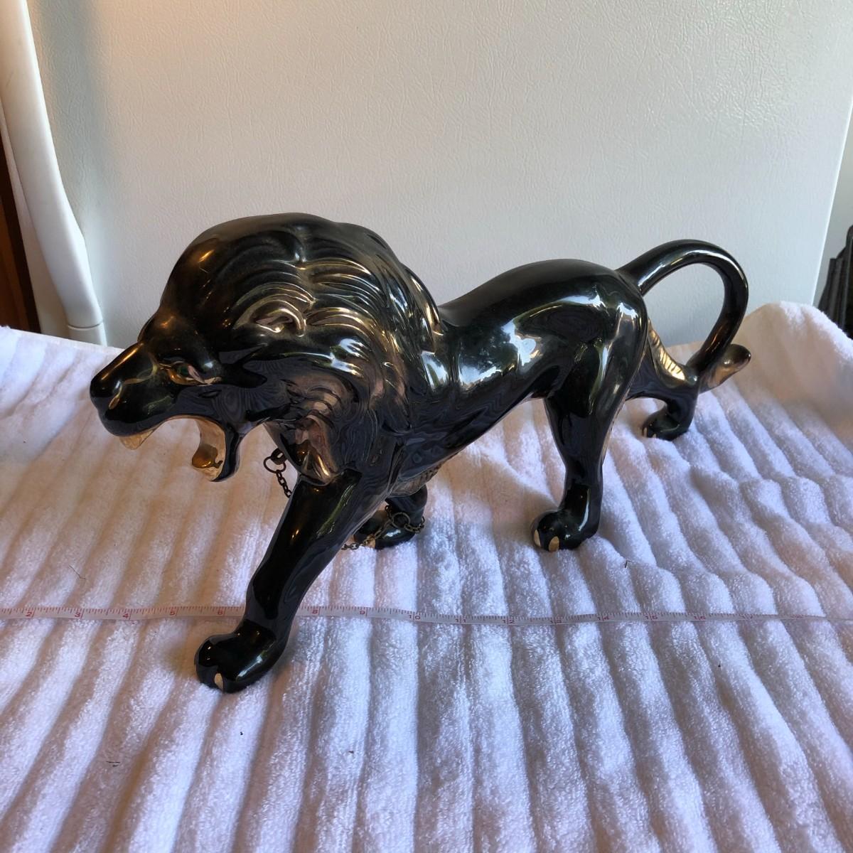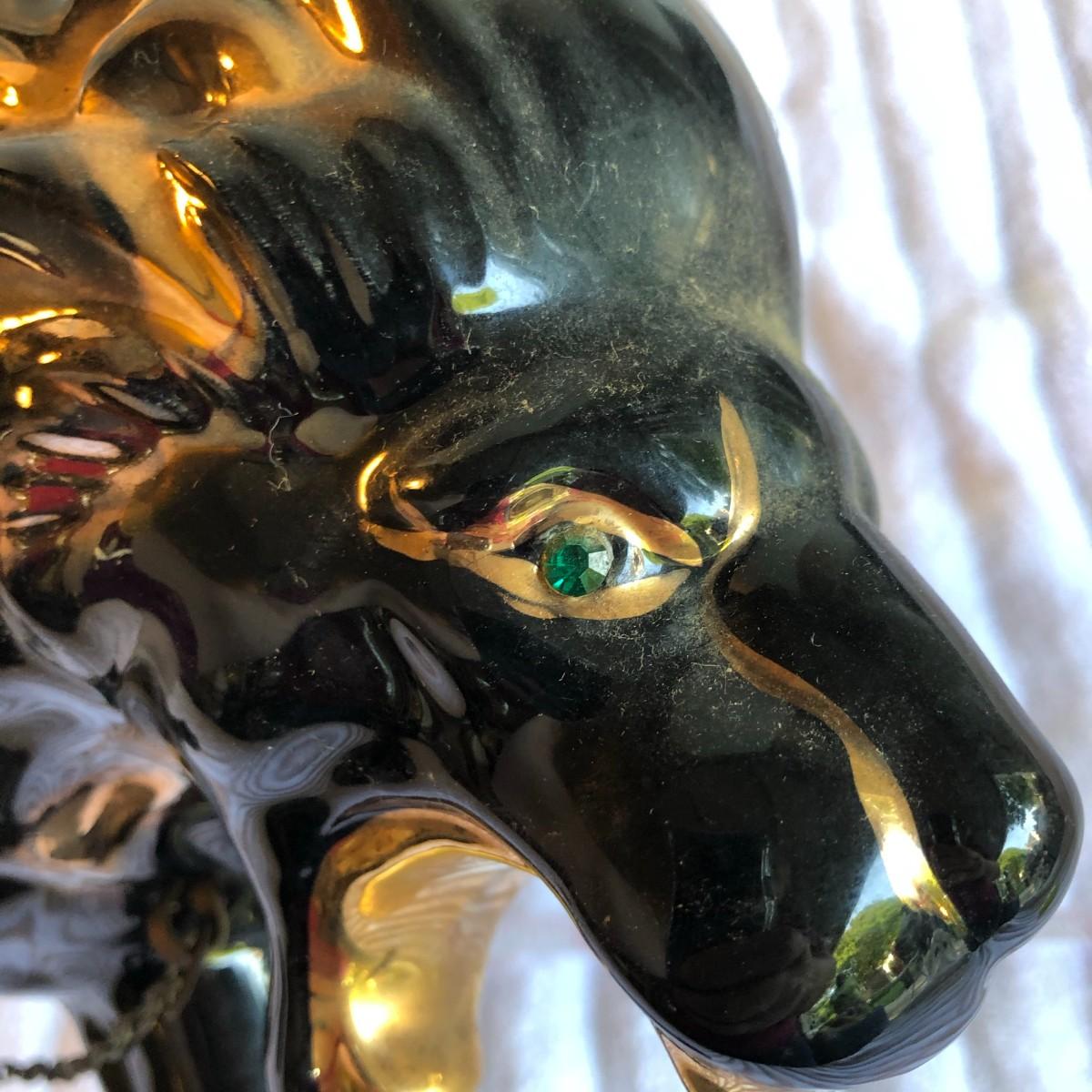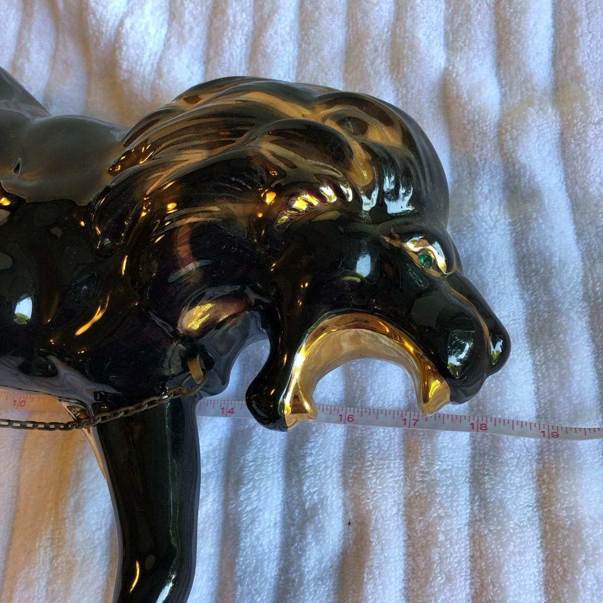 Gorgeous, majestic, powerfull lion that is painted black with gold paint highlights and green crystal eyes. No issues found. About 18.5" long.