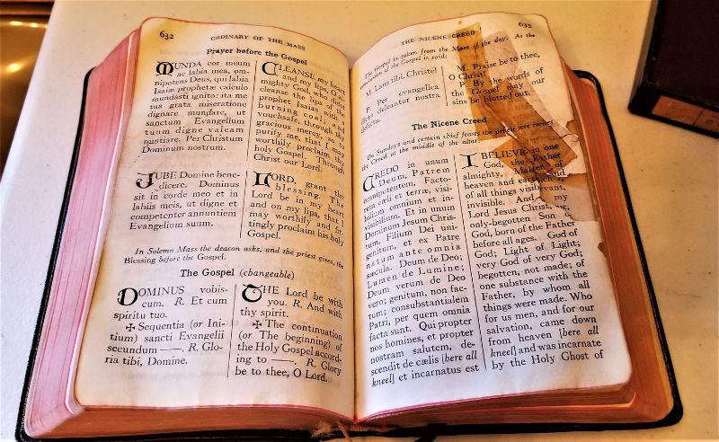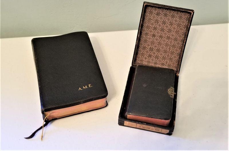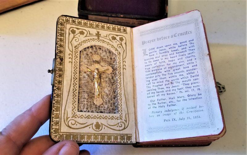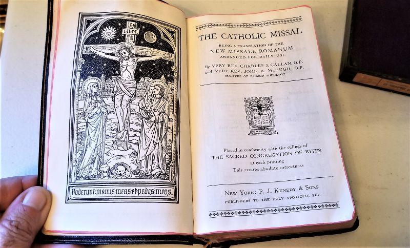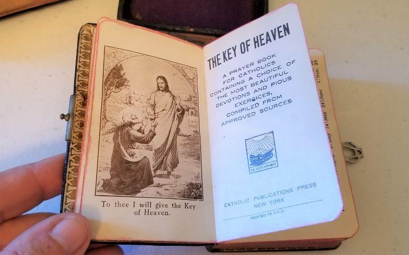 Moroccan Leather Catholic Missal - 1943 pre-Vatican II - initials AME on front, Latin/English, and a great Key of Heaven prayer book in the original box (1939). Prayer book has clasp closure - works fine. Note that the Missal has issues on one page (tear and tape).