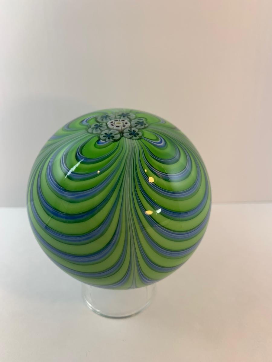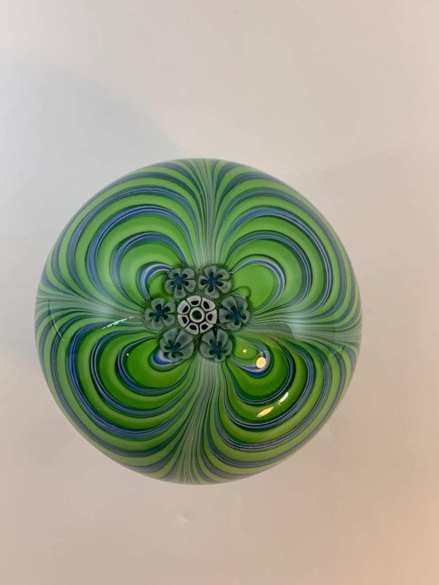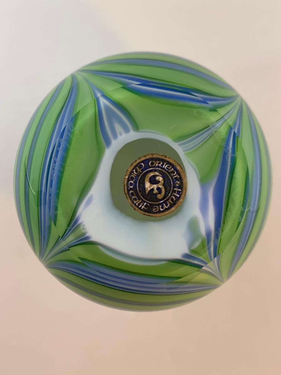 1978 Orient and Flume green and blue pulled feather with centric millefiori pattern. Signed on bottom "Orient & Flume CP 47 M 1978", 3" x 2 1/2"