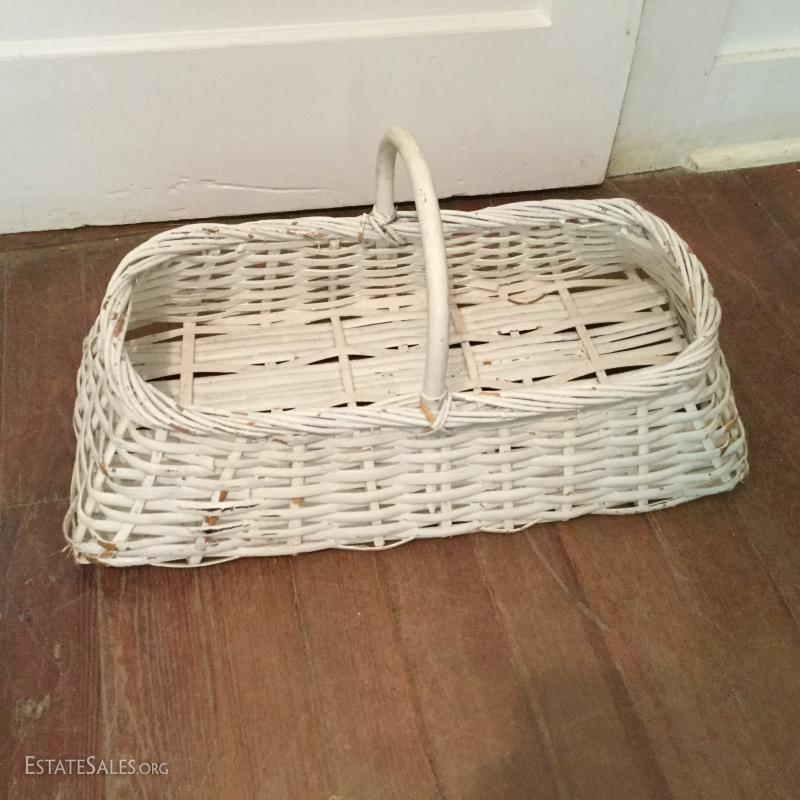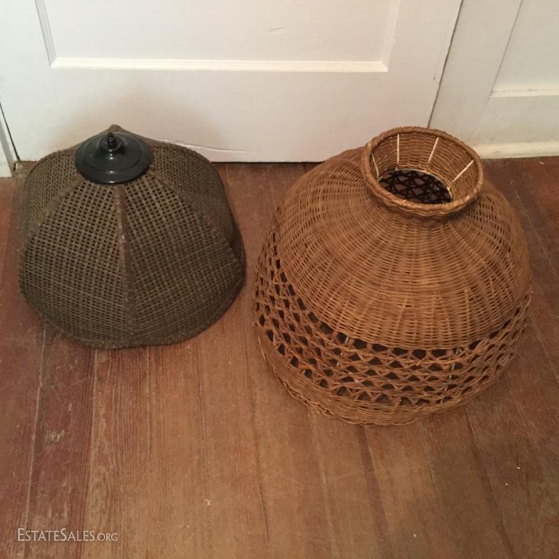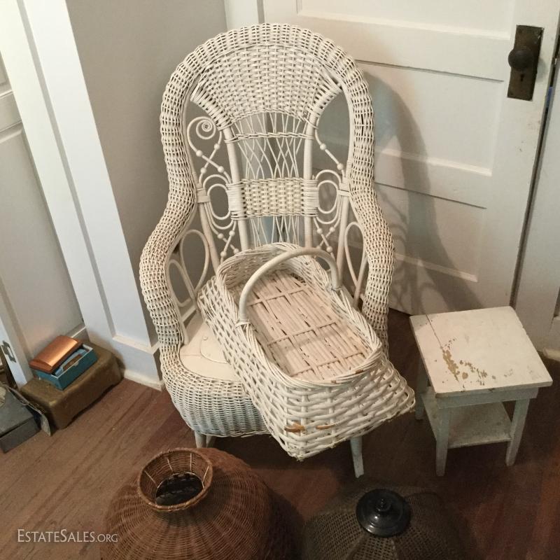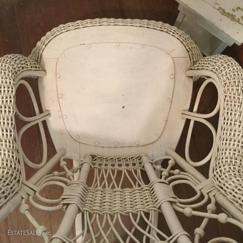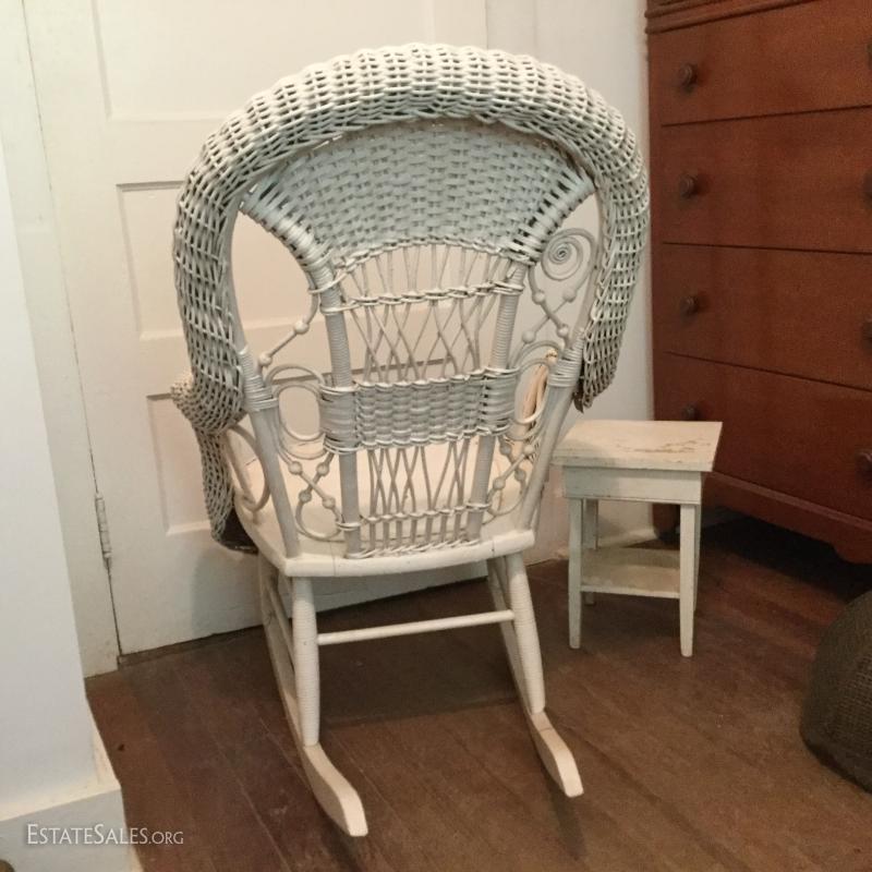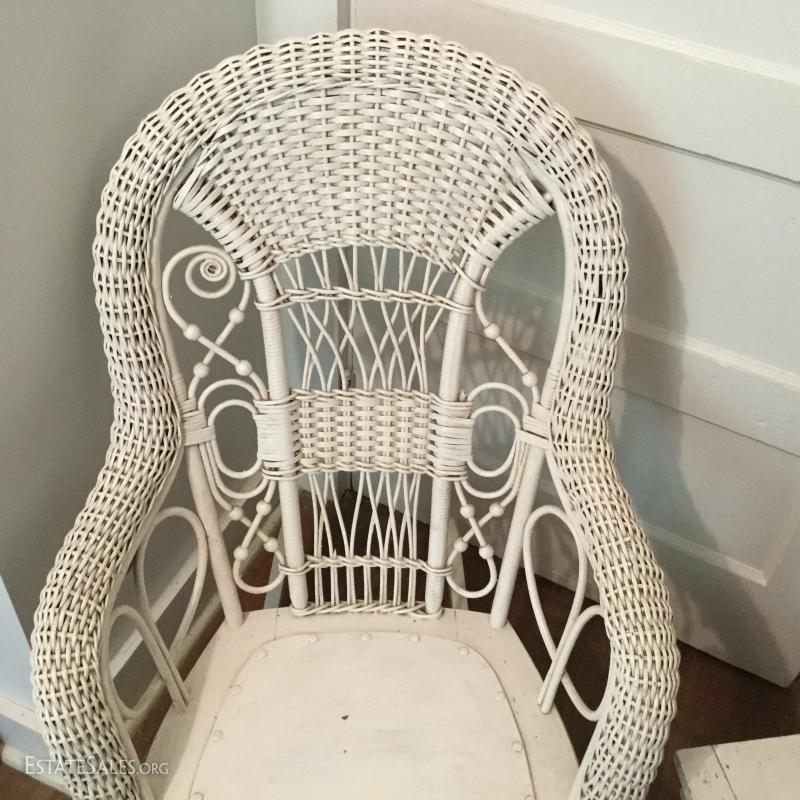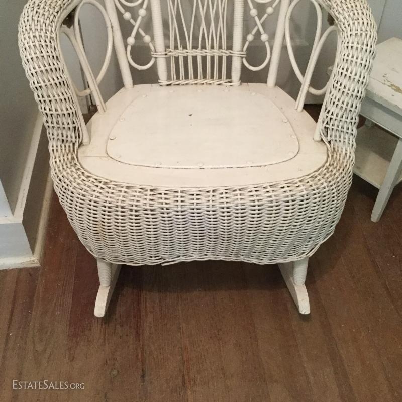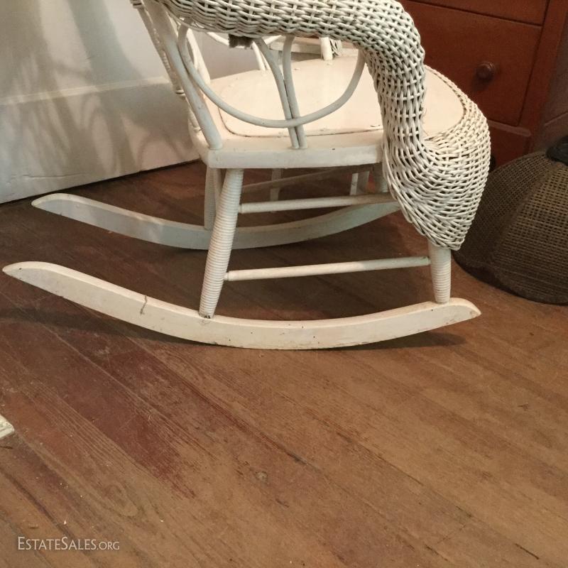 Vintage, white wicker rocking chair: 32"L x 25.5"W x 39"H. Also includes two wicker lamp shades for hanging lamps.