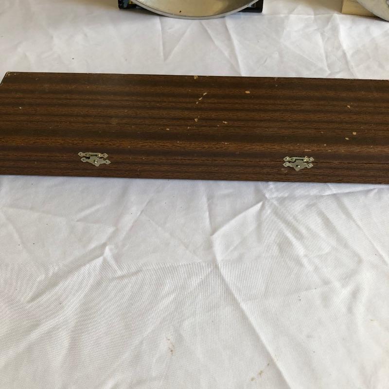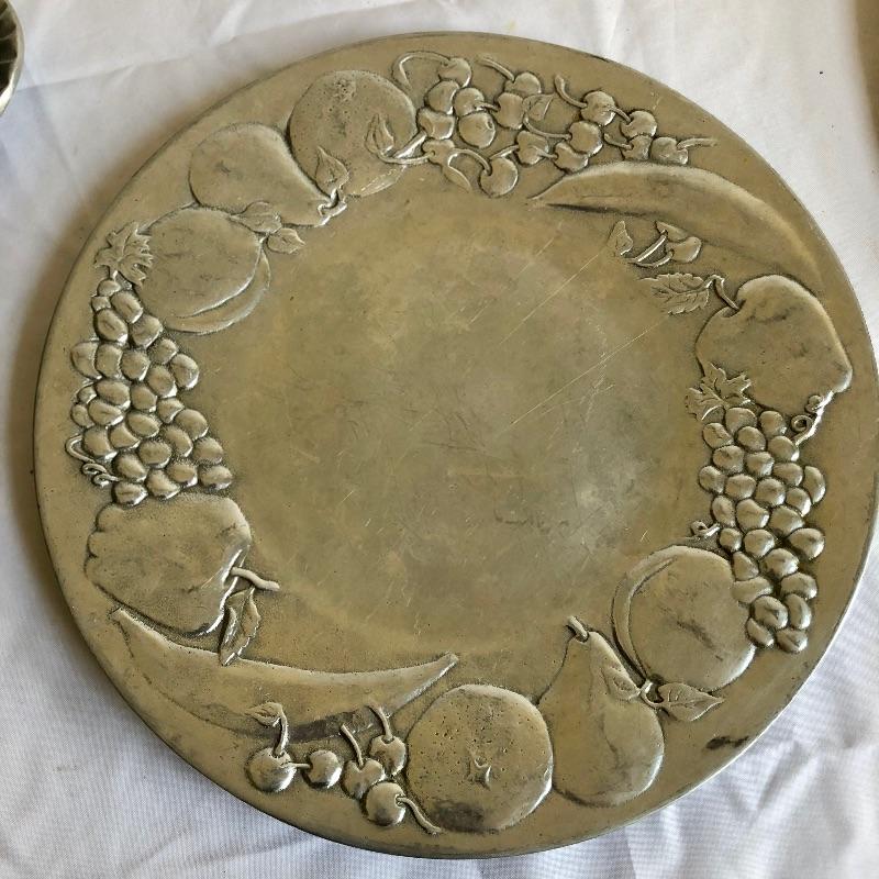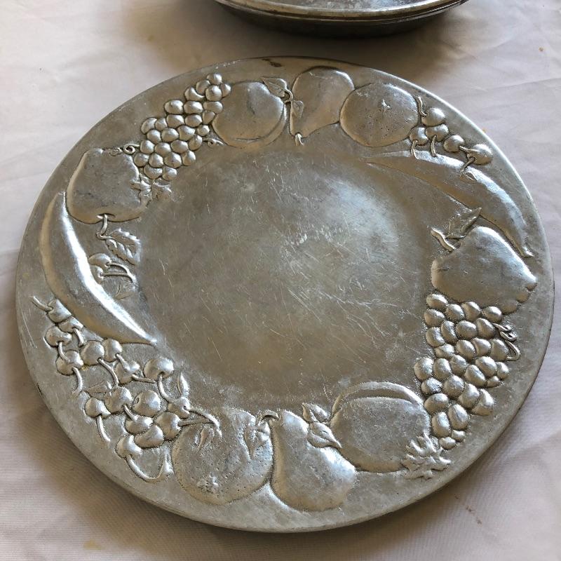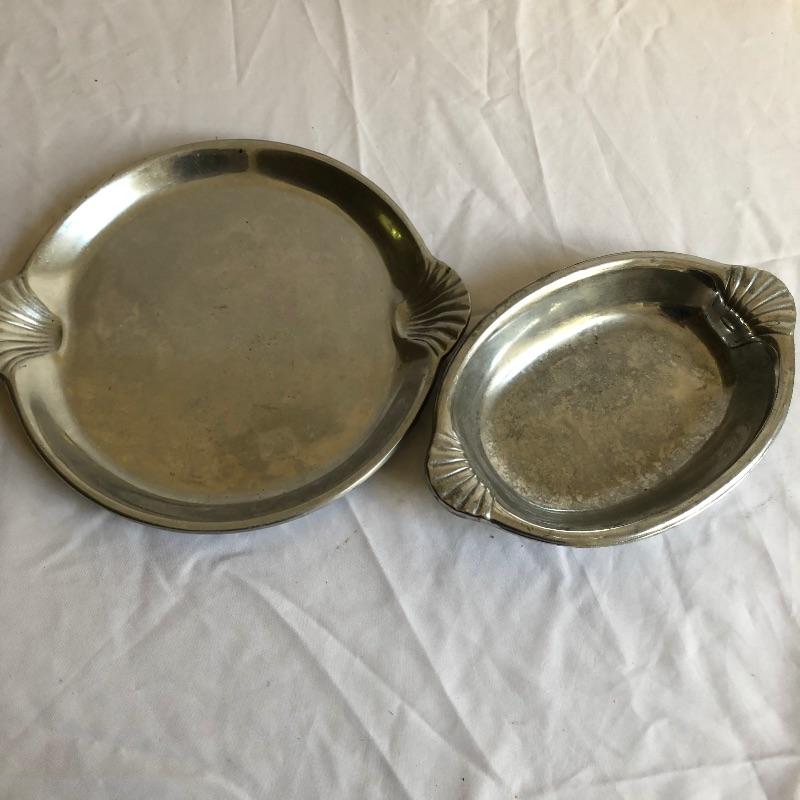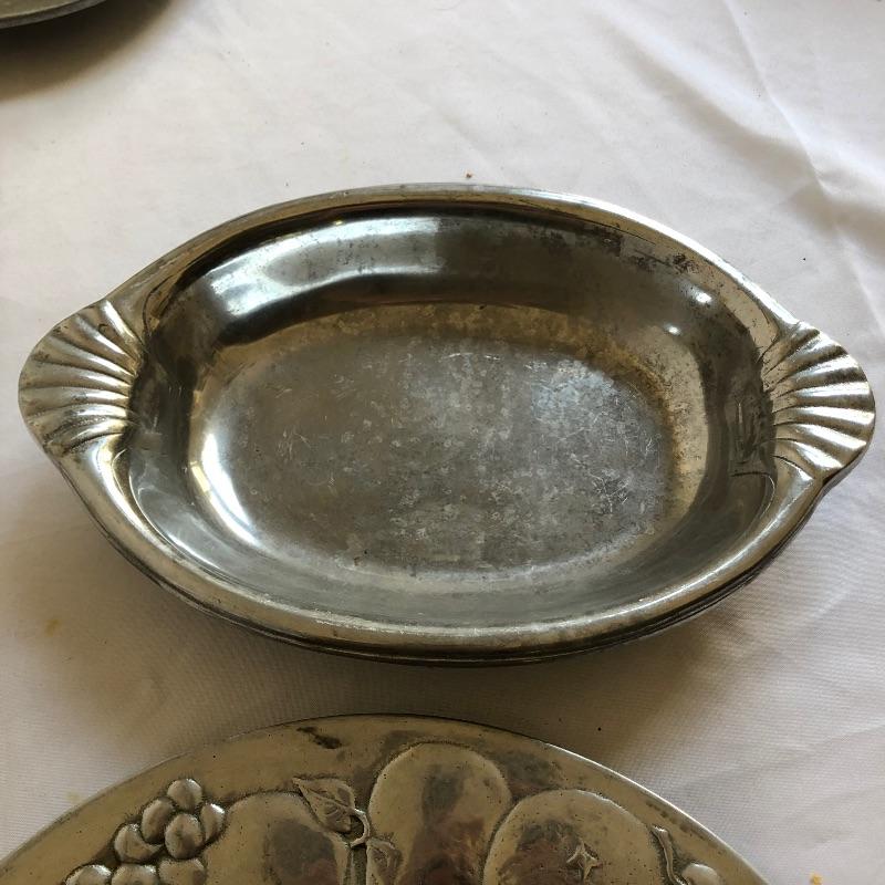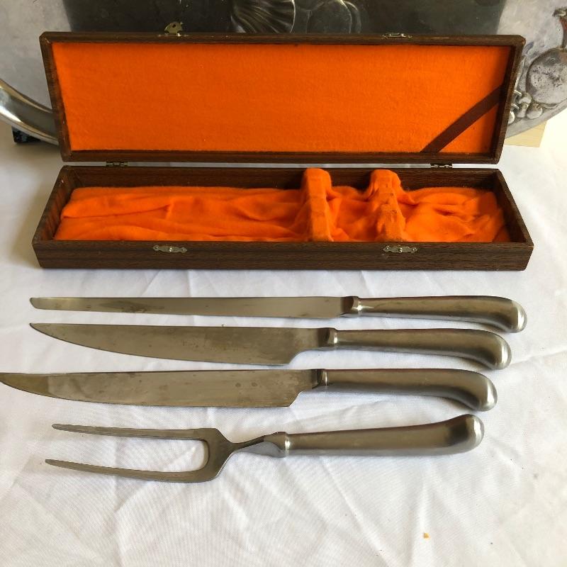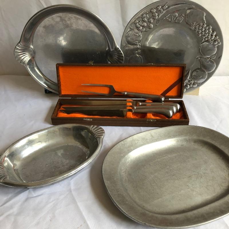 All 4 of these platters are Wilton pewter, ranging in size from 8” x 12” to 12” x 15”. We have added in a Oxford Hall 3 piece knife set and an individual meat fork that are all stainless steel.