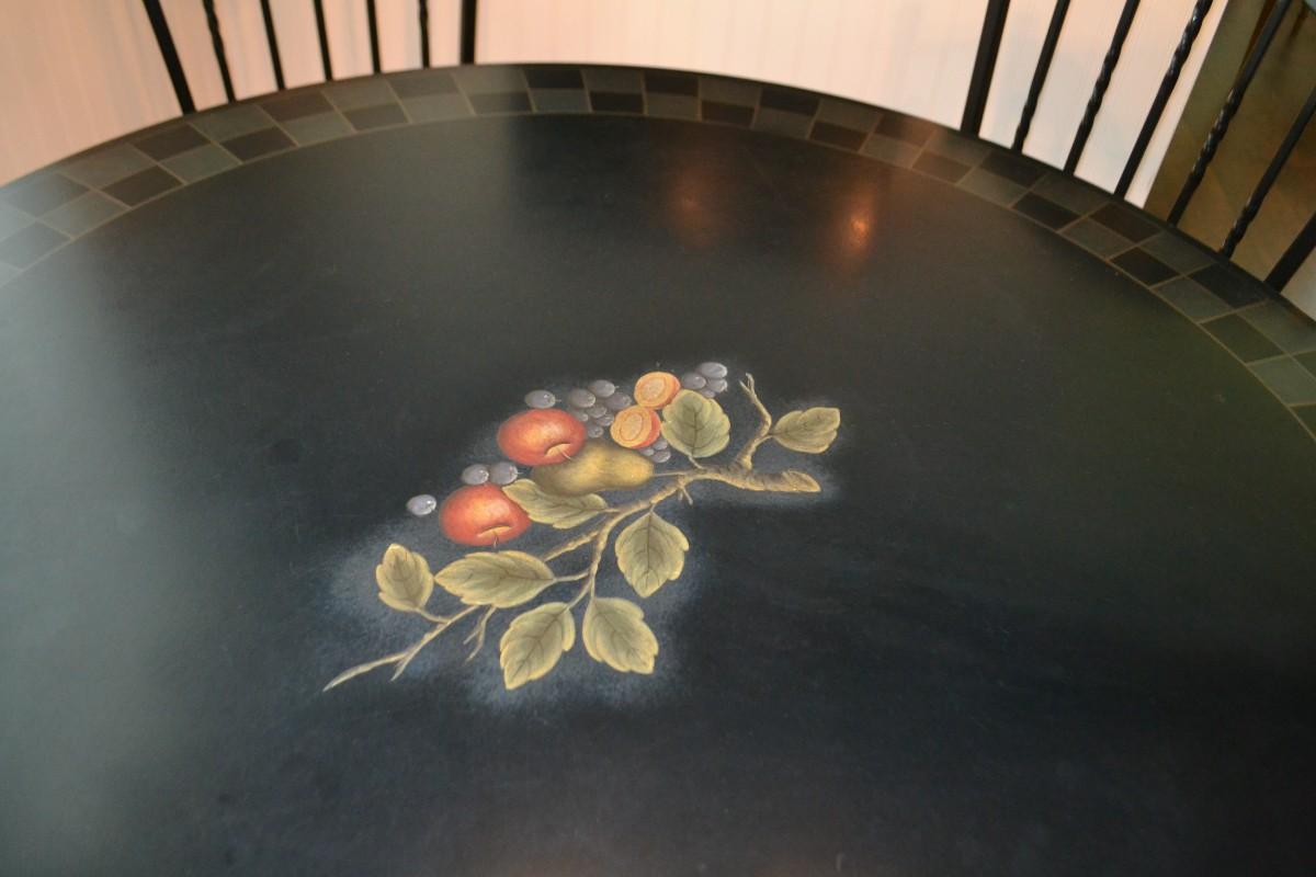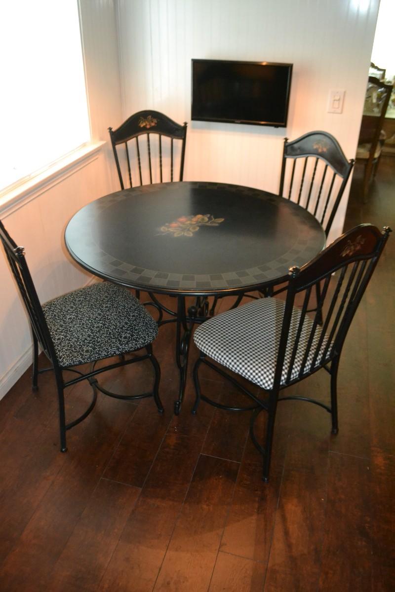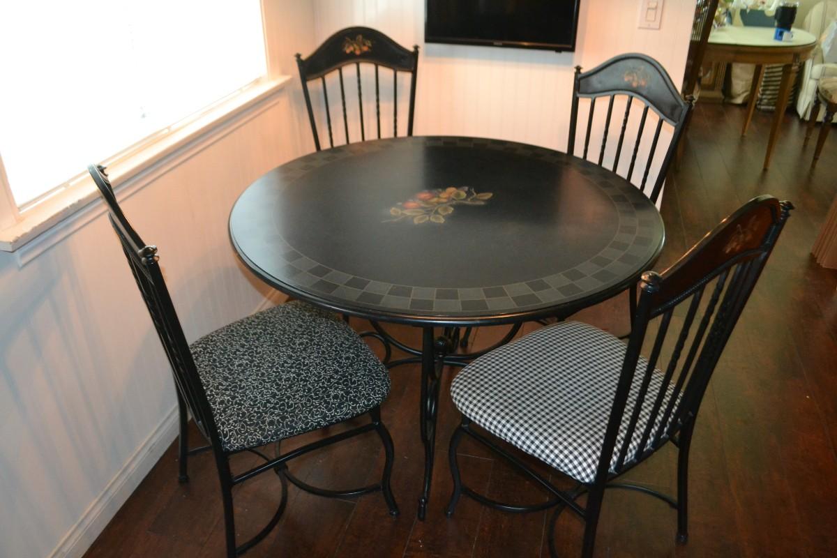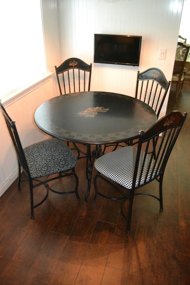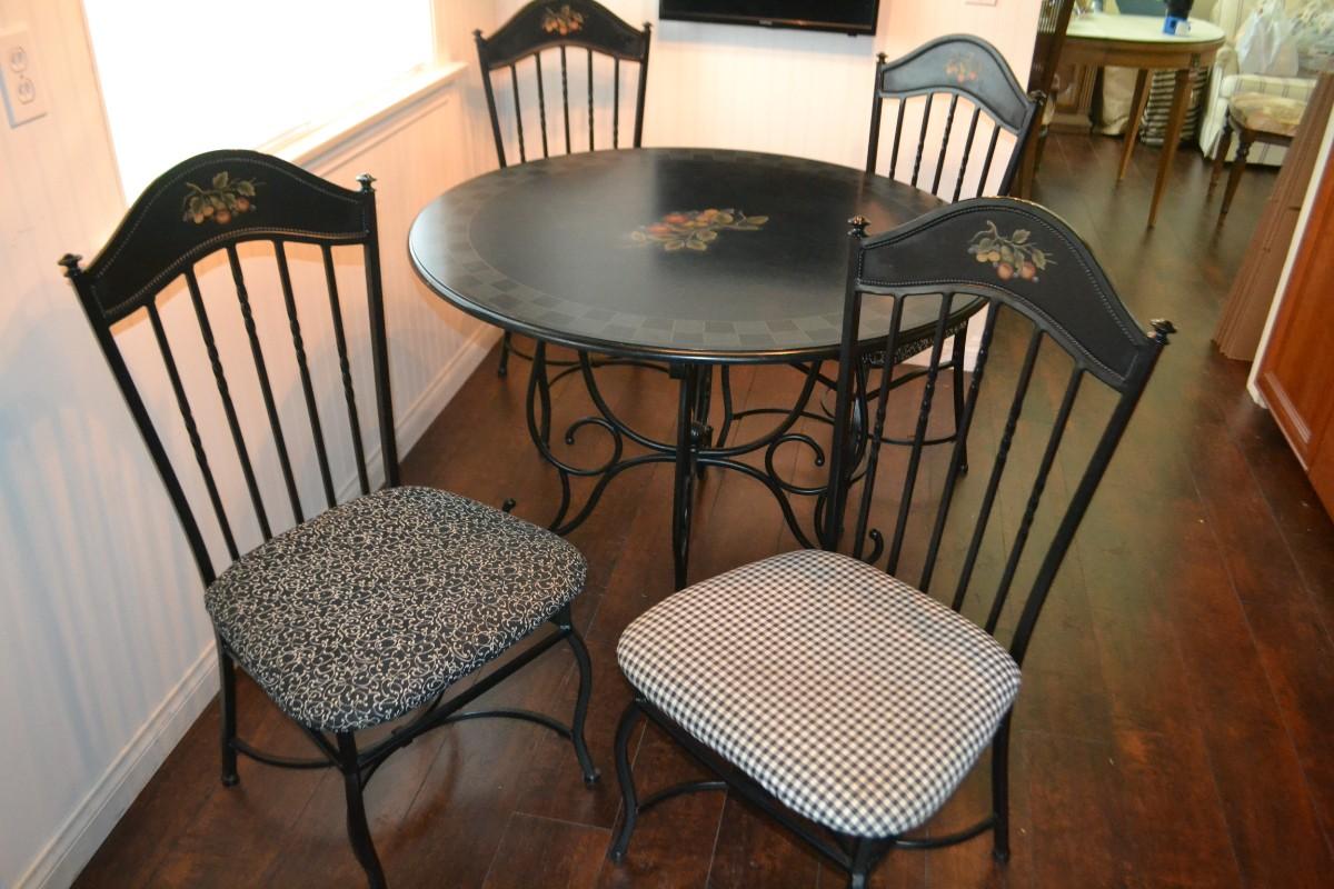 LOT 420. ROUND DINING SET METAL CHAIRS AND WOOD TABLE
