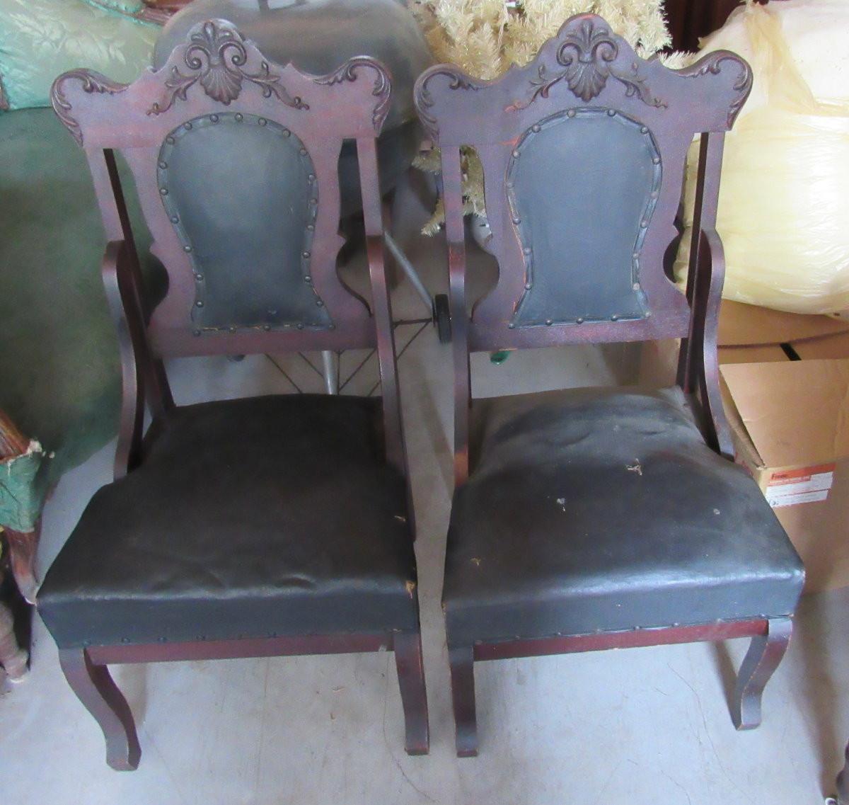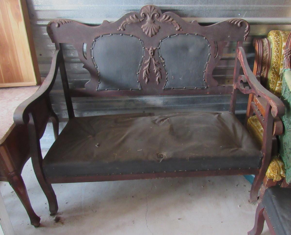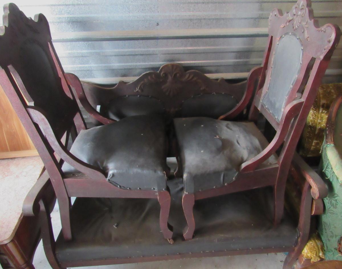 Lot 420: Antique Fancy Carved 3 Piece Wood Set, Settee and 2 Chairs, Matching, For Refinishing