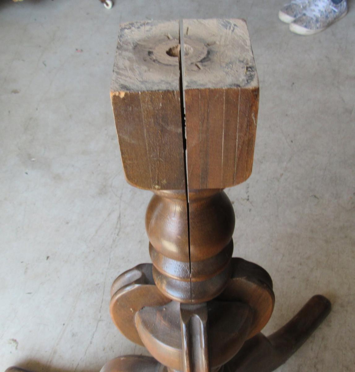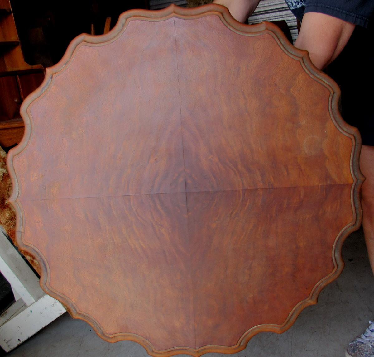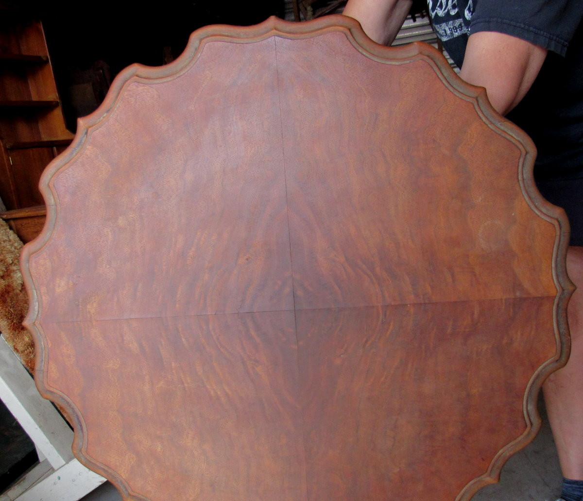 Beautiful, hard to find tilt top pie crust table. Was in storage for over 20 years and due to dryness the base cracked where the top screws into the base. Some good strong wood glue, some clamps and time to harden, screw the top back on and you have a very nice table. Nice fancy carved pedestal and claw feet. Hardware appears to be all there under the nice top. Check out the prices online on these tables.