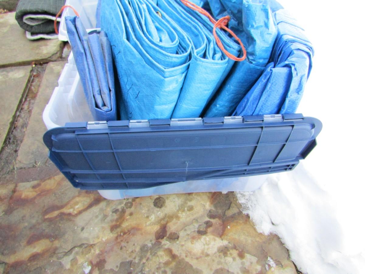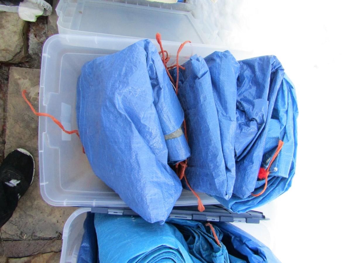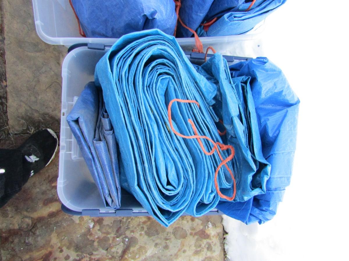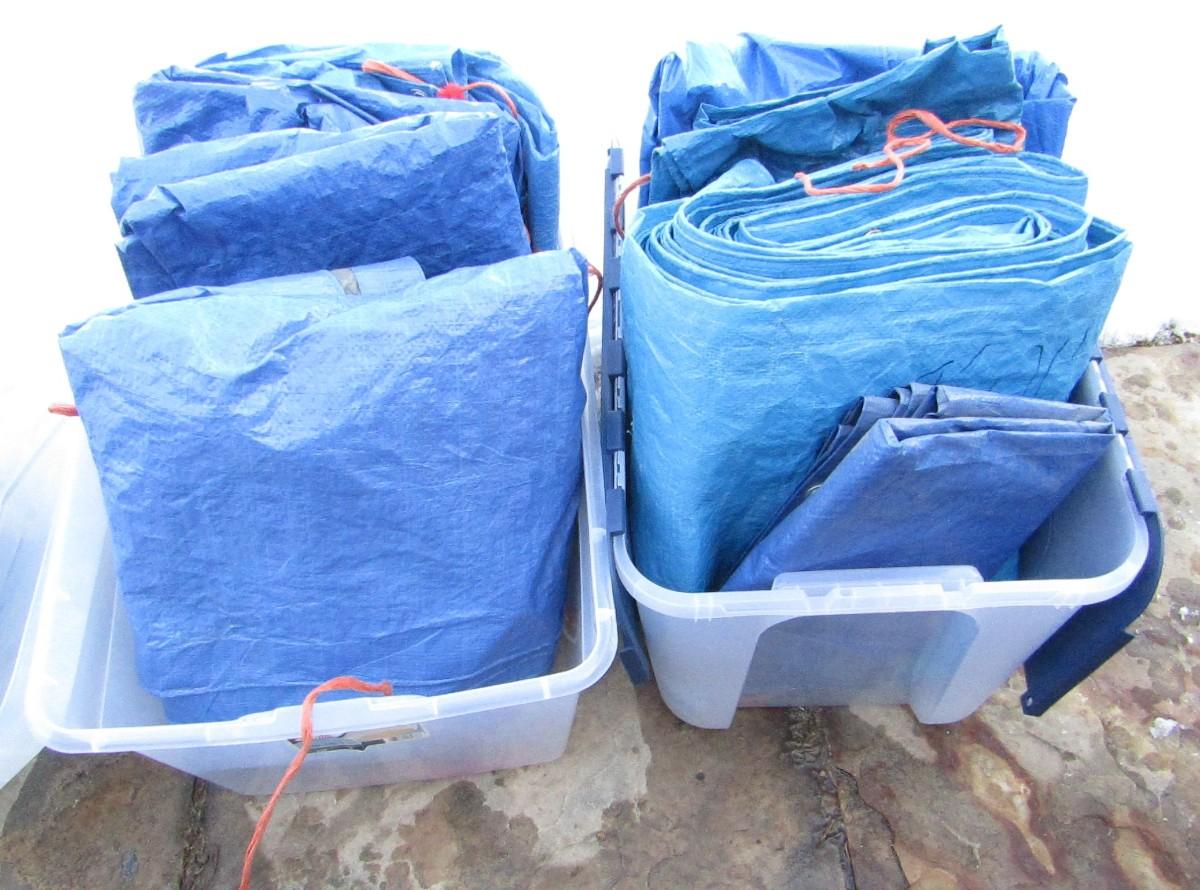 LOT 421 EIGHT BLUE TARPS AND 2 STORAGE TOTES