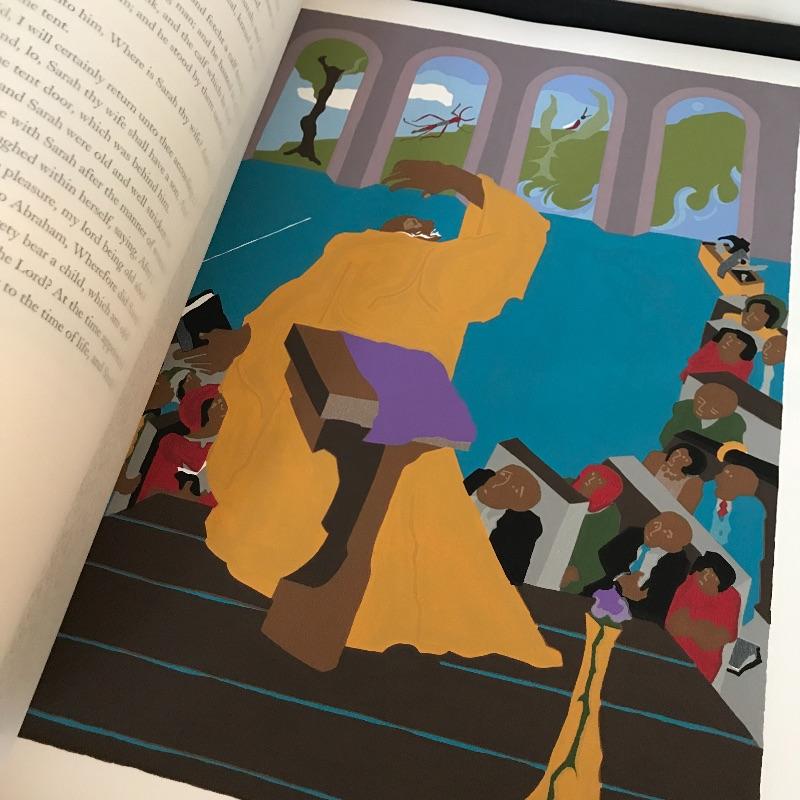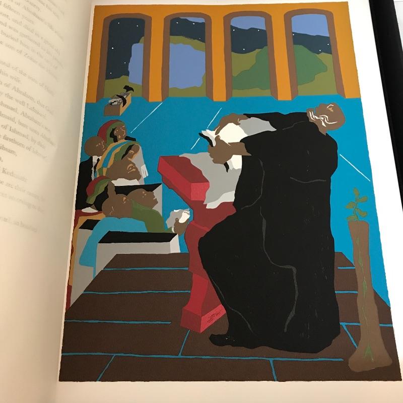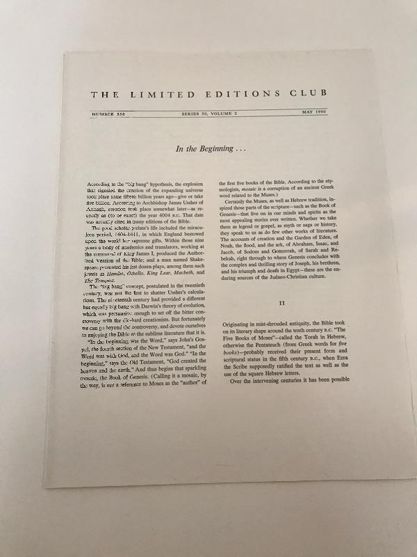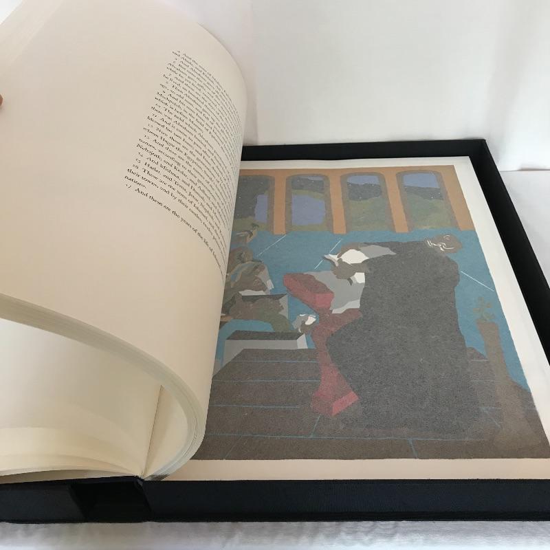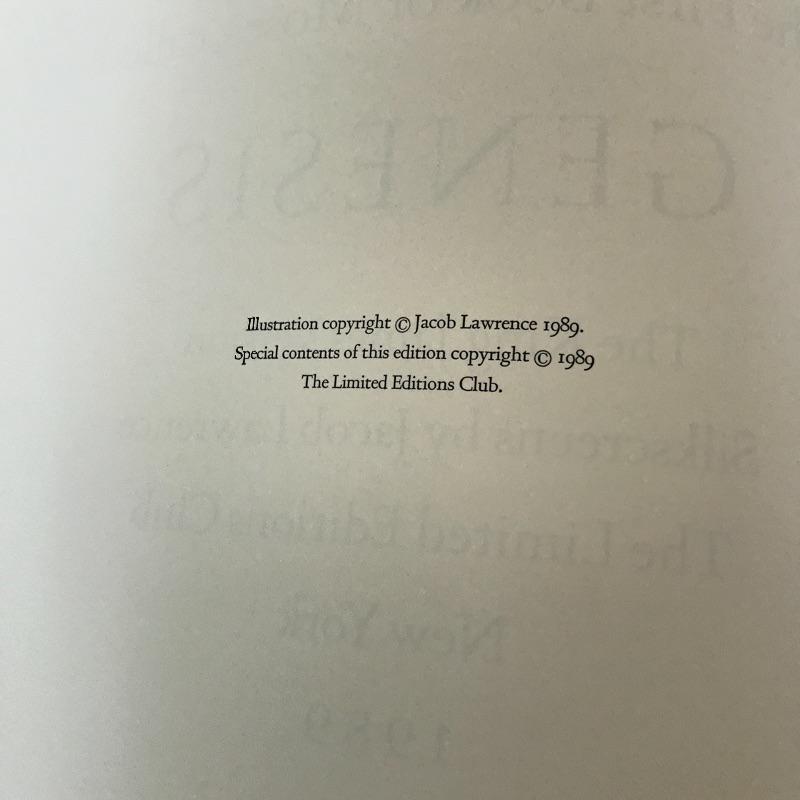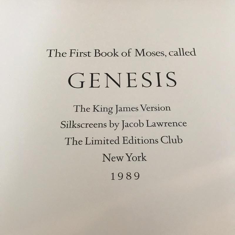 Wow. This enormous book will be a conversation starter. The First Book of Moses called Genesis is The King James Version. It includes impressive colorful silkscreens by Jacob Lawrence. It is published by The Limited Editions Club in New York in 1989 and includes the Club Newsletter. It measures 23.5” x 18” x 2.5”. Clamshell case has some sun damage. Otherwise both case and book are in great condition. Shipping available. Please call UPS at (828) 252-6930 for shipping quote prior to bidding.