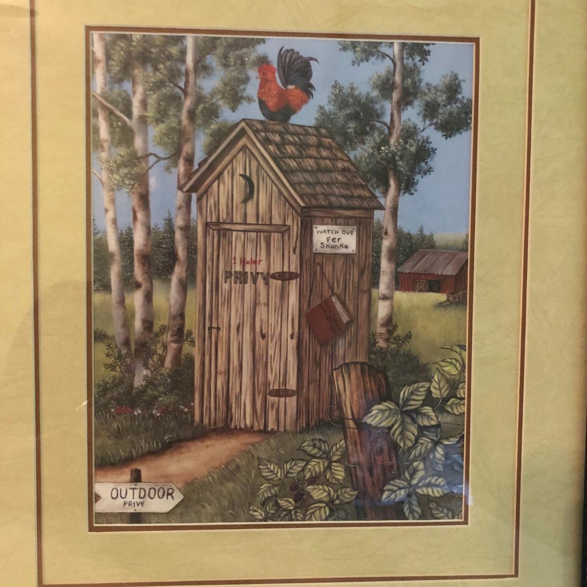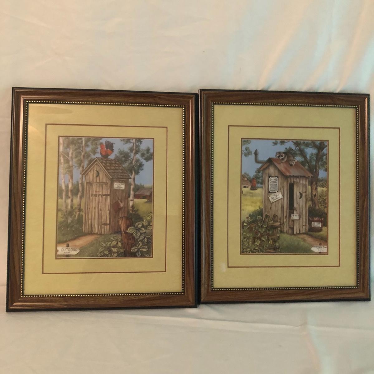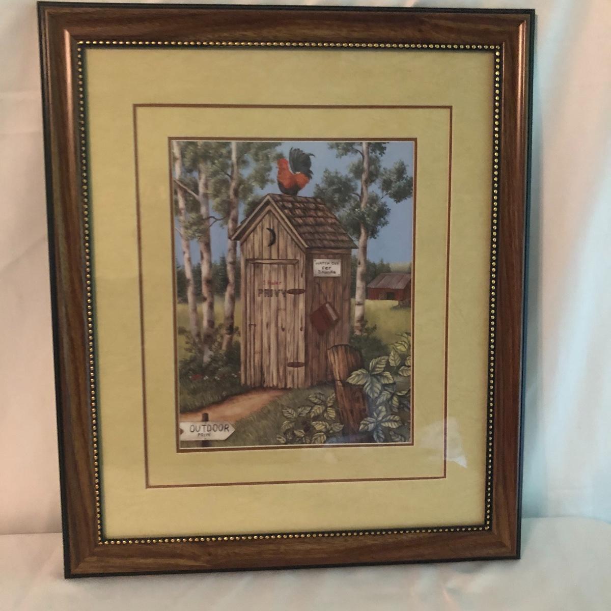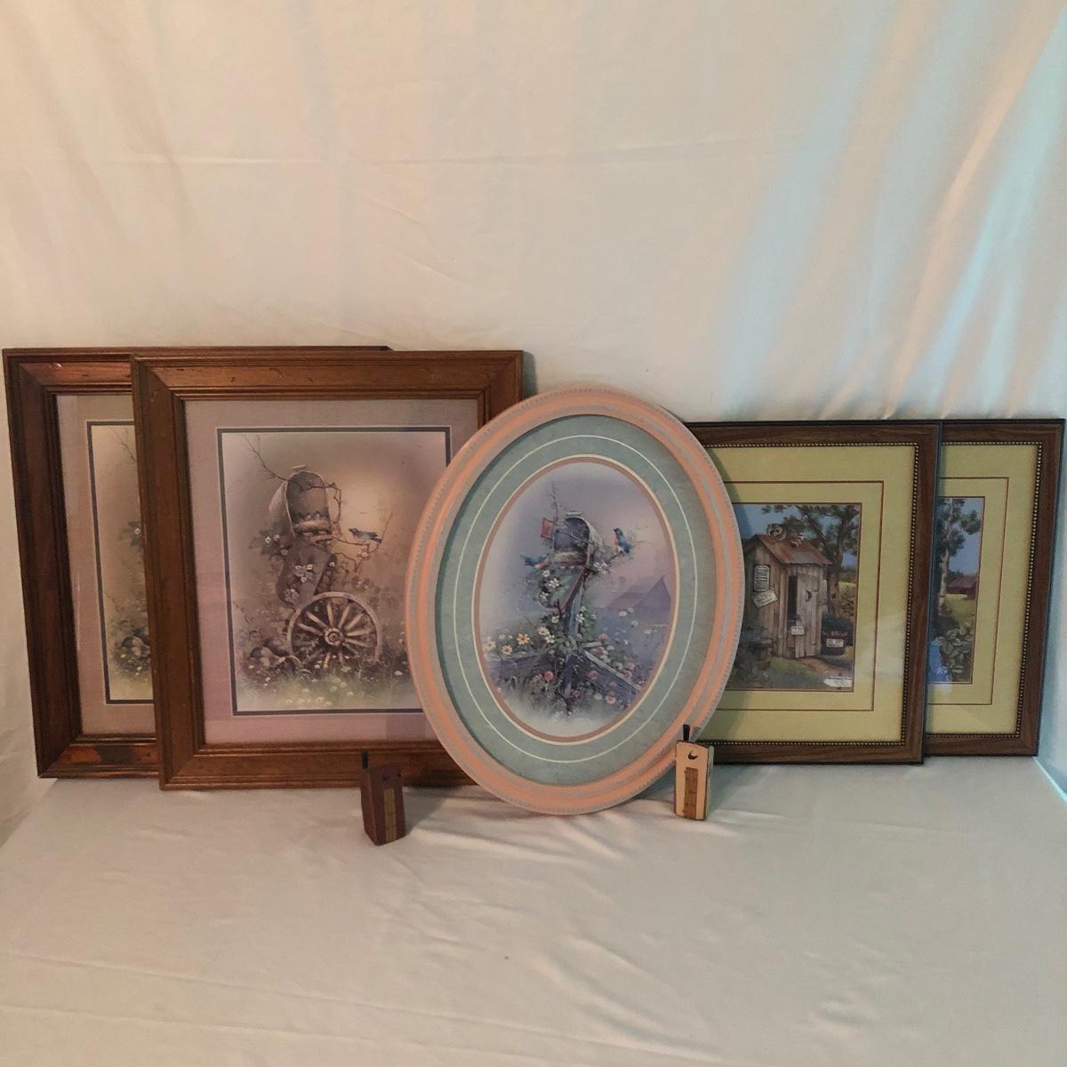 Lot includes two identical wooden framed and matted prints of a bird nest in a mailbox, a oval plastic framed bird with nest in a mailbox. Also includes two plastic framed and matted privy artwork with two small privies made from wood. Largest frame measures 17” x 20”.