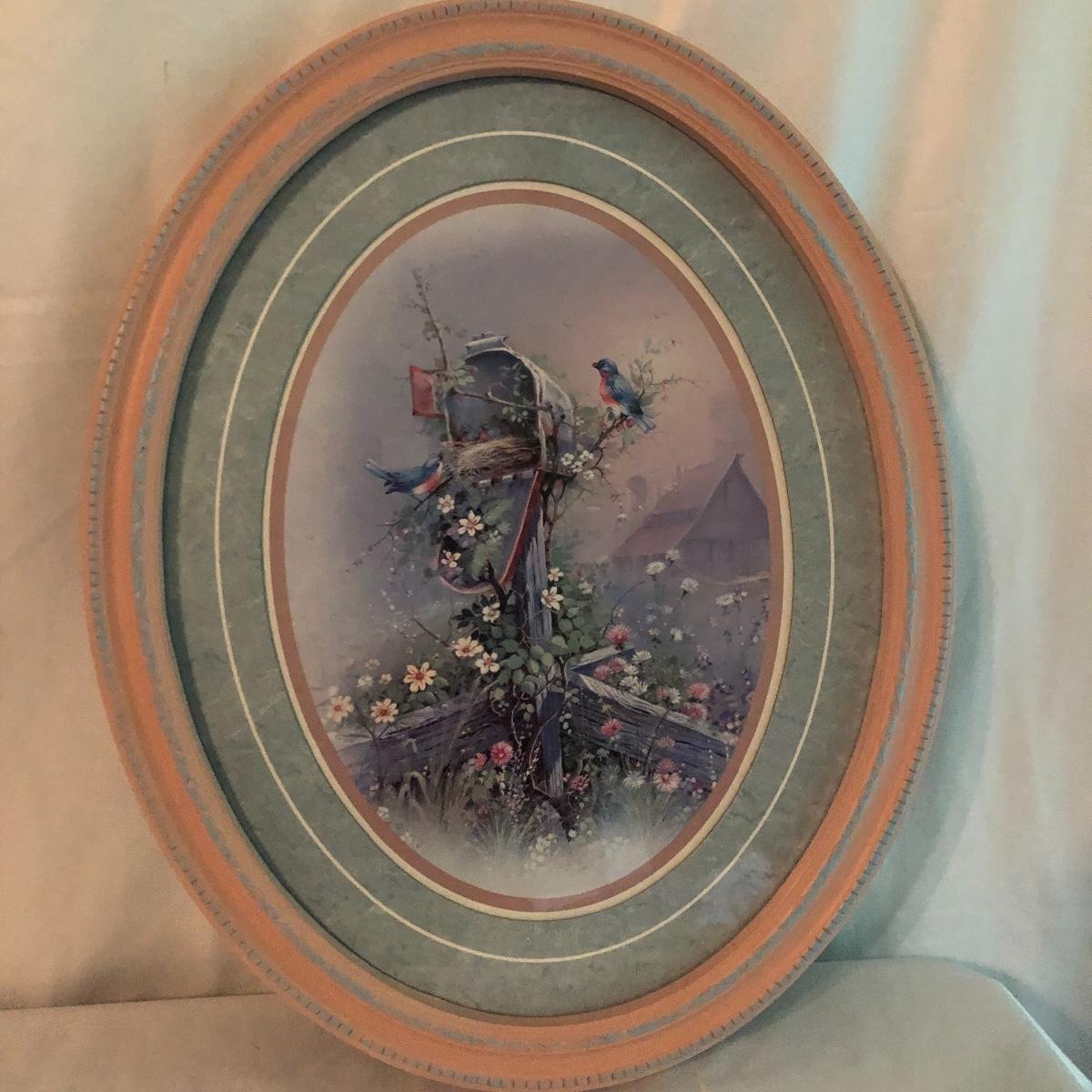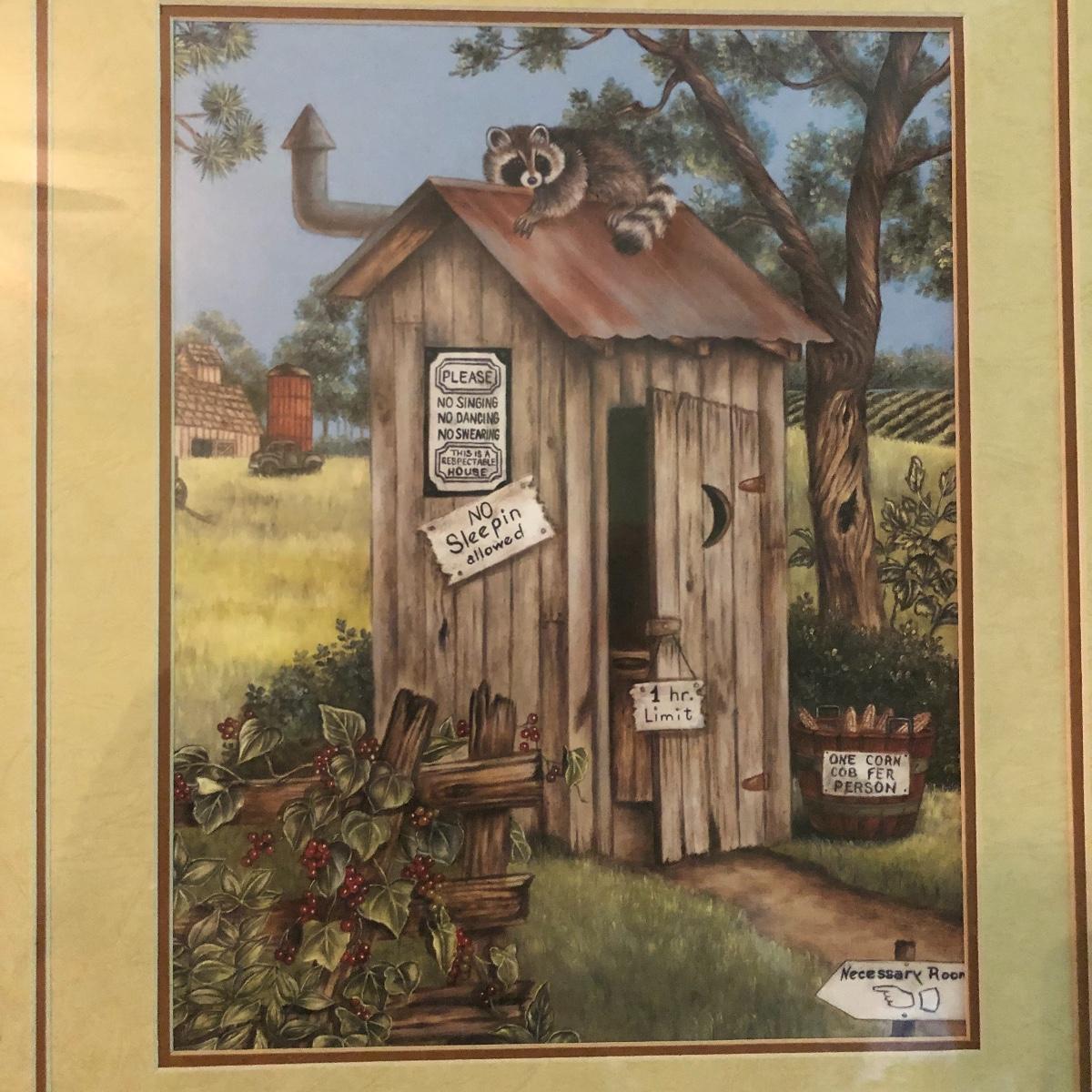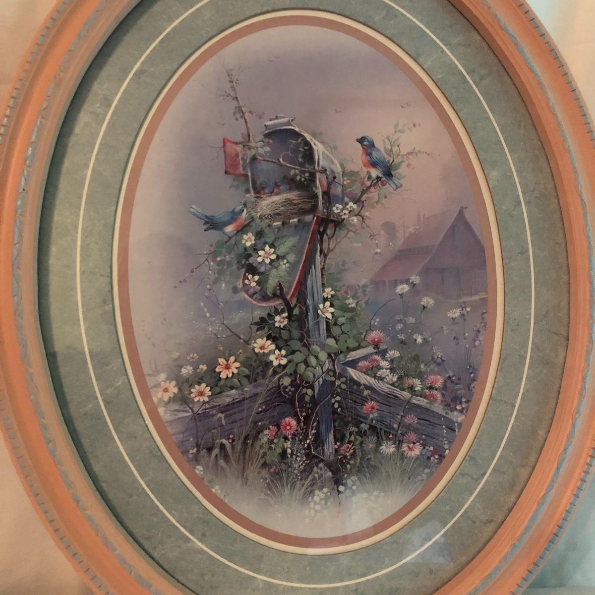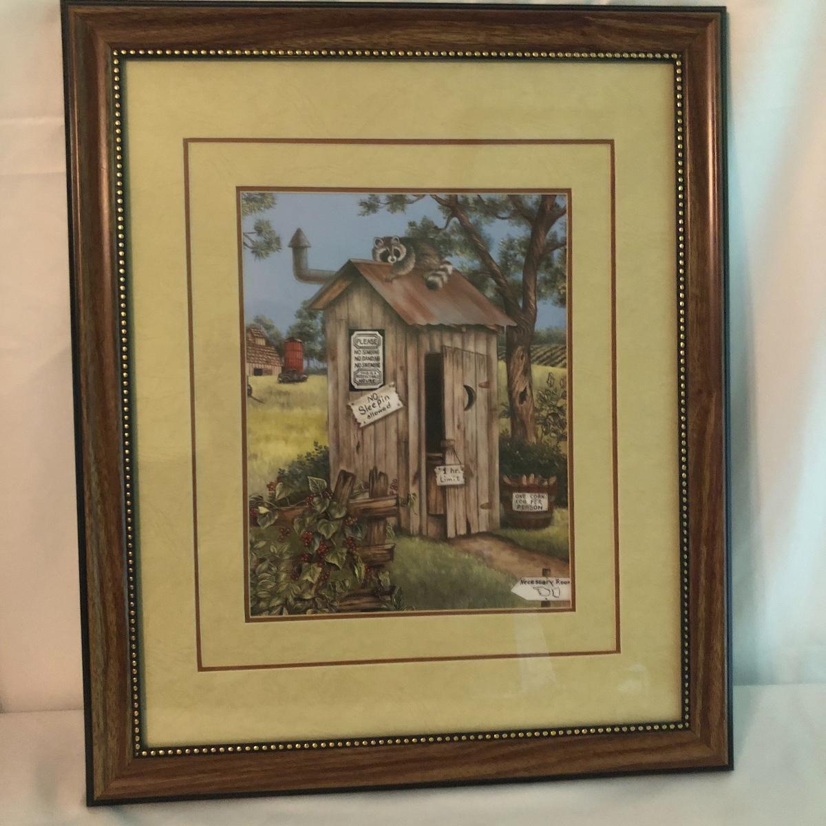 Lot includes two identical wooden framed and matted prints of a bird nest in a mailbox, a oval plastic framed bird with nest in a mailbox. Also includes two plastic framed and matted privy artwork with two small privies made from wood. Largest frame measures 17” x 20”.