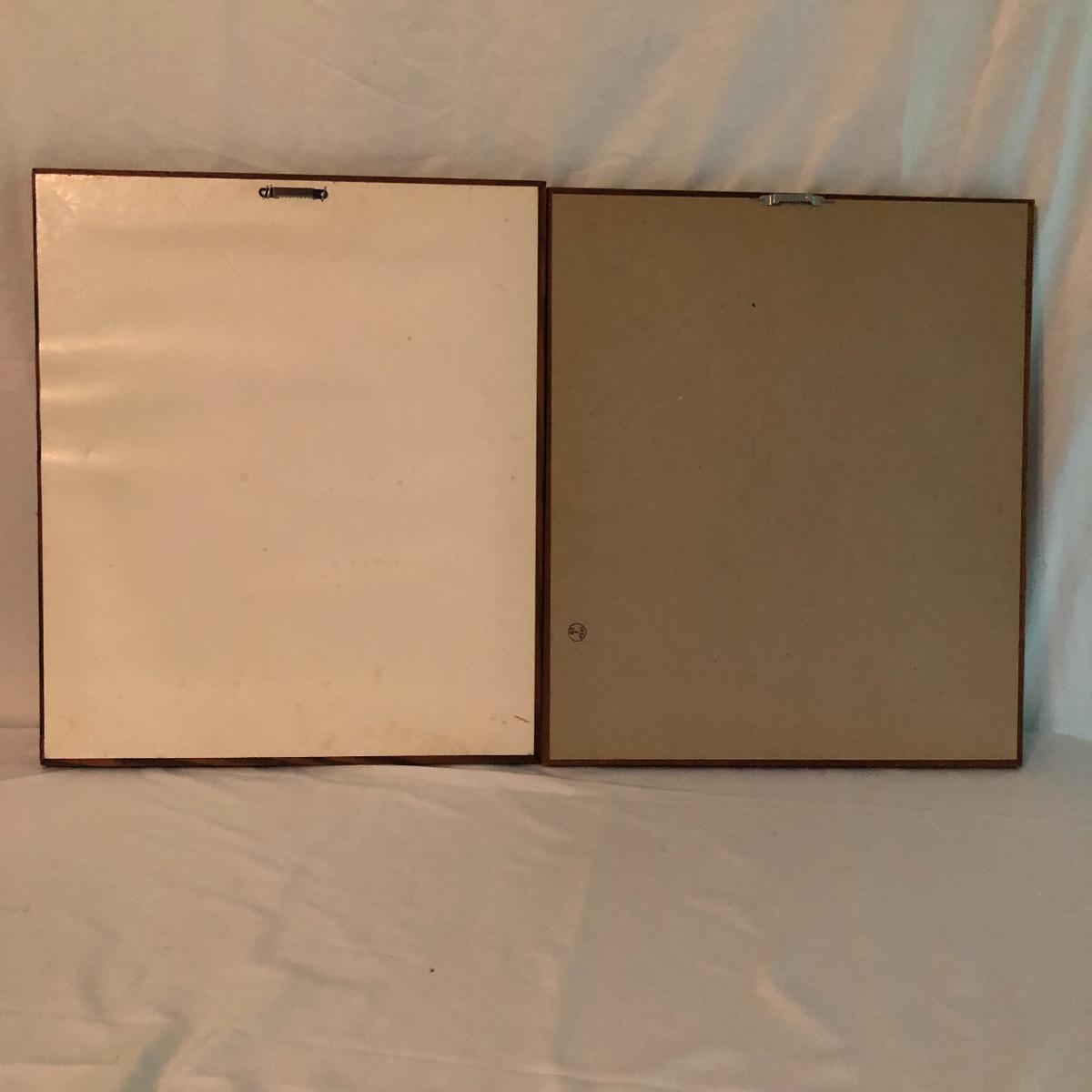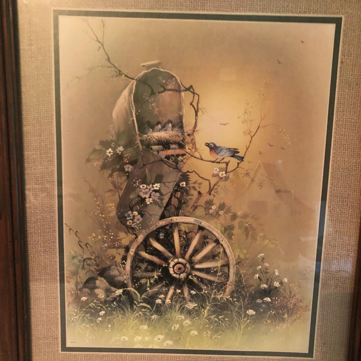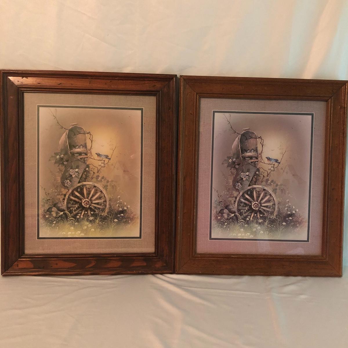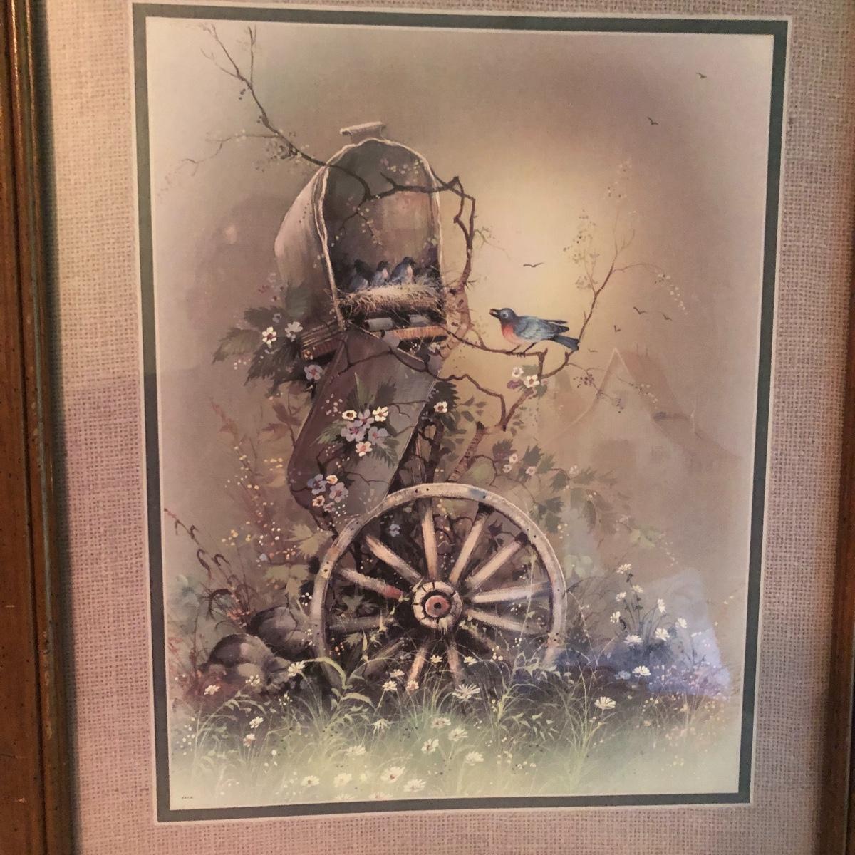 Lot includes two identical wooden framed and matted prints of a bird nest in a mailbox, a oval plastic framed bird with nest in a mailbox. Also includes two plastic framed and matted privy artwork with two small privies made from wood. Largest frame measures 17” x 20”.