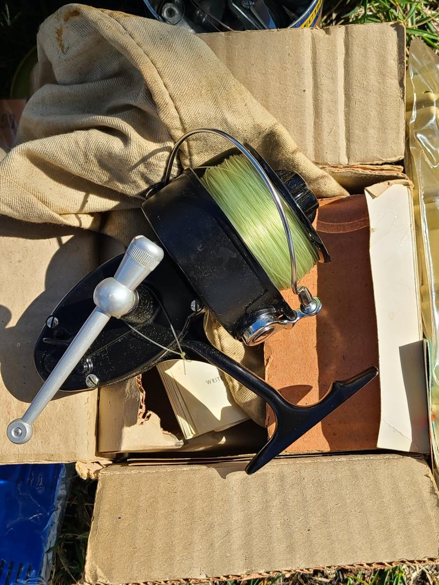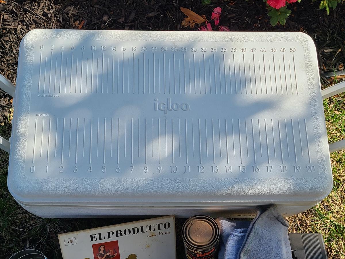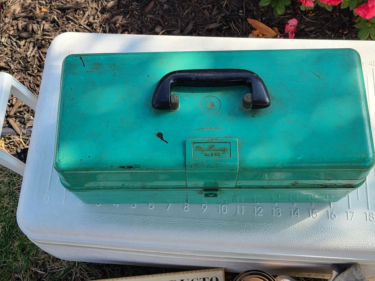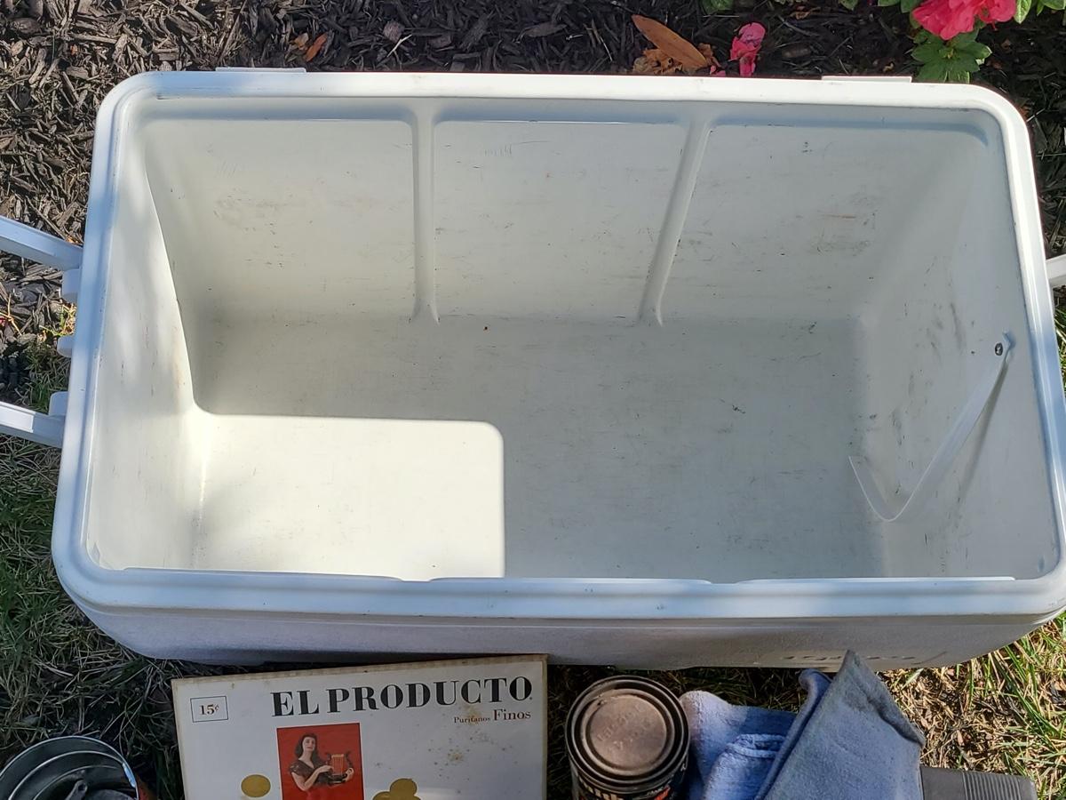 Lot 421: Vintage Fishing Supplies: Igloo Fishing Cooler, New Salt Water Reel and More
