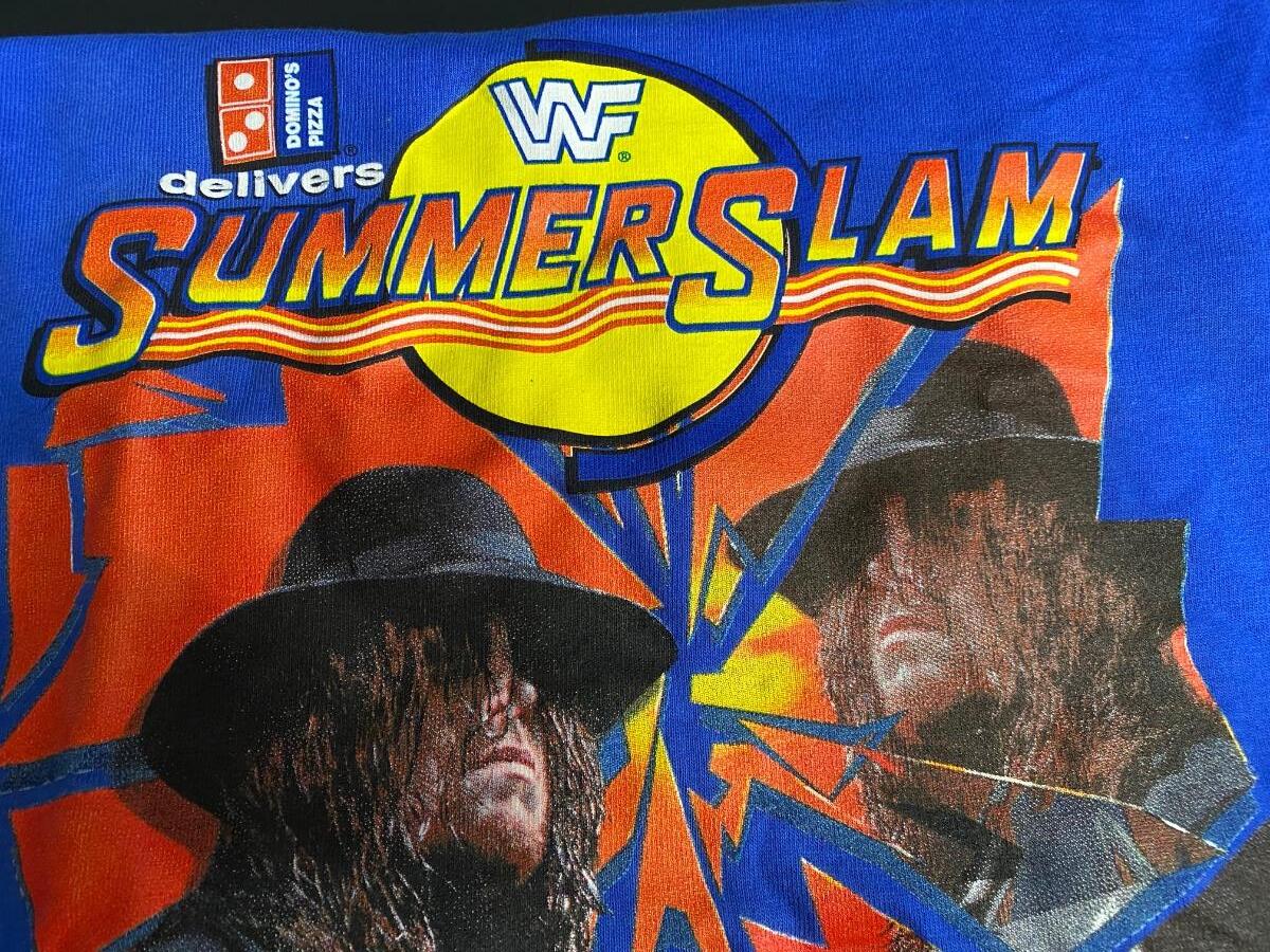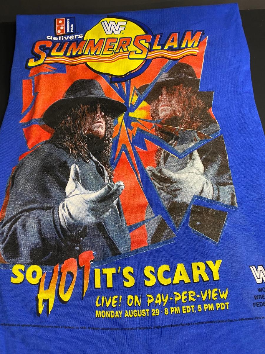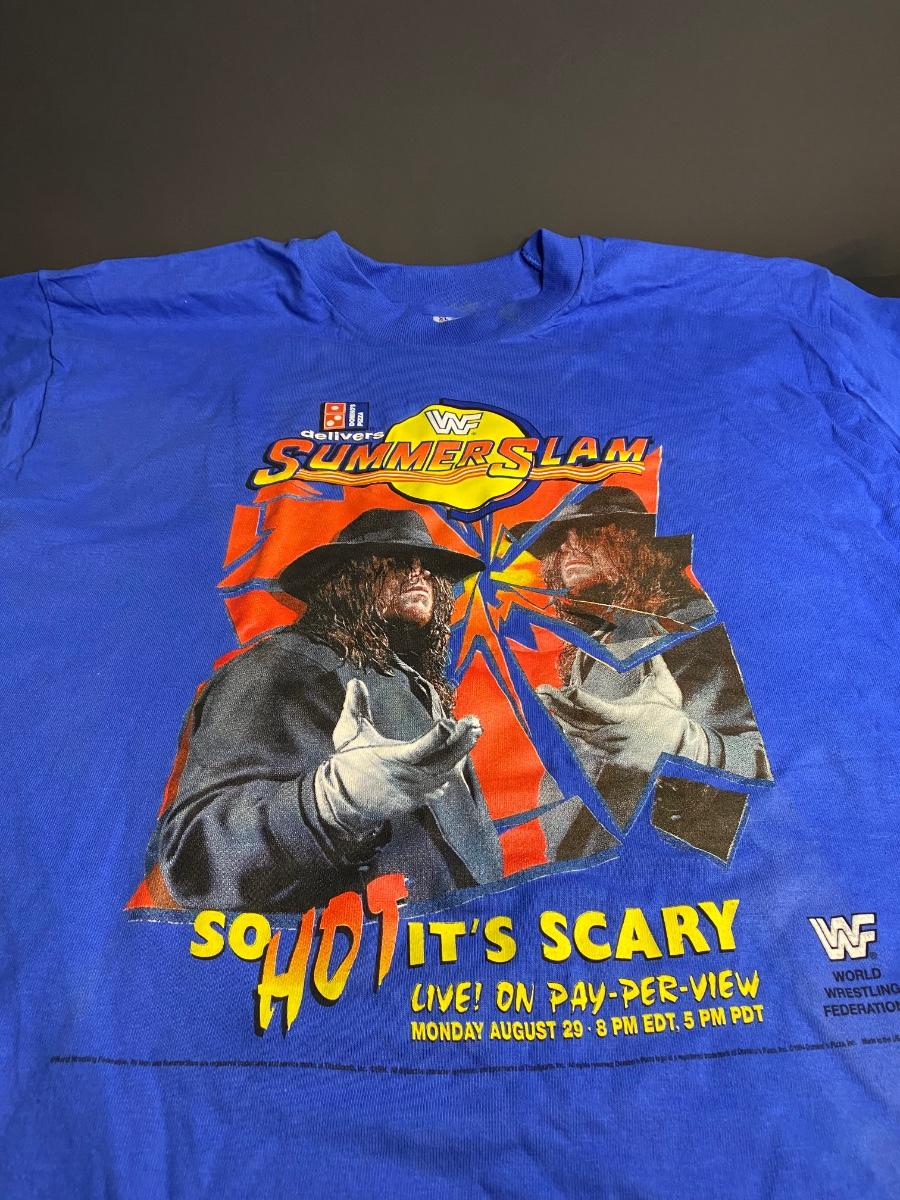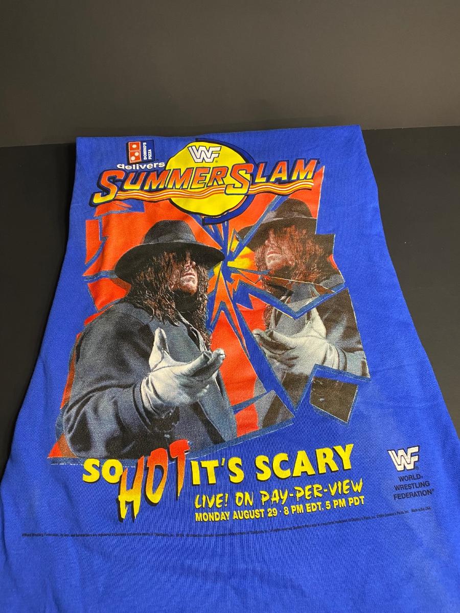 WWF Summer slam pay per view tee shirt. Please see all pictures as they are the best representation of the items. The pictures show condition, measurements if taken, and what is included in the lot. Due to the large amount that we photograph and the time frame, we are not always able to take measurements. All items unless noted, are pre-owned and have been used. If you purchased furniture, you must bring help. We do not allow one person to carry large furniture out on their own. Any damage to the walls, floors, or property is the buyers responsibility to fix, and the damage will be noted and you will charged for repairs, your bidding constitutes your understanding of these terms. Bring help, tools and a truck for the safety of our client’s homes, and your personal safety. Company policy. Thank you.