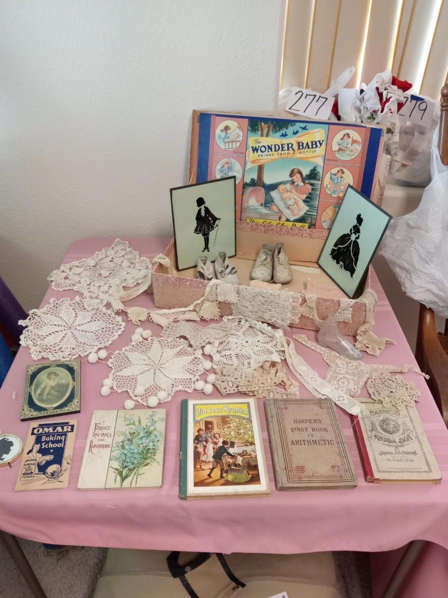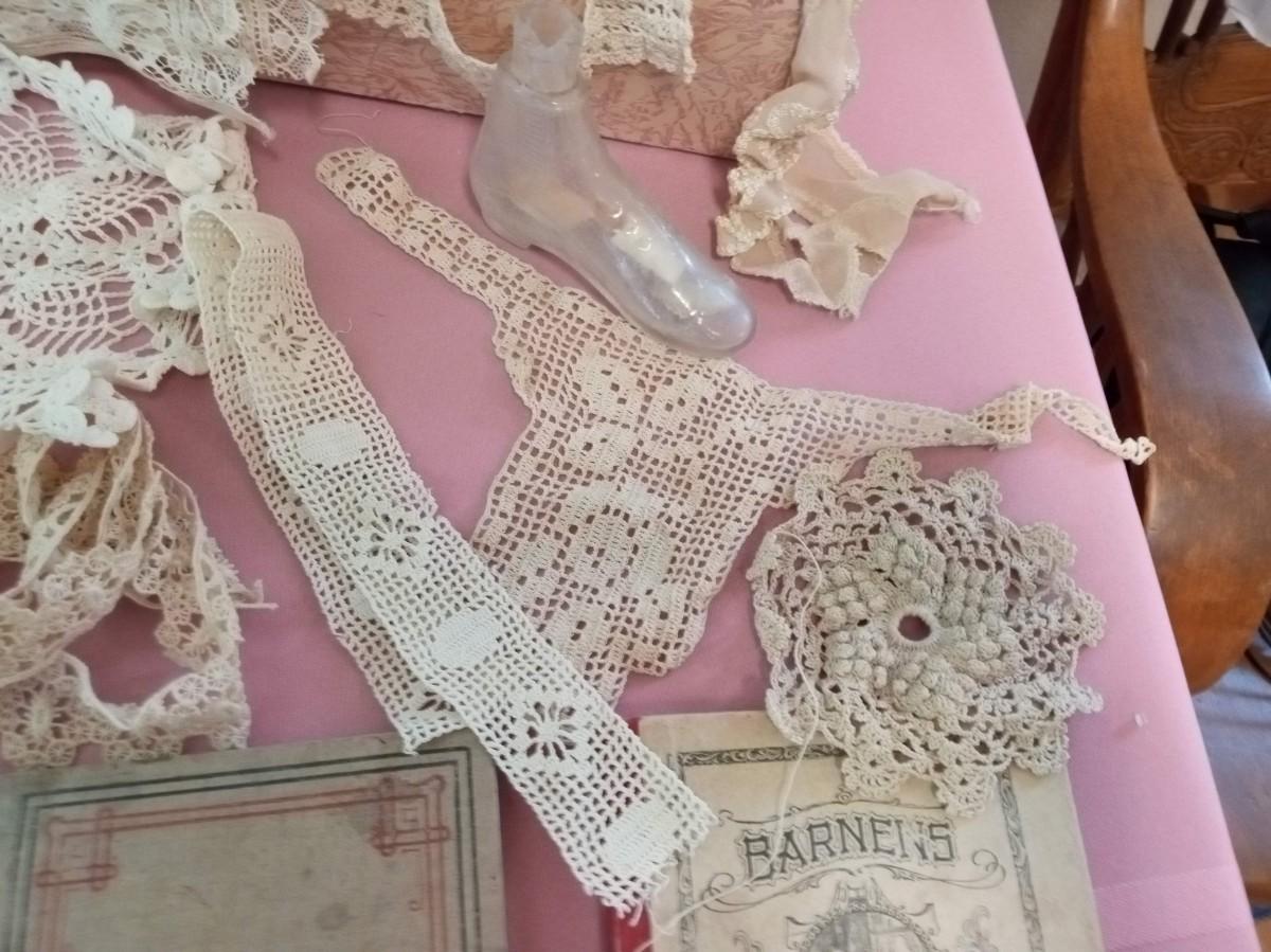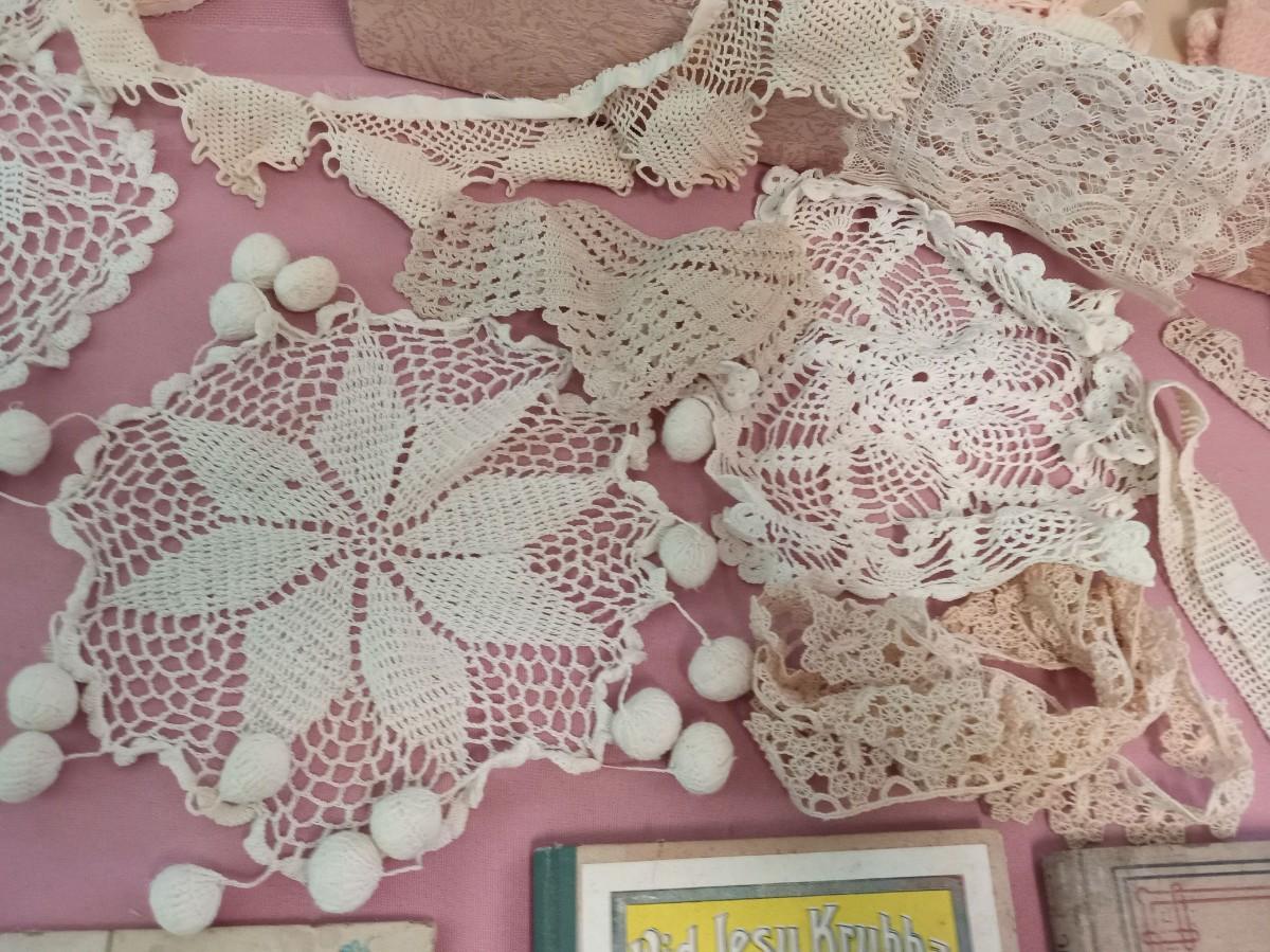LOT 422 HANDMADE VINTAGE DOILIES AND LACE, SILHOUETTES, OLD BOOKS AND MORE