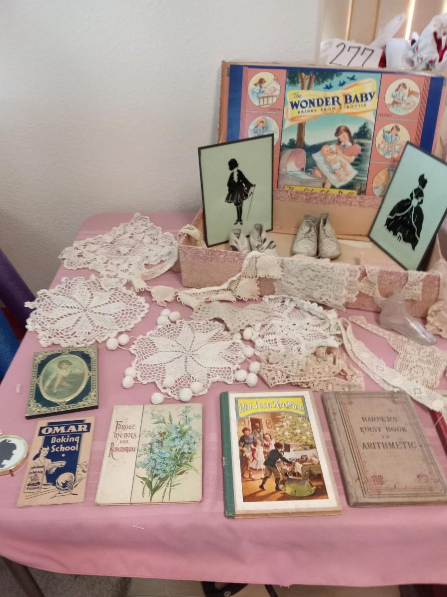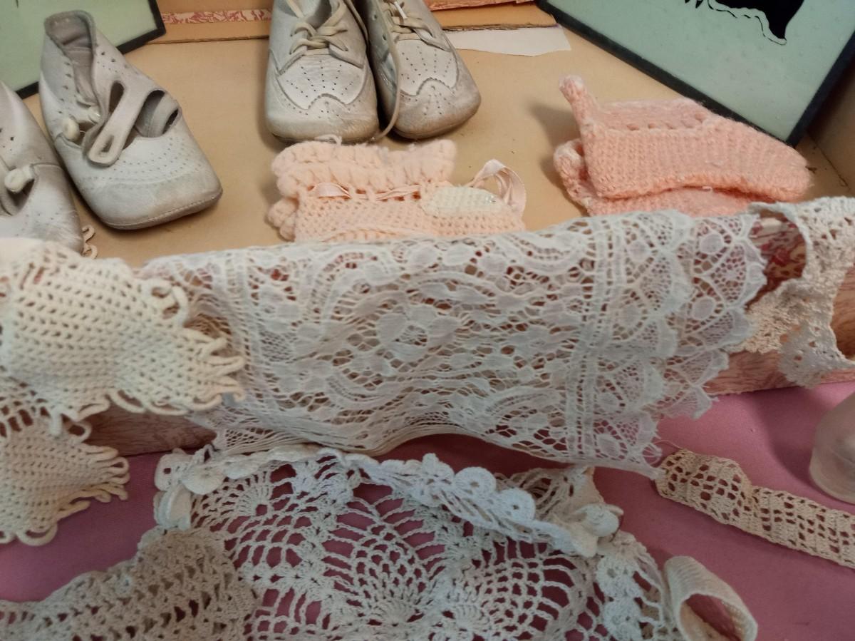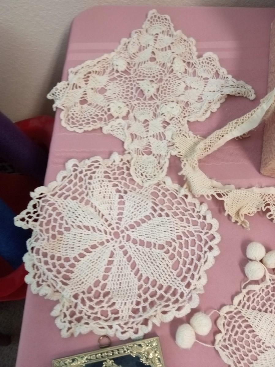 LOT 422 HANDMADE VINTAGE DOILIES AND LACE, SILHOUETTES, OLD BOOKS AND MORE