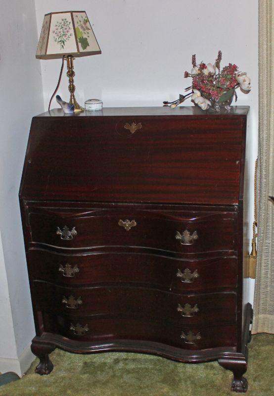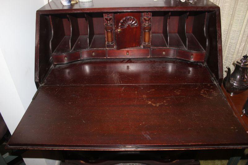 A sweet drop front desk. There are many surface scratches and some marks (see photos). Made by Skandia furniture. 32" wide x 17" deep x 41" high