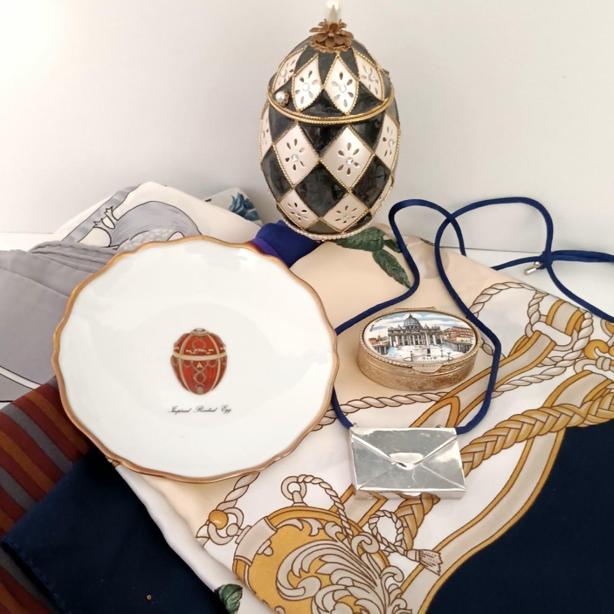 LOT 423: Faberge Miniature Plate, Rodolfo Roma Scarf, Berkshire Scarf, Charlie Solid Perfume Envelope Charm & More