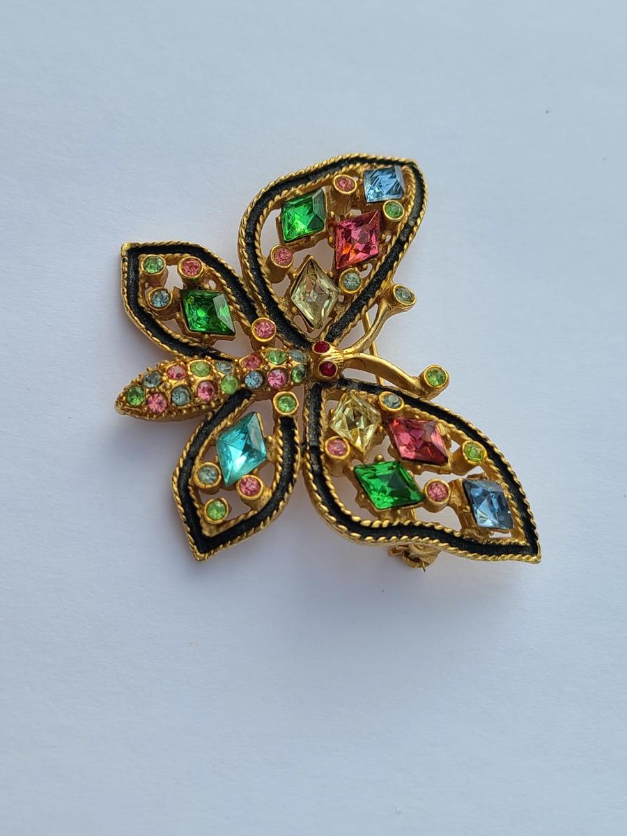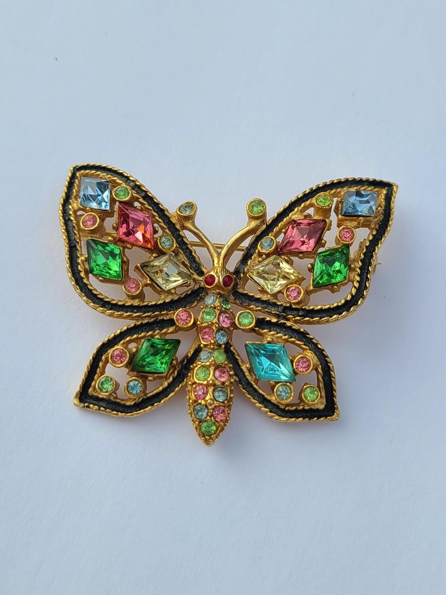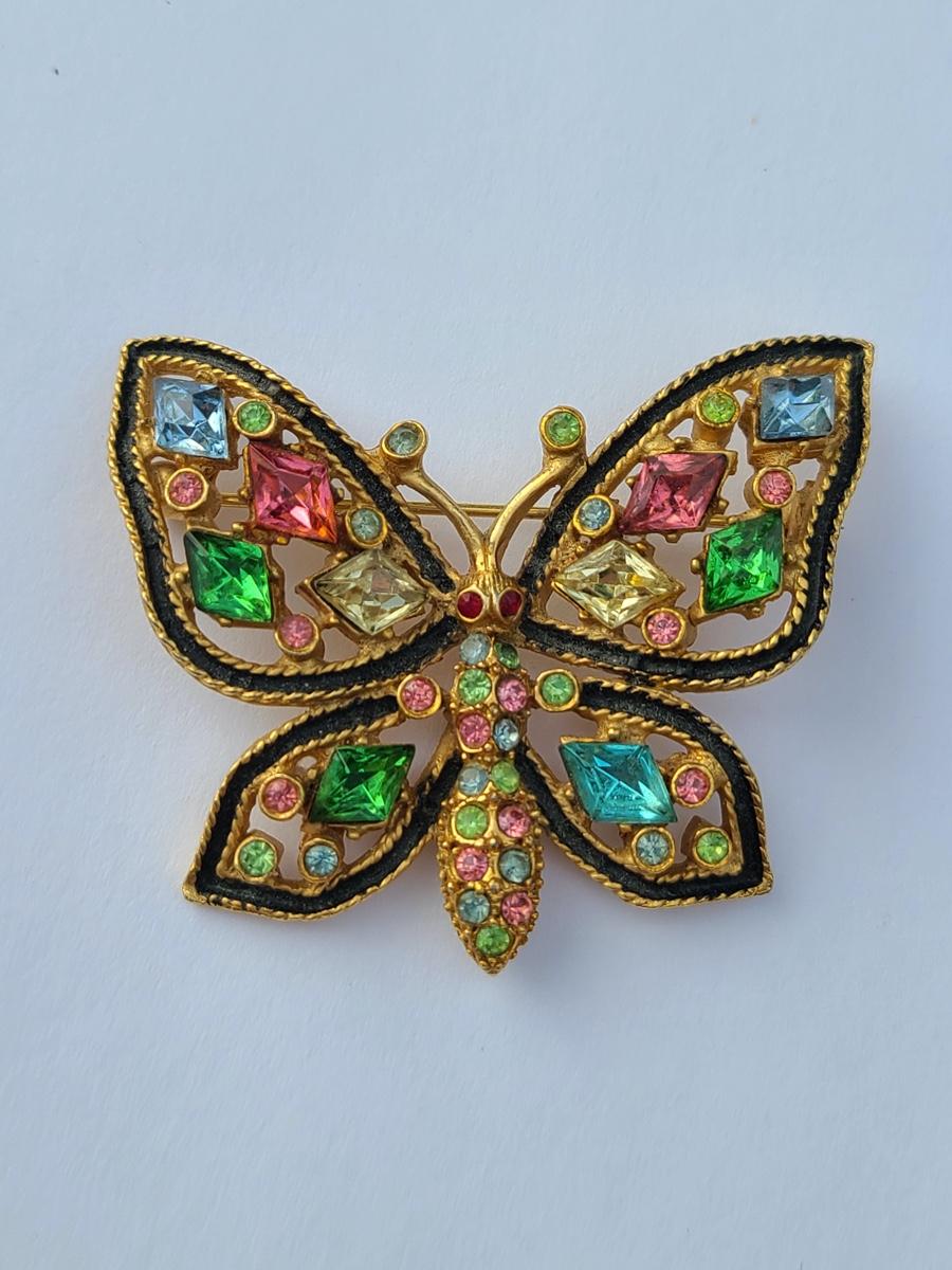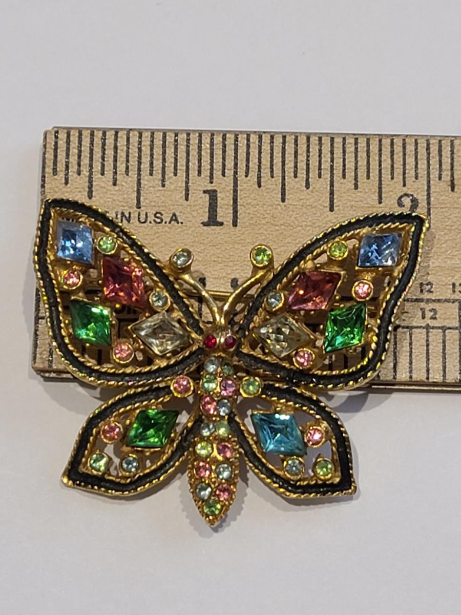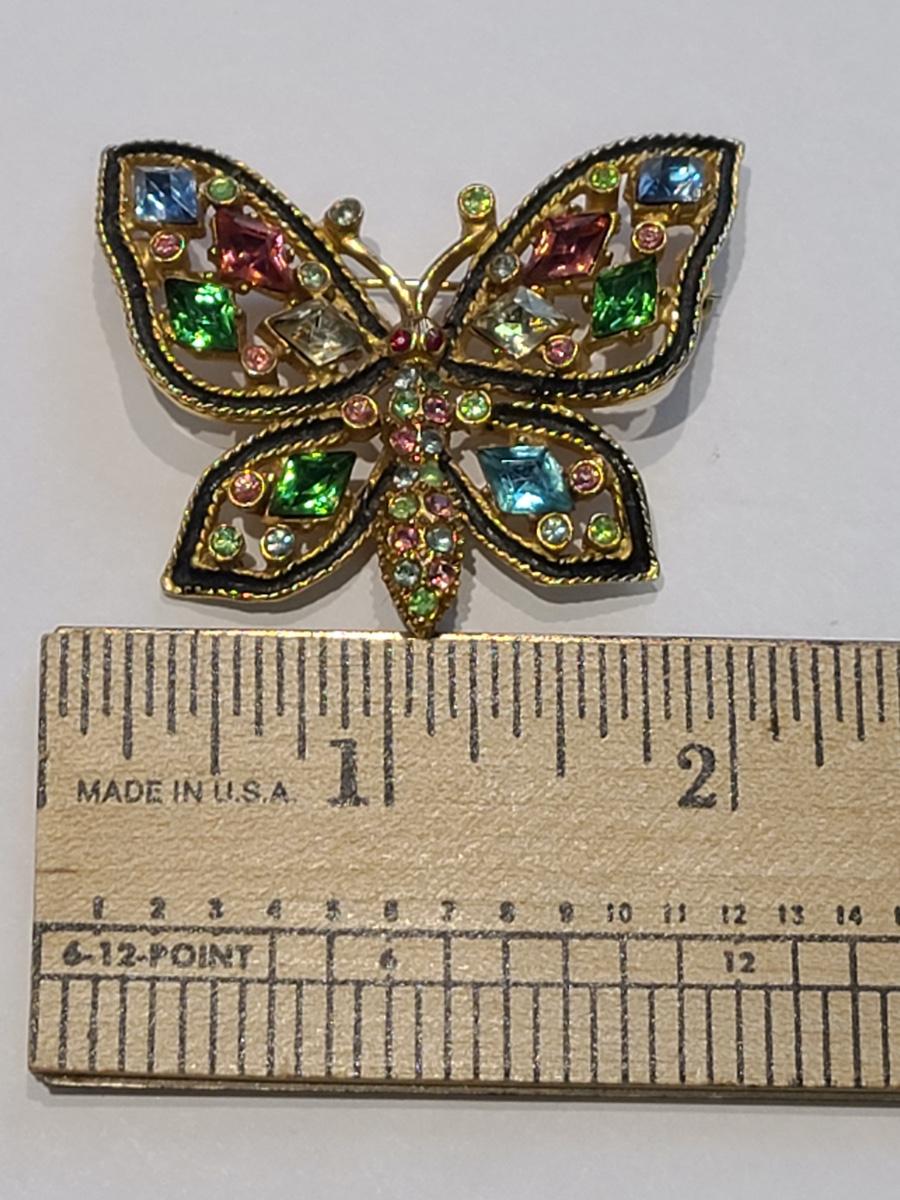 This is a piece of art. The detail work is amazing, from the antenna, to the red eyes, black framed wings, to the multi-color stones that shine in the light! This is a statement piece, and the butterflies are one of the most desirable of the Weiss pieces! The perfect accent to a hat, handbag, jean jacket, suit or little black dress! This piece is sure to get compliments! Please see all pictures as they are the best representation of the items. The pictures show condition, measurements if taken, and what is included in the lot. Due to the large amount that we photograph and the time frame, we are not always able to take measurements. All items unless noted, are pre-owned and have been used. If you purchased furniture, you must bring help. We do not allow one person to carry large furniture out on their own. Bring help, tools and a truck for the safety of our client’s homes, and your personal safety. Company policy. Thank you.