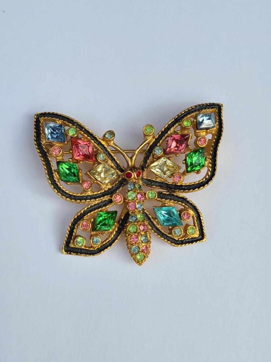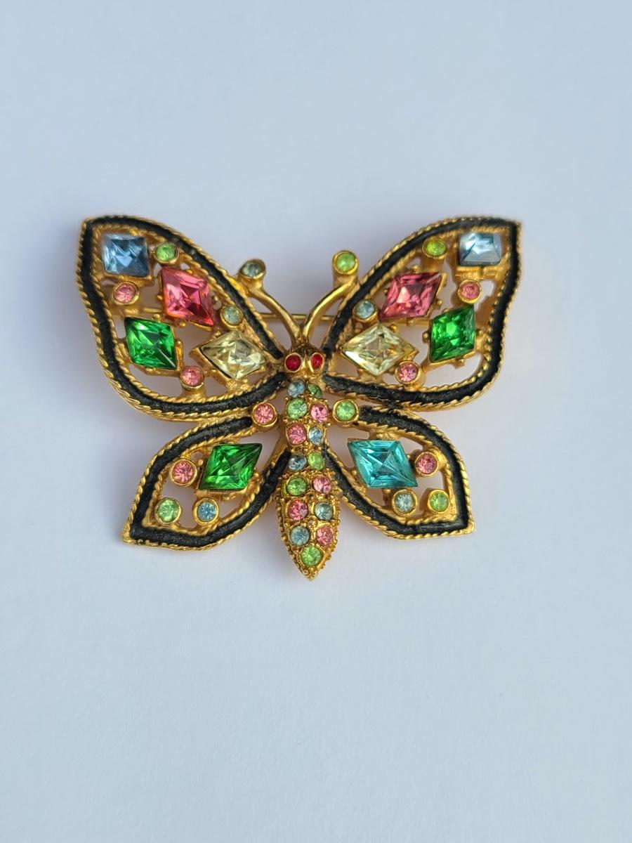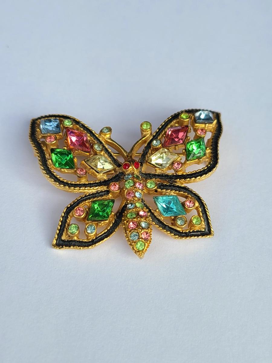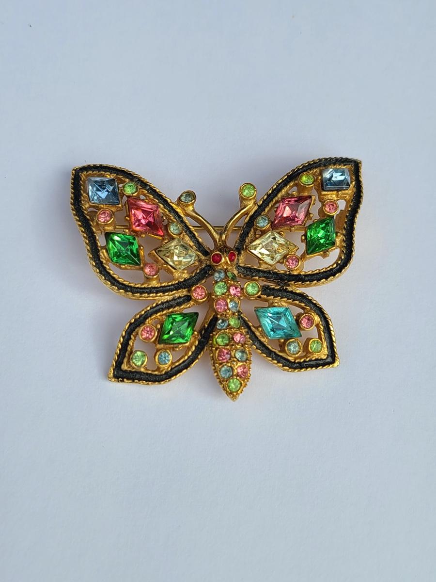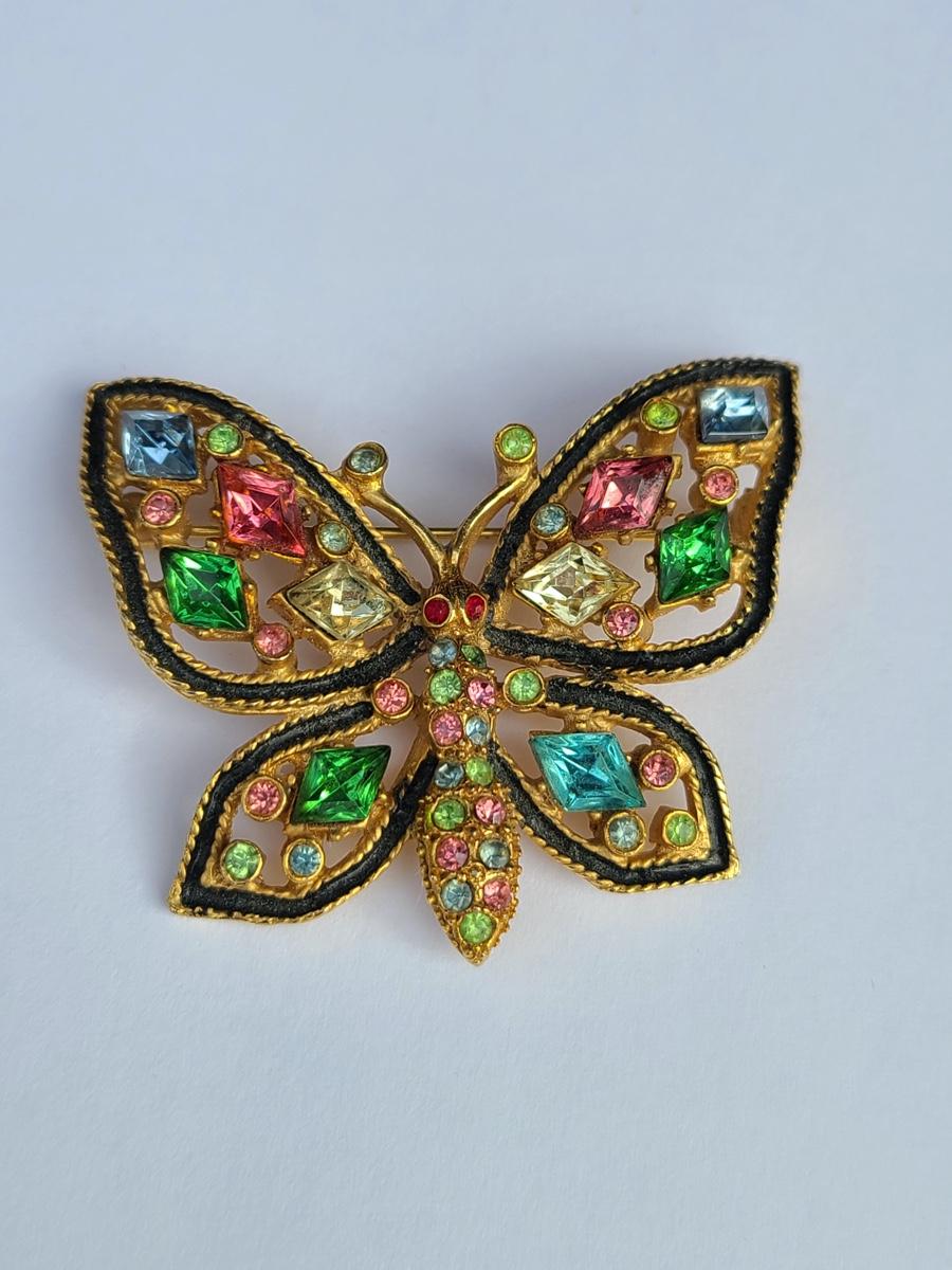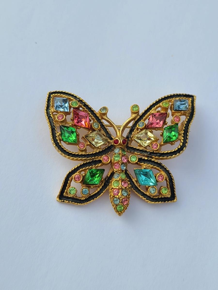 This is a piece of art. The detail work is amazing, from the antenna, to the red eyes, black framed wings, to the multi-color stones that shine in the light! This is a statement piece, and the butterflies are one of the most desirable of the Weiss pieces! The perfect accent to a hat, handbag, jean jacket, suit or little black dress! This piece is sure to get compliments! Please see all pictures as they are the best representation of the items. The pictures show condition, measurements if taken, and what is included in the lot. Due to the large amount that we photograph and the time frame, we are not always able to take measurements. All items unless noted, are pre-owned and have been used. If you purchased furniture, you must bring help. We do not allow one person to carry large furniture out on their own. Bring help, tools and a truck for the safety of our client’s homes, and your personal safety. Company policy. Thank you.