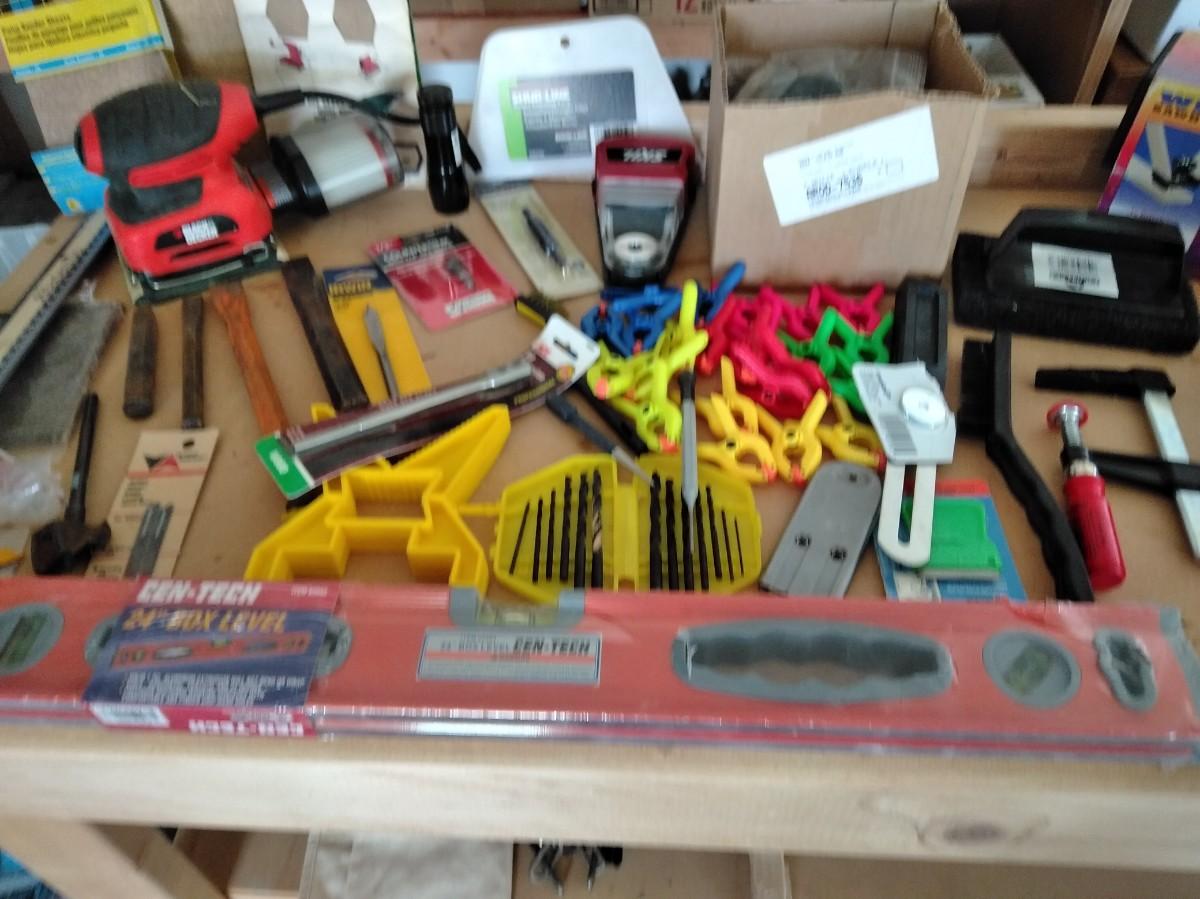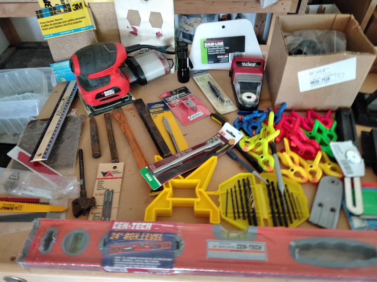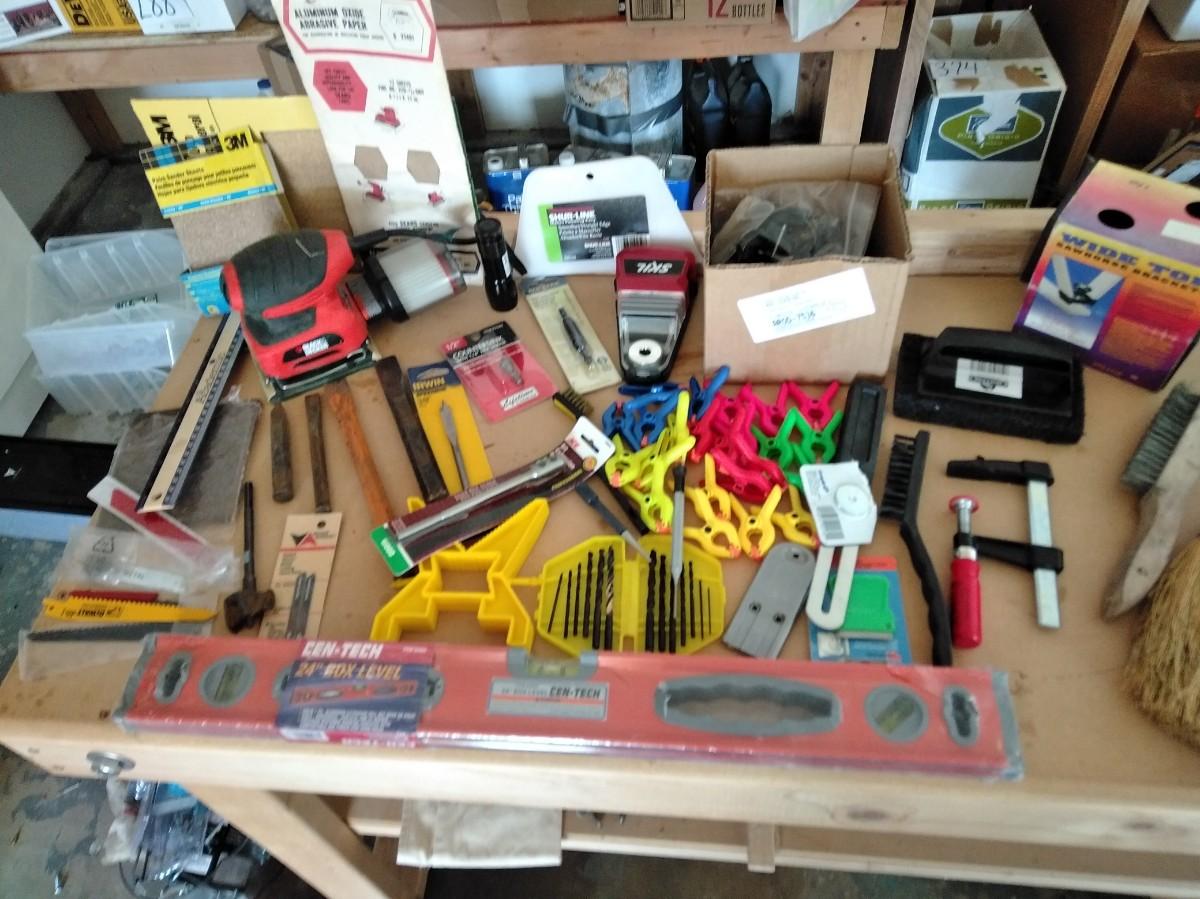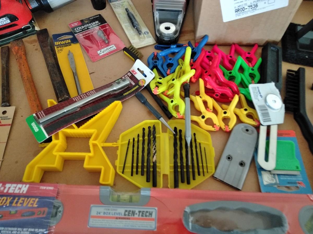ASSORTMENT OF WOODWORKING TOOLS AND ACCESSORIES INCLUDING CLAMPS, SANDER, SANDPAPER, CHISELS, BITS, LEVEL AND MORE