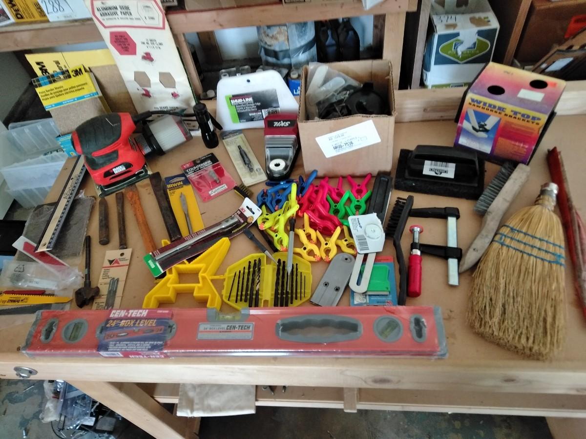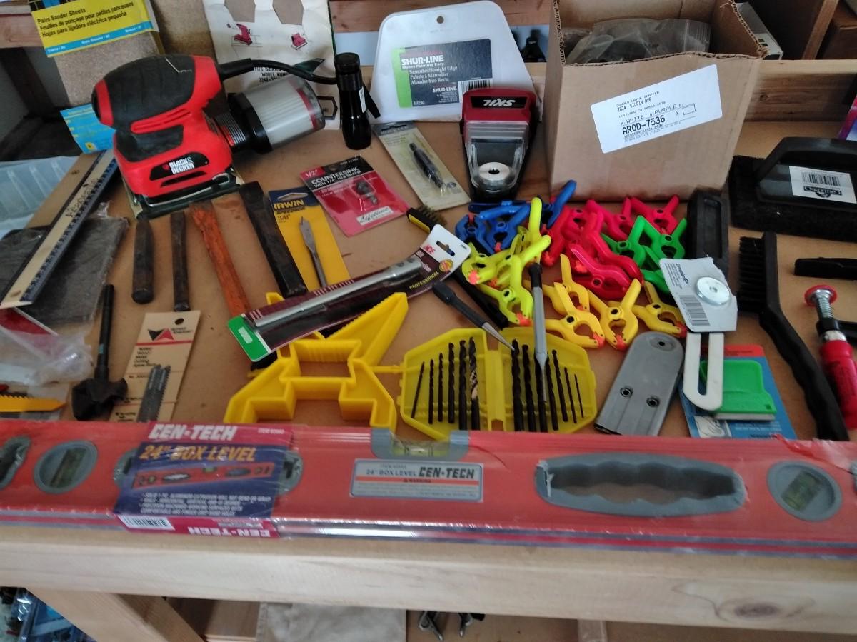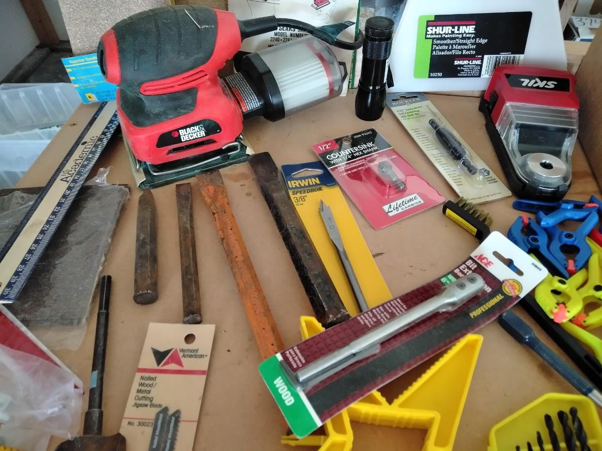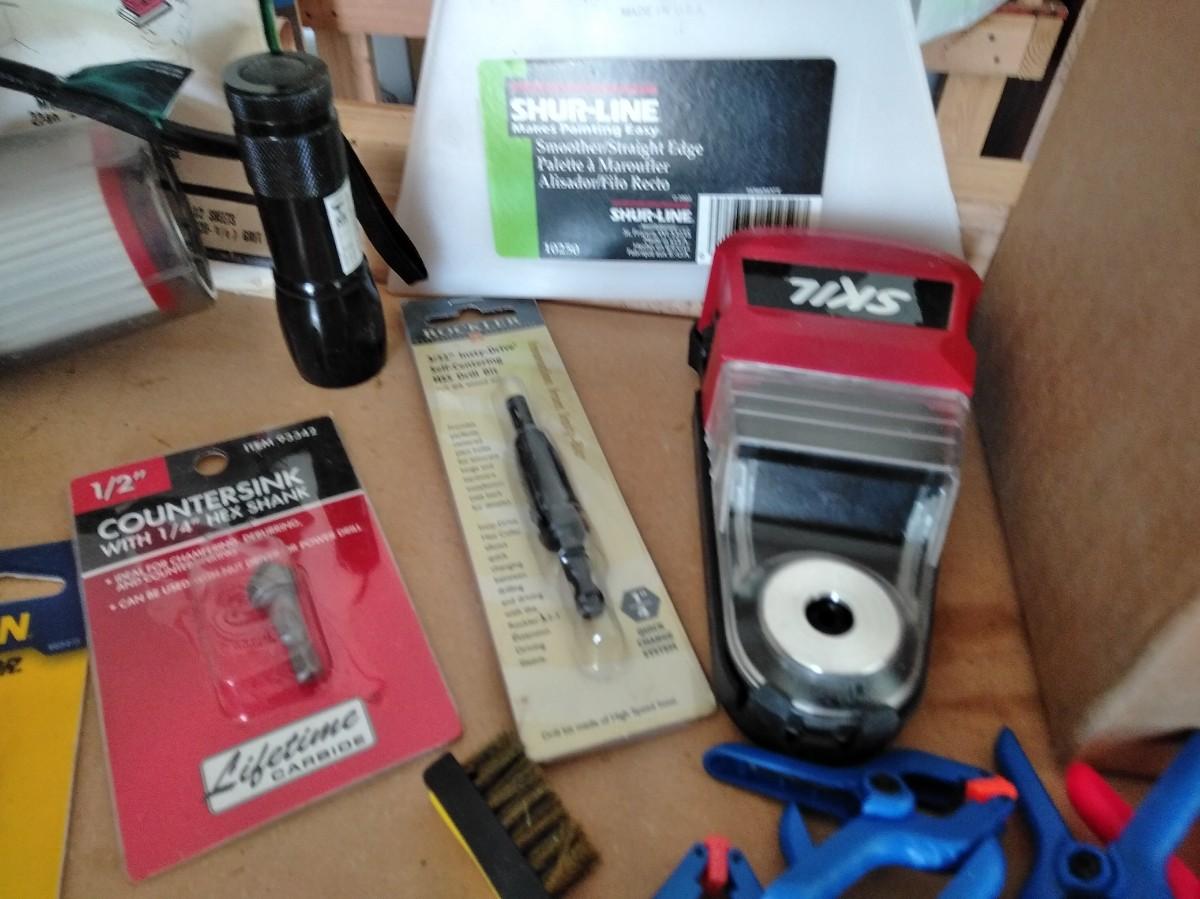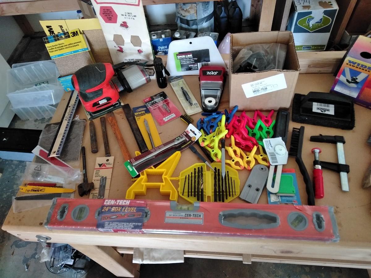 ASSORTMENT OF WOODWORKING TOOLS AND ACCESSORIES INCLUDING CLAMPS, SANDER, SANDPAPER, CHISELS, BITS, LEVEL AND MORE