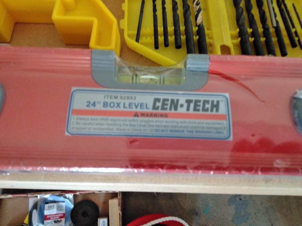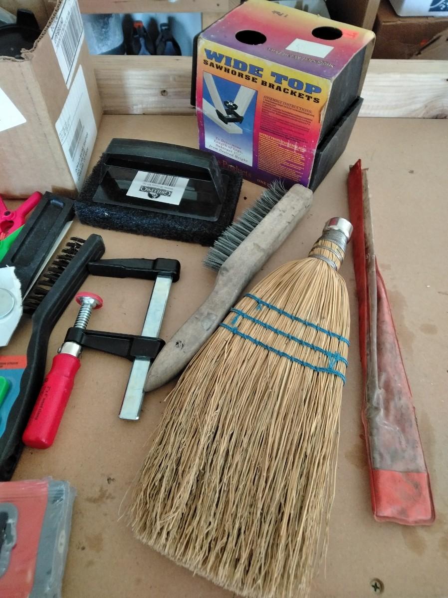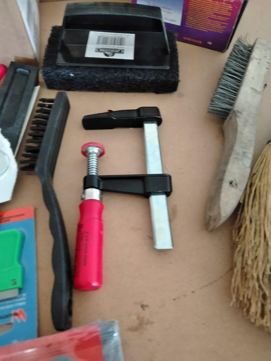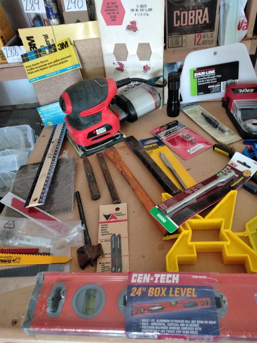ASSORTMENT OF WOODWORKING TOOLS AND ACCESSORIES INCLUDING CLAMPS, SANDER, SANDPAPER, CHISELS, BITS, LEVEL AND MORE