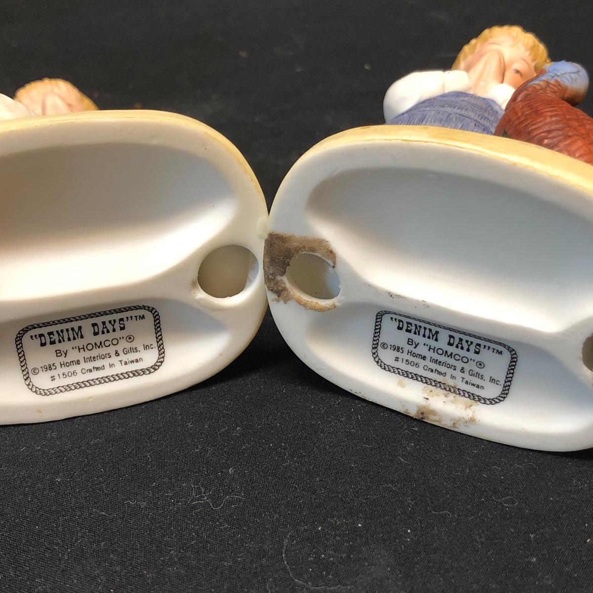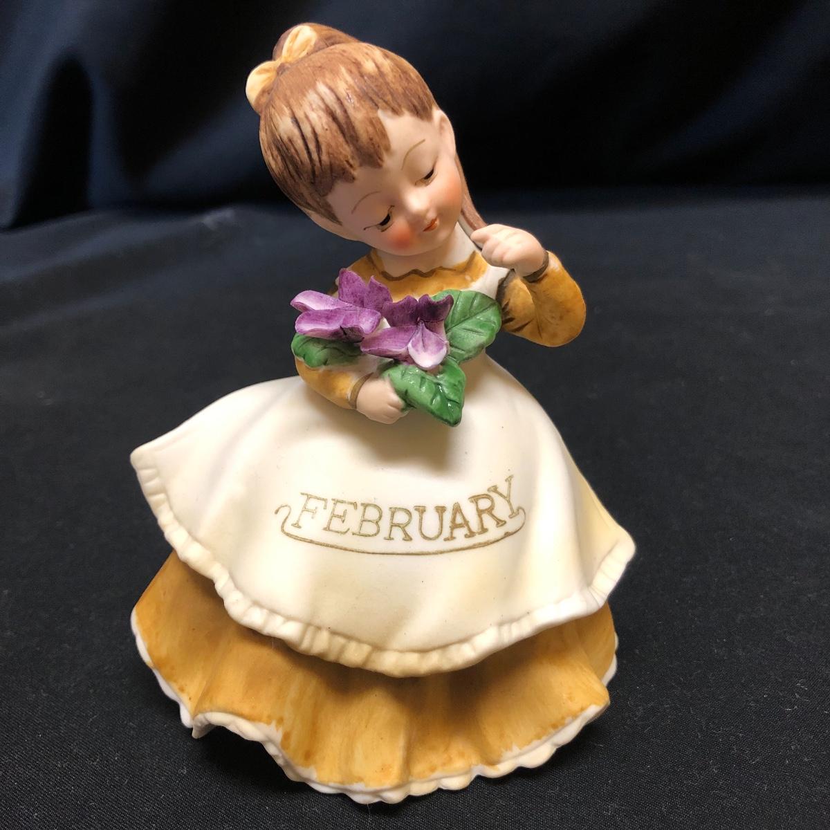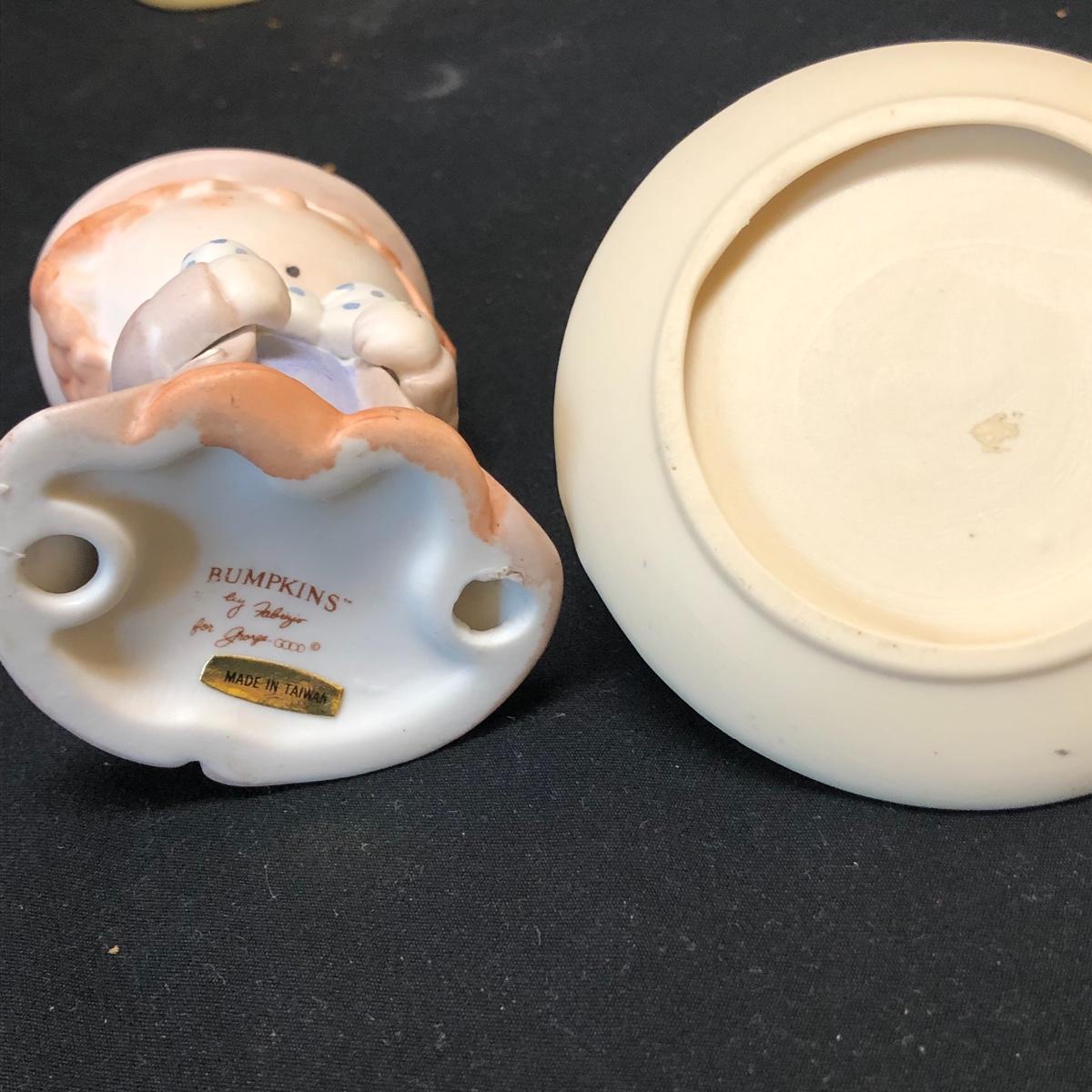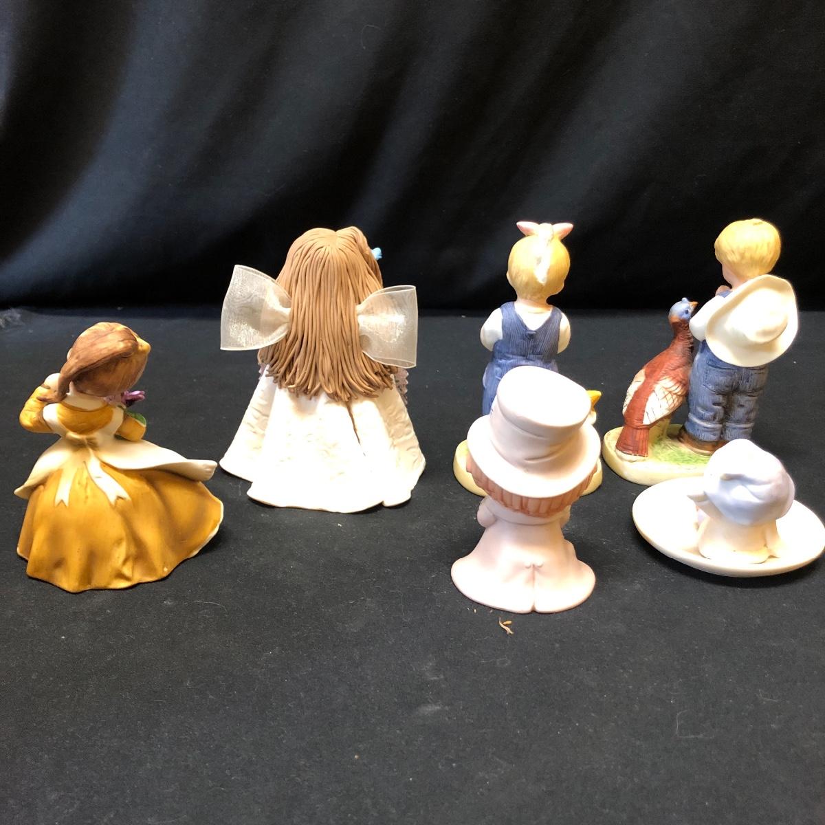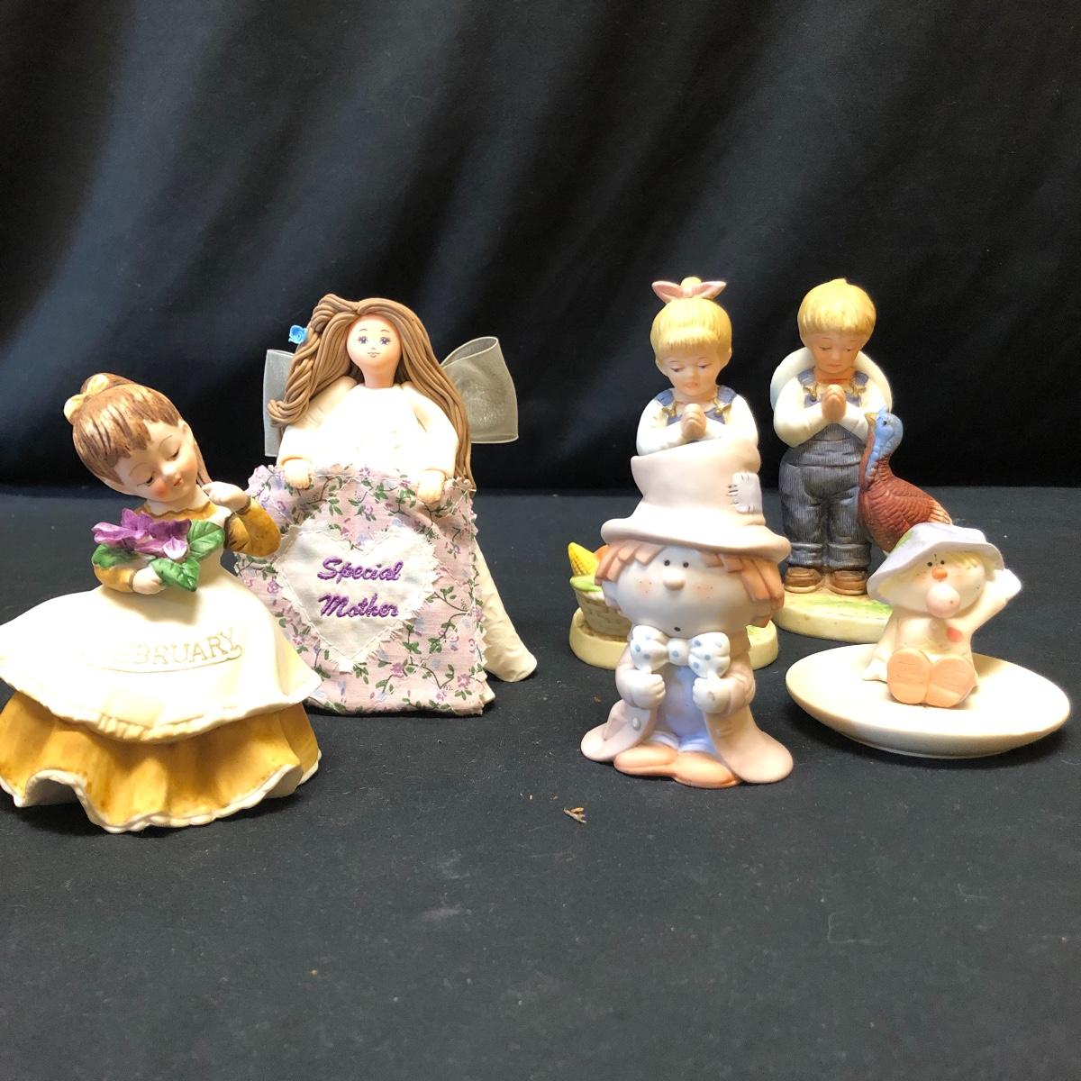 A total of 6 precious figurines for you here that includes the February girl from Lefton China with the Series number 4200. Also included are two Bumpkins, one Kneeded Angels (this is made out of plastic, all the rest are ceramic) and two Denim Days by Homco.
