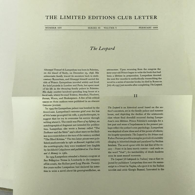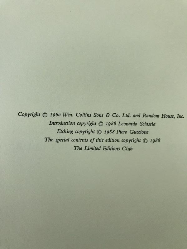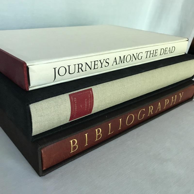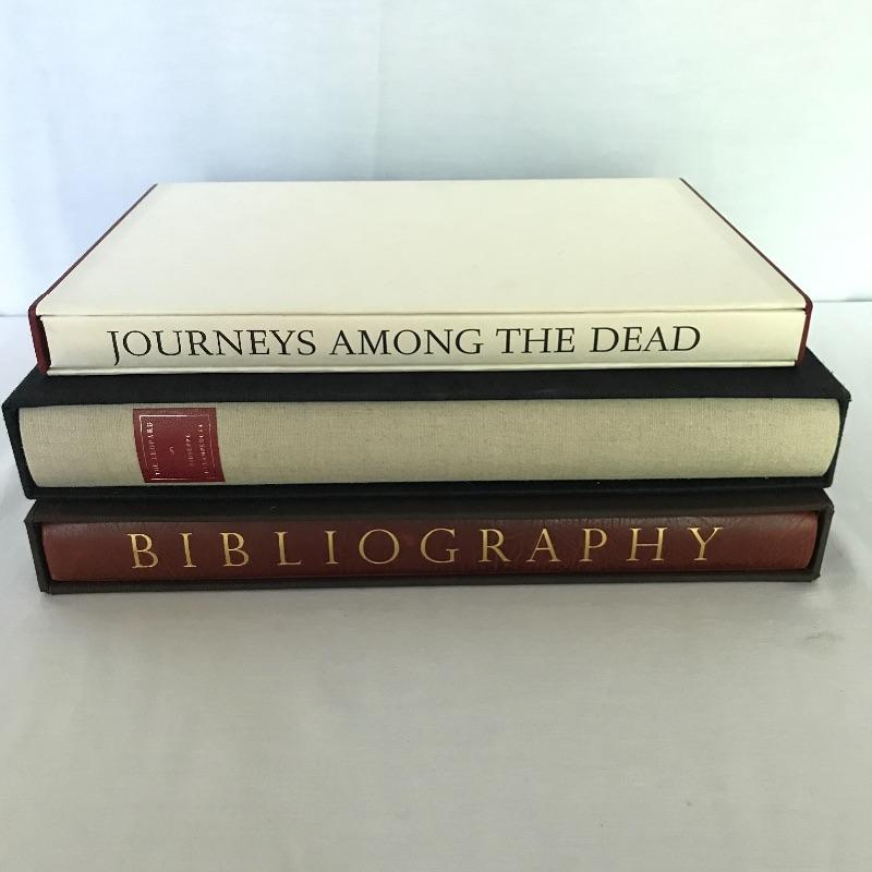 Three collectible books published by The Limited Editions Club. Titles include Journeys Among The Dead (13.5” x9”) which is a play with lithographs by Eugene Ionesco. This is a softcover book with a hardcover sleeve that has leather accents. The sleeve has a few marks but in great condition. Book is also in great condition. Second book is called The Leopard by Giuseppe Di Lampedusa with etchings by Piero Guccione. (14.5” x 10.5”) Sleeve has tiny lift on one corner that could easily be glued. Otherwise book and sleeve are in great condition. And lastly a leather spine Bibliography book (14” x 10”) that includes a listing of all books published 1929-1985 by The Limited Editions Club. Enjoy these three books on your table top so you can share with friends. Shipping available.