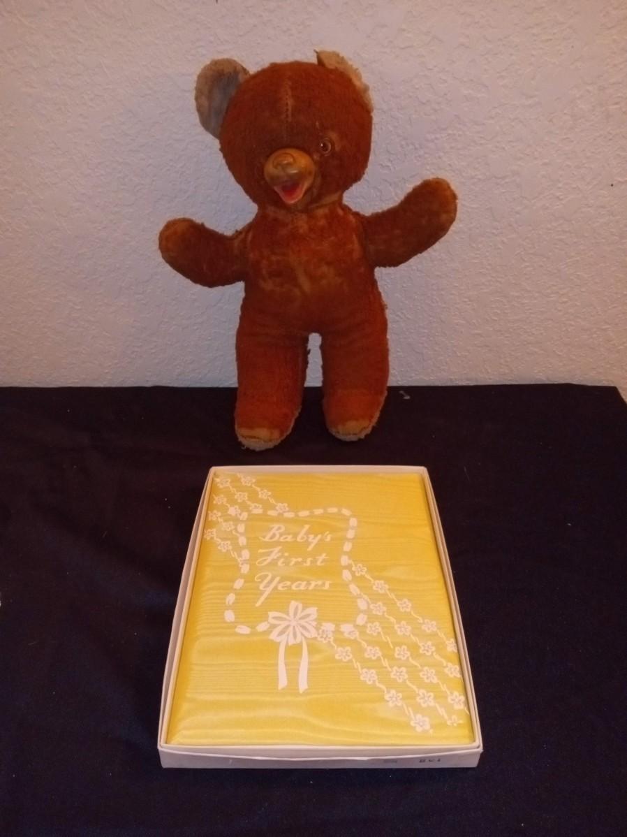 LOT 424  VINTAGE MUCH LOVED TEDDY BEAR AND BABY BOOK  (HD)