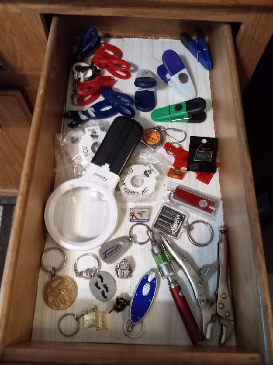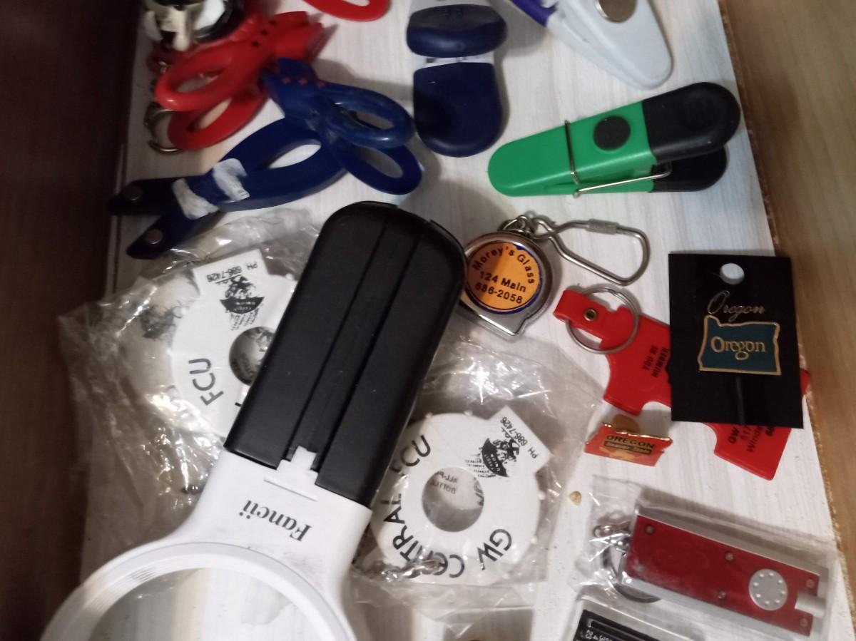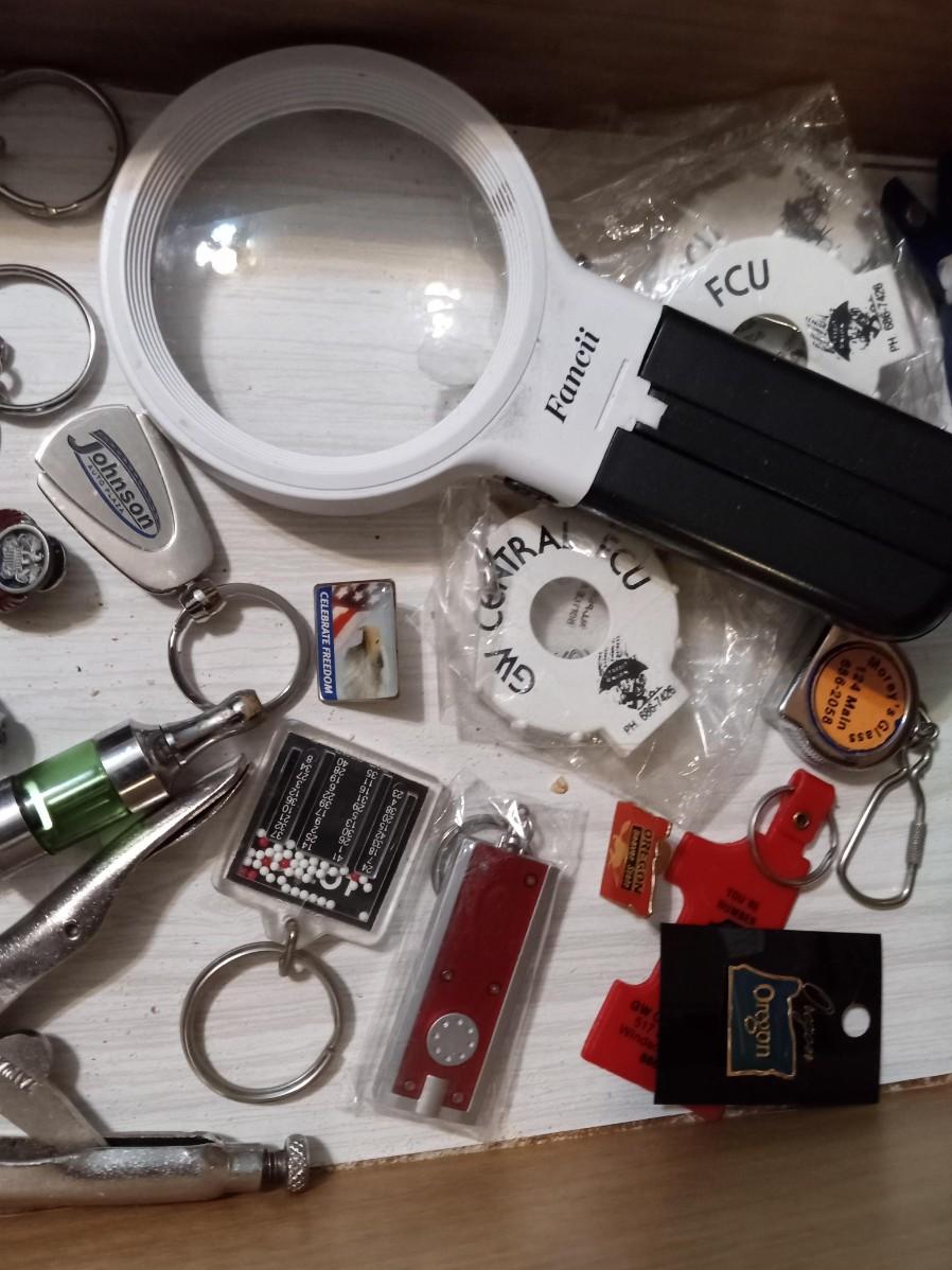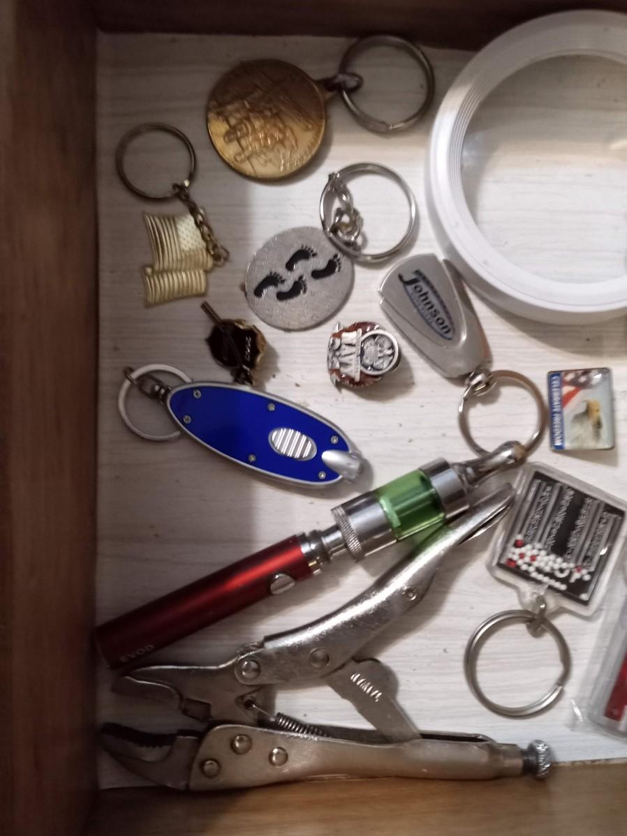 KEYCHAINS, CHIP CLIPS, MONOGRAMMED ZIPPO LIGHTER, VINTAGE MEN'S SUNGLASSES, FLASHLIGHT, LIGHTED GLASSES, MAGNIFYING GLASSES, ALARM CLOCK, BATTERY OPERATED SMALL FAN, TONKA TOY TRUCK THAT HAS SEEN BETTER DAYS, REPURPOSED PIPE INTO A PENCIL HOLDER