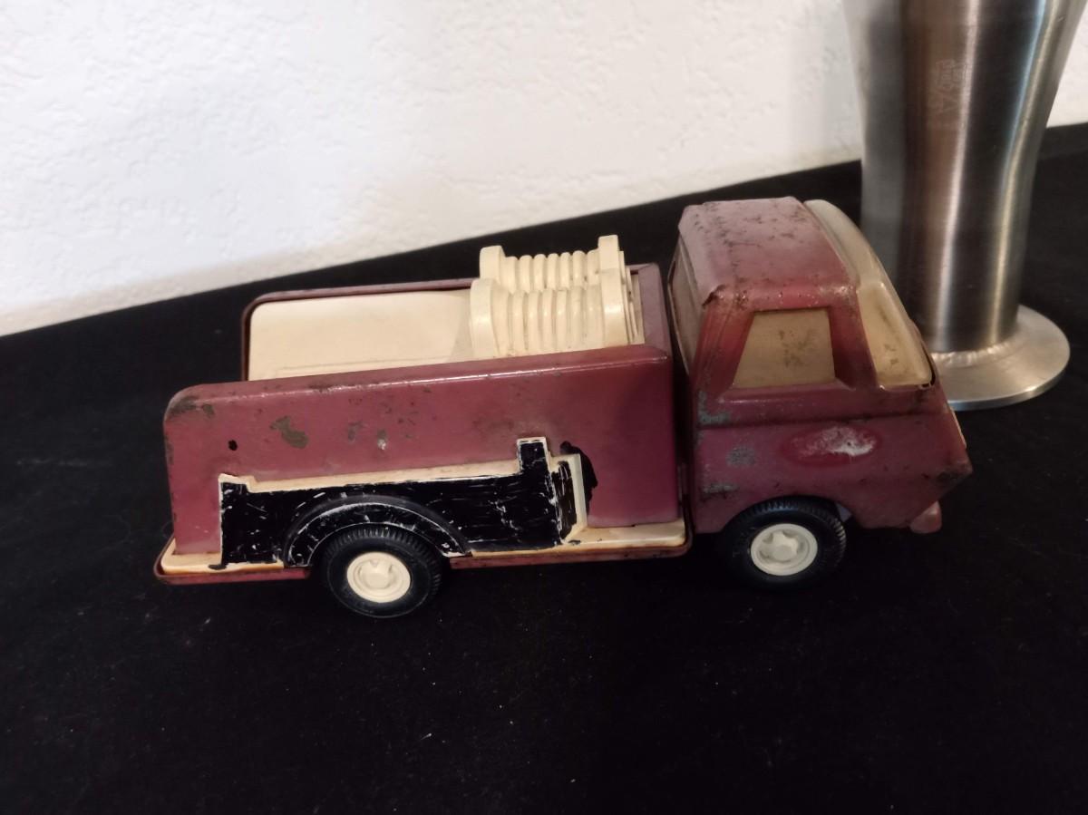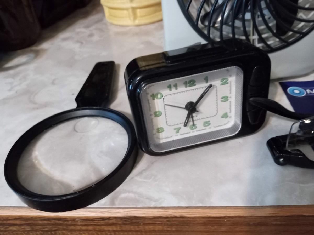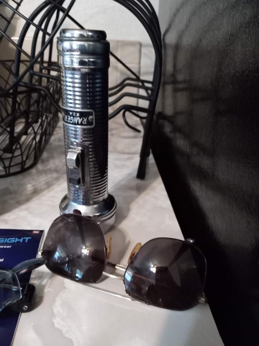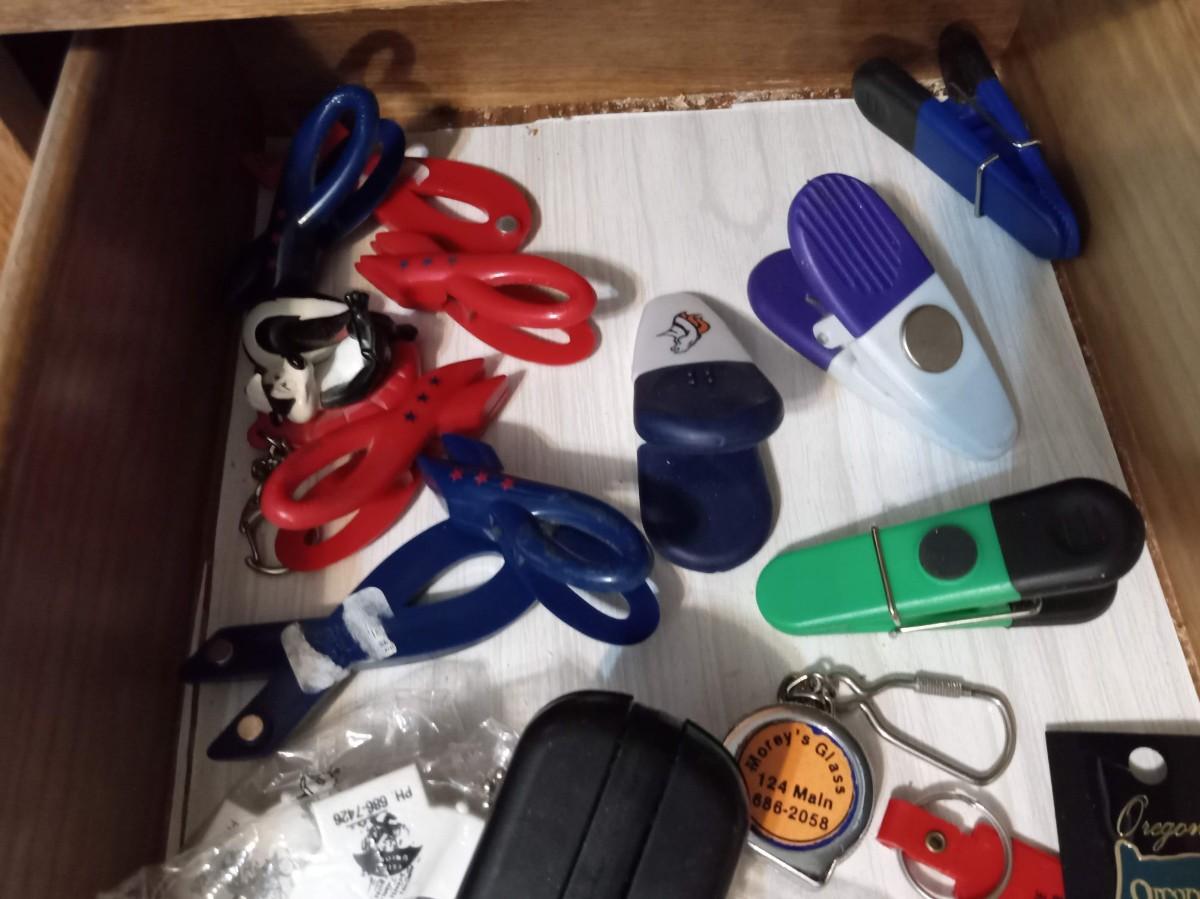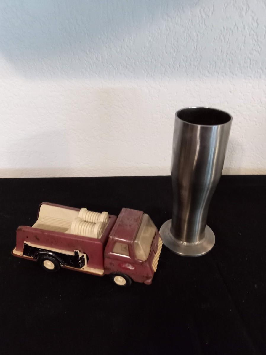 KEYCHAINS, CHIP CLIPS, MONOGRAMMED ZIPPO LIGHTER, VINTAGE MEN'S SUNGLASSES, FLASHLIGHT, LIGHTED GLASSES, MAGNIFYING GLASSES, ALARM CLOCK, BATTERY OPERATED SMALL FAN, TONKA TOY TRUCK THAT HAS SEEN BETTER DAYS, REPURPOSED PIPE INTO A PENCIL HOLDER