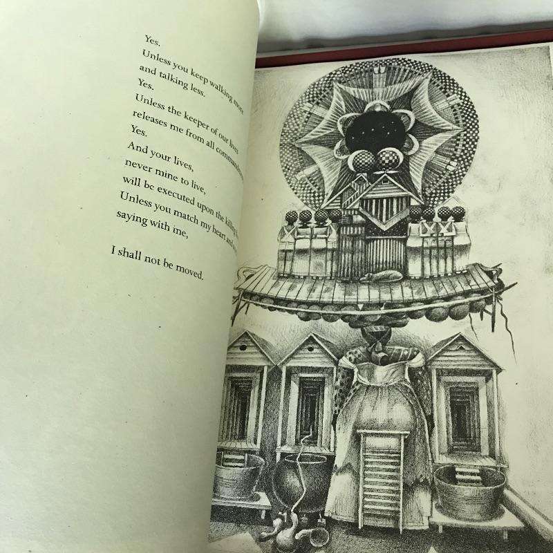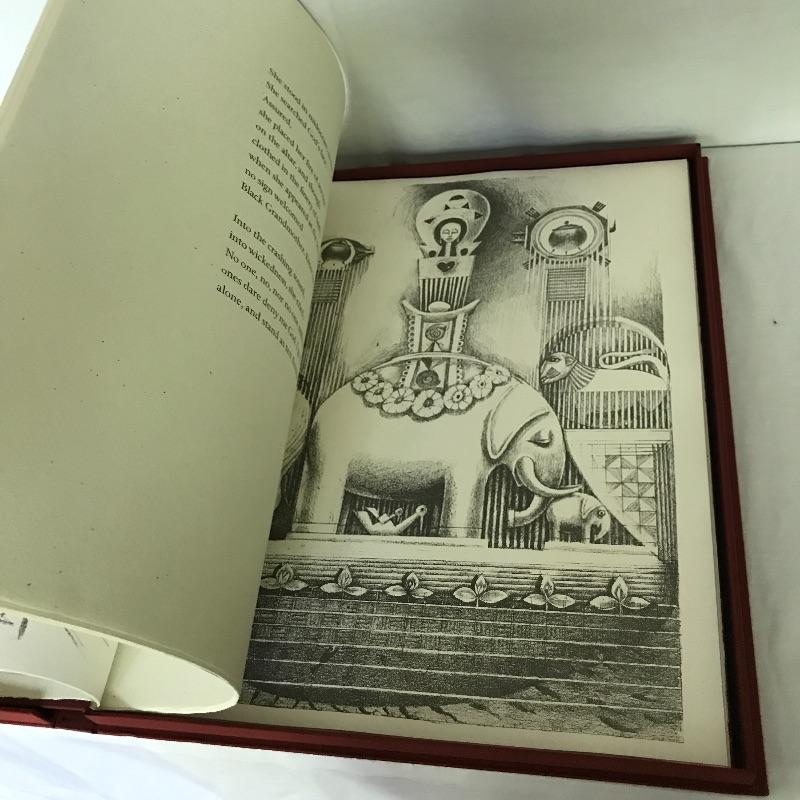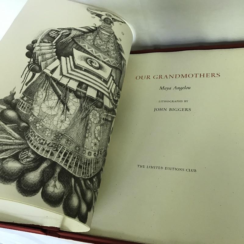 This fantastic piece of art measures 23” x 18.5” x 1.5”. Book is called Our Grandmothers by Maya Angelo with lithographs by John Biggers. Gorgeous folio with red Japanese fabric book and clamshell case. Minimal wear on shell. Excellent condition. Shipping available.