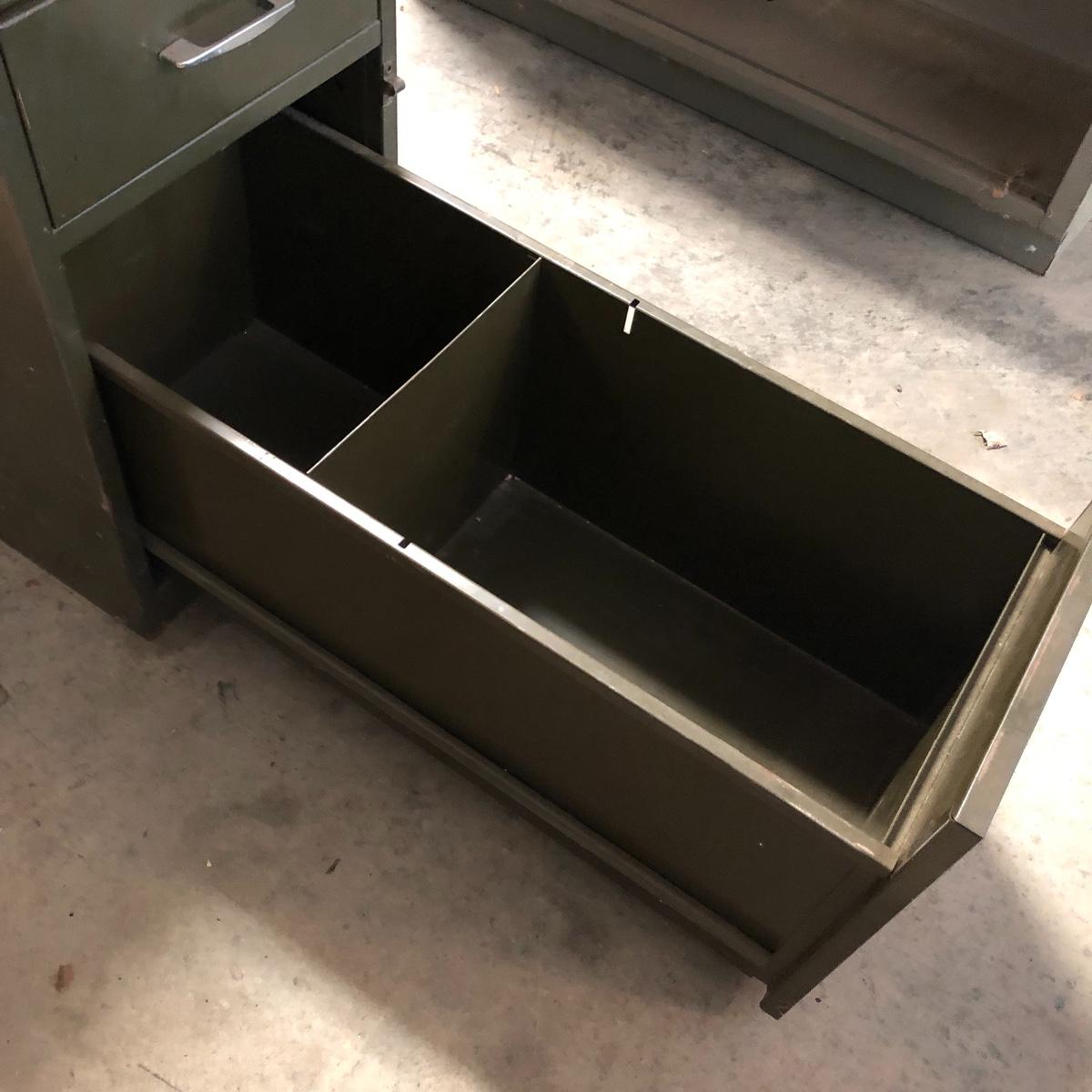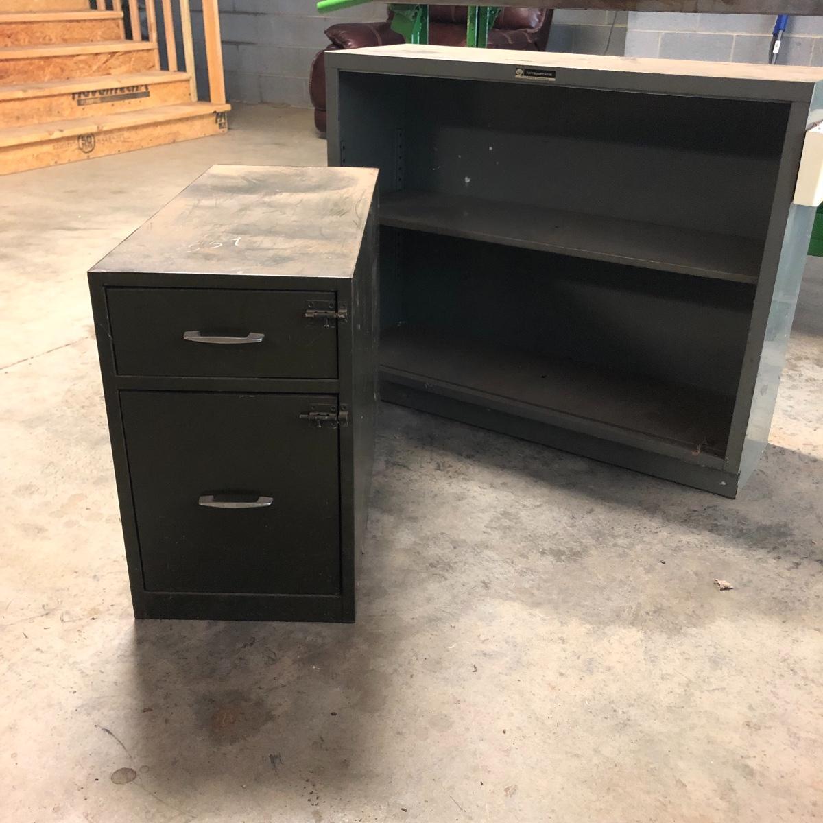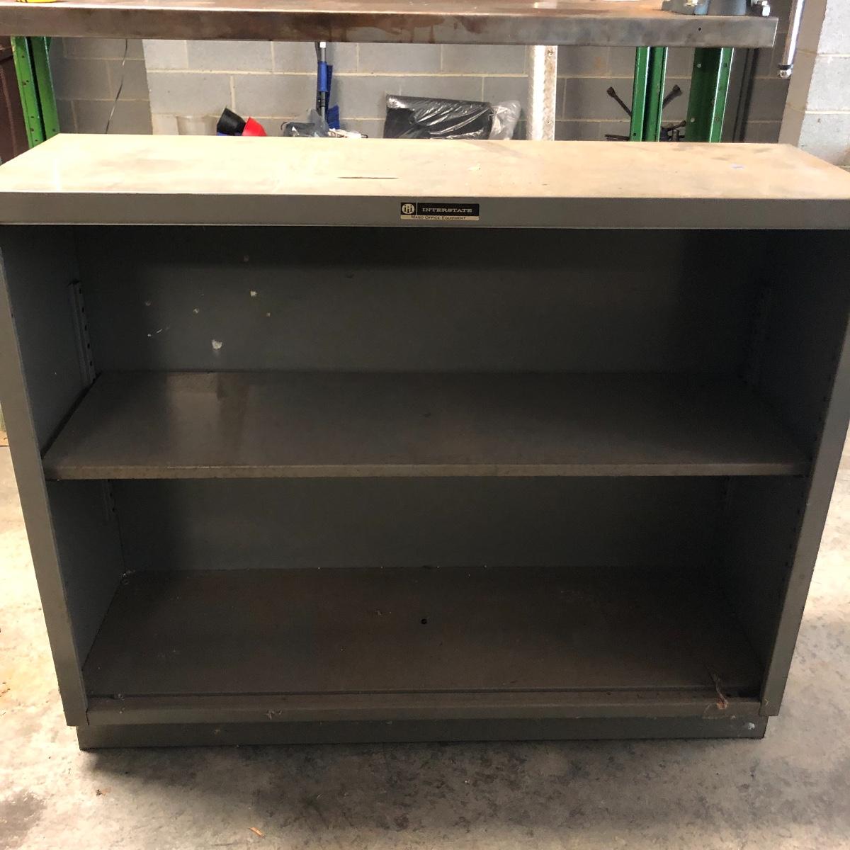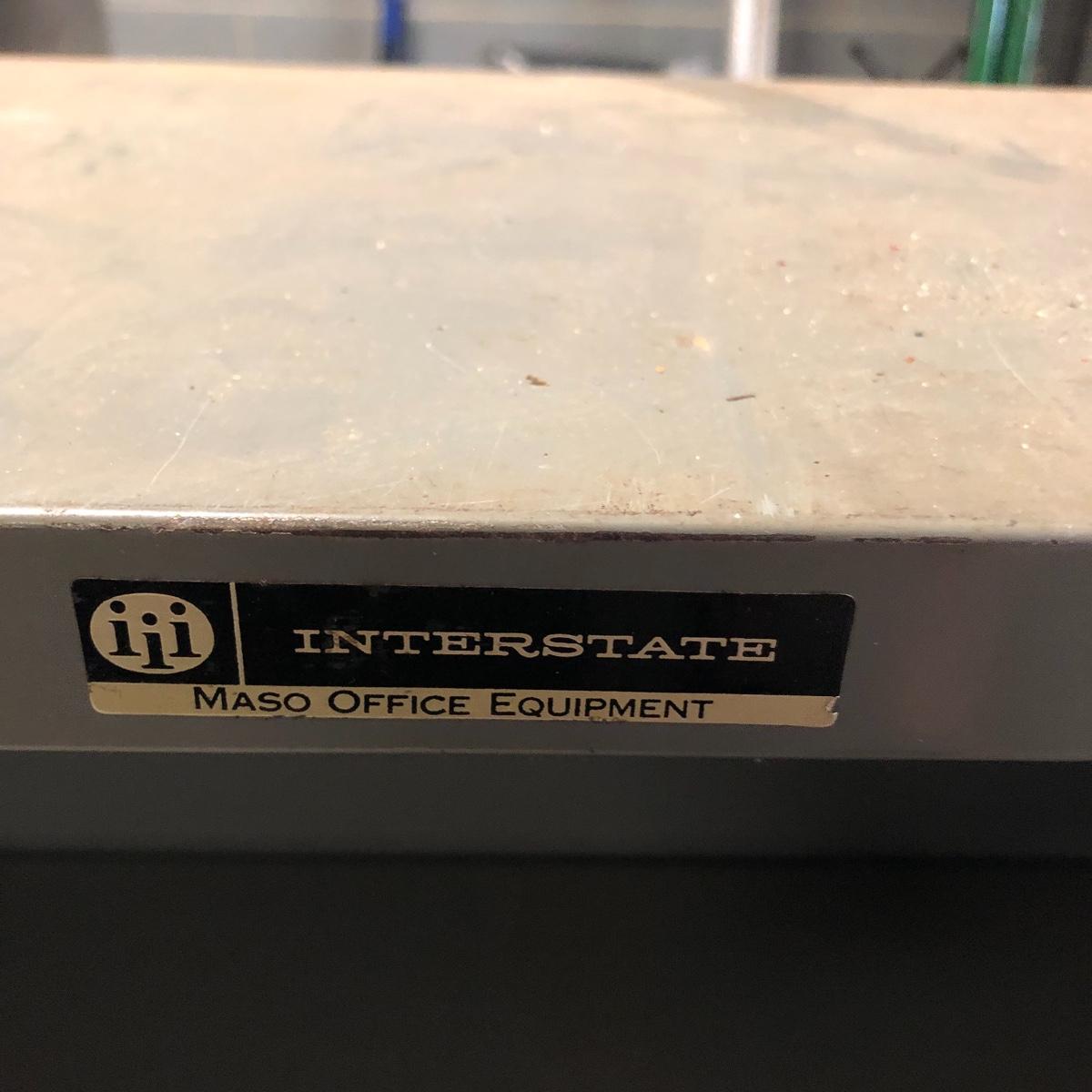 This lot includes two nice vintage metal storage units. One is an Interstate shelf unit with one adjustable shelf and a file cabinet with one drawer and one hanging file compartment; both of which have latches. Both pieces have some surface rust and a few other blemishes that are shown in images. The file cabinet is extra deep so it will hold plenty of files, measures 14” wide x 29” deep x 21” high. Local pick-up only.