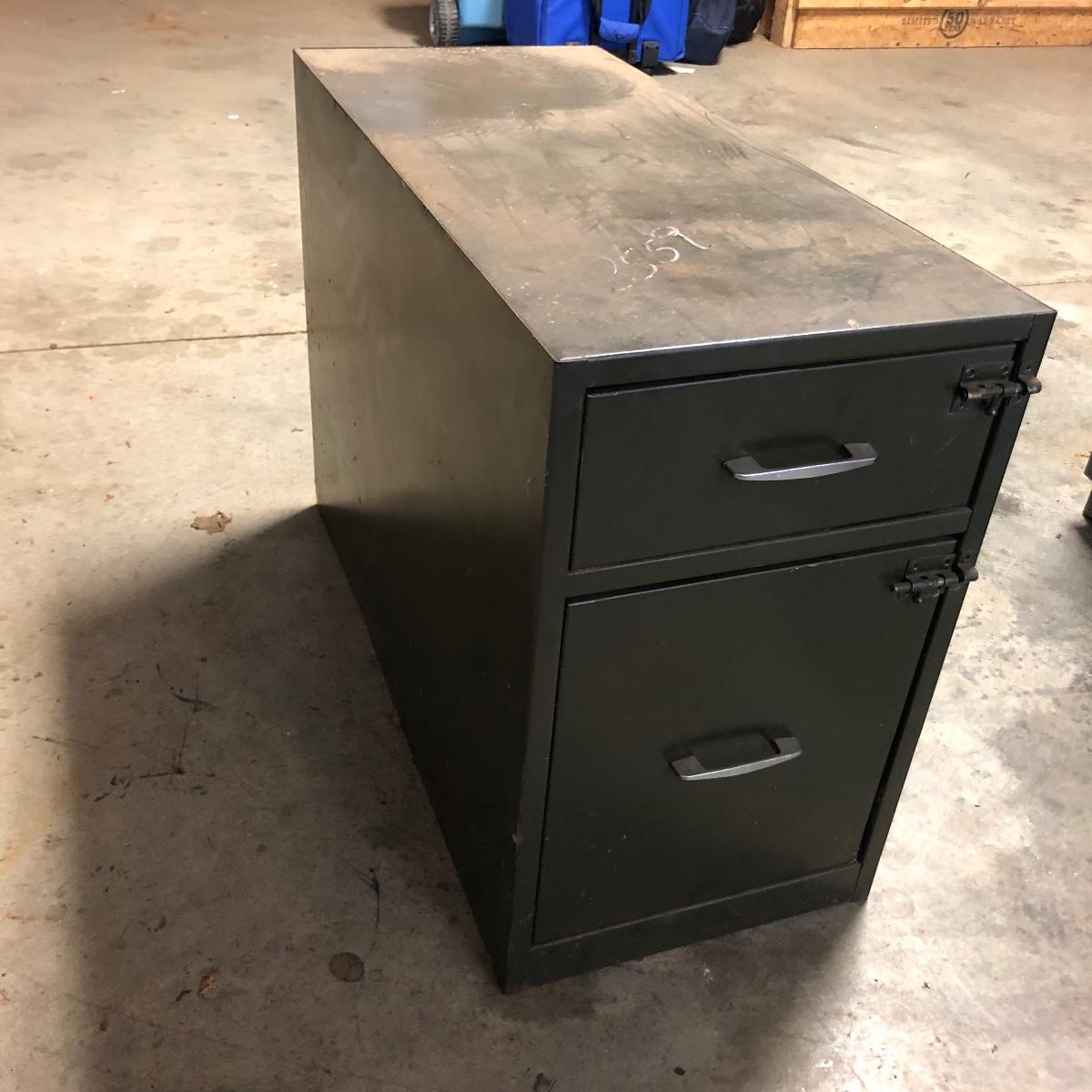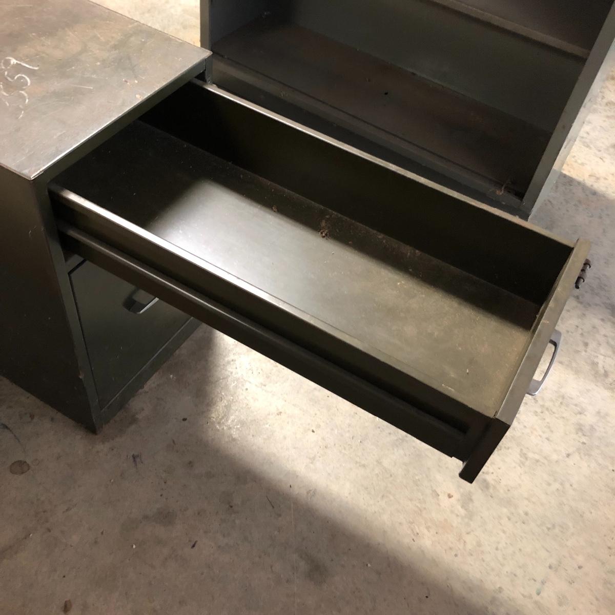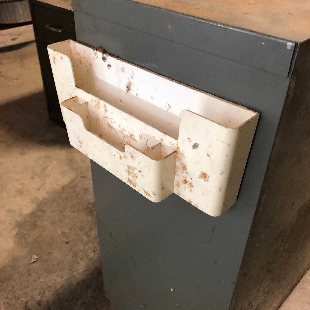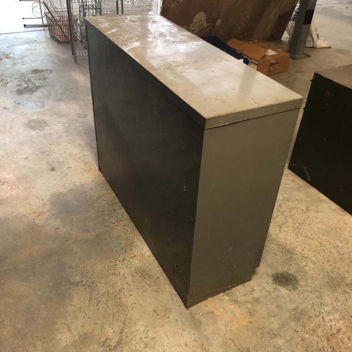 This lot includes two nice vintage metal storage units. One is an Interstate shelf unit with one adjustable shelf and a file cabinet with one drawer and one hanging file compartment; both of which have latches. Both pieces have some surface rust and a few other blemishes that are shown in images. The file cabinet is extra deep so it will hold plenty of files, measures 14” wide x 29” deep x 21” high. Local pick-up only.