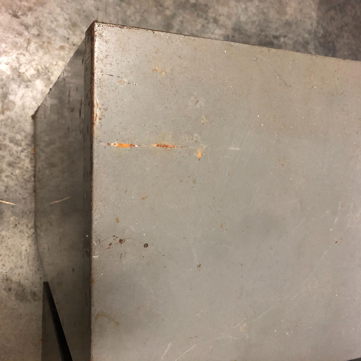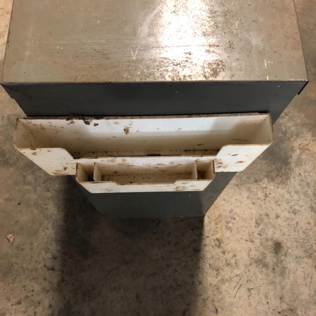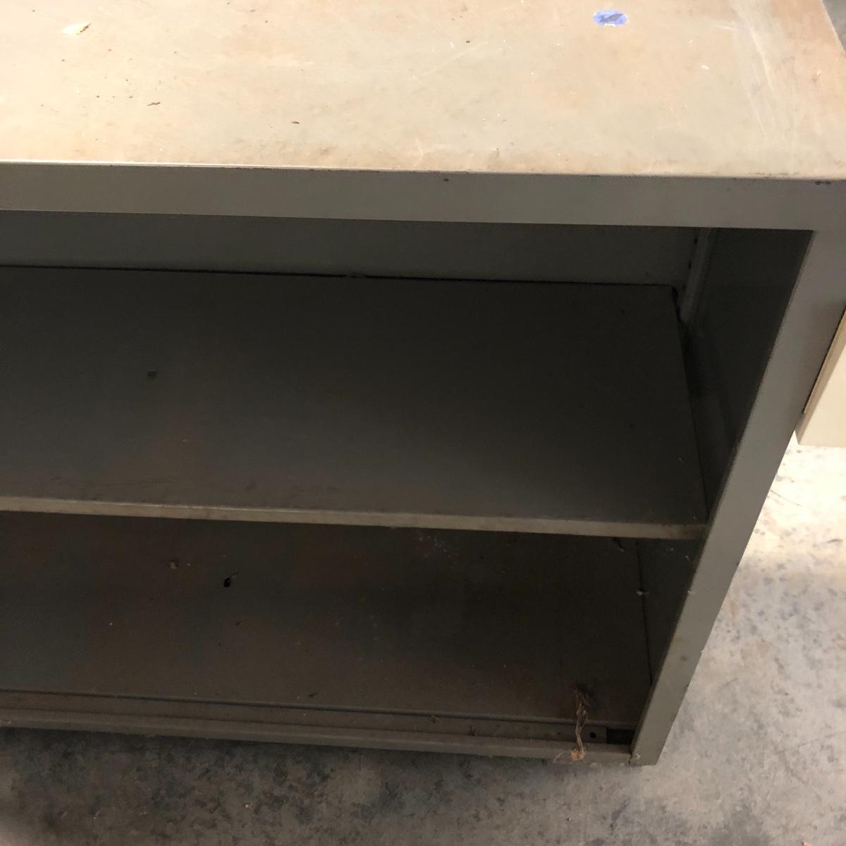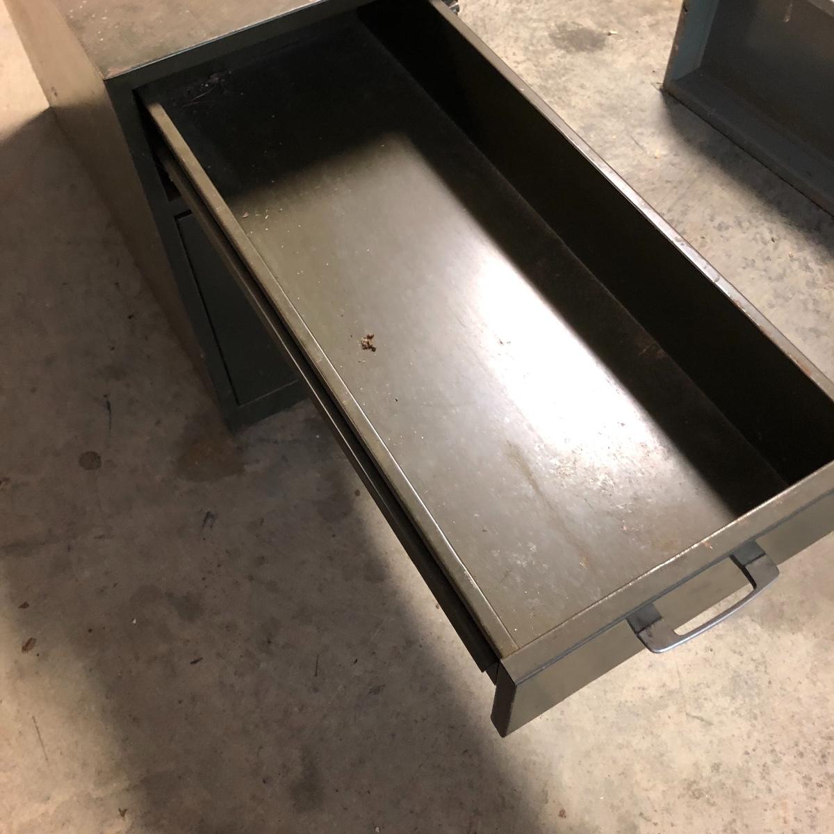 This lot includes two nice vintage metal storage units. One is an Interstate shelf unit with one adjustable shelf and a file cabinet with one drawer and one hanging file compartment; both of which have latches. Both pieces have some surface rust and a few other blemishes that are shown in images. The file cabinet is extra deep so it will hold plenty of files, measures 14” wide x 29” deep x 21” high. Local pick-up only.