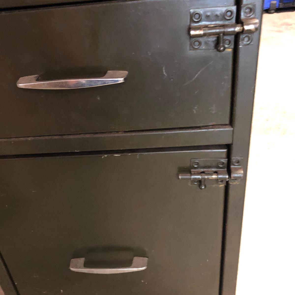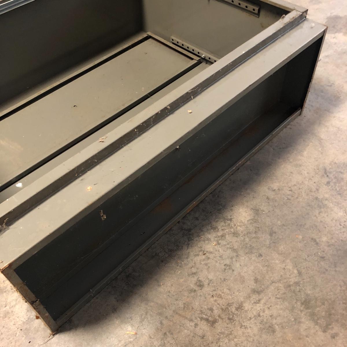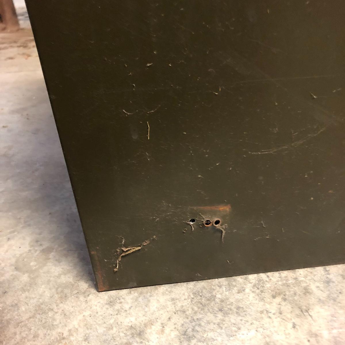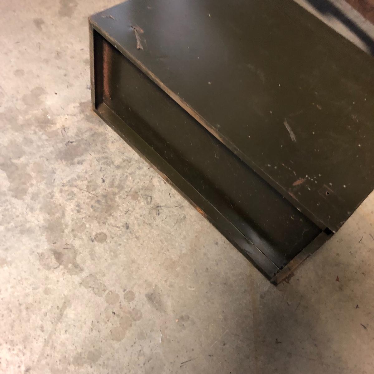 This lot includes two nice vintage metal storage units. One is an Interstate shelf unit with one adjustable shelf and a file cabinet with one drawer and one hanging file compartment; both of which have latches. Both pieces have some surface rust and a few other blemishes that are shown in images. The file cabinet is extra deep so it will hold plenty of files, measures 14” wide x 29” deep x 21” high. Local pick-up only.