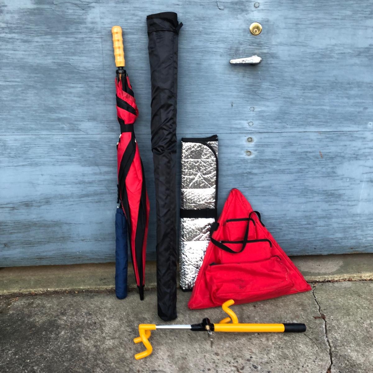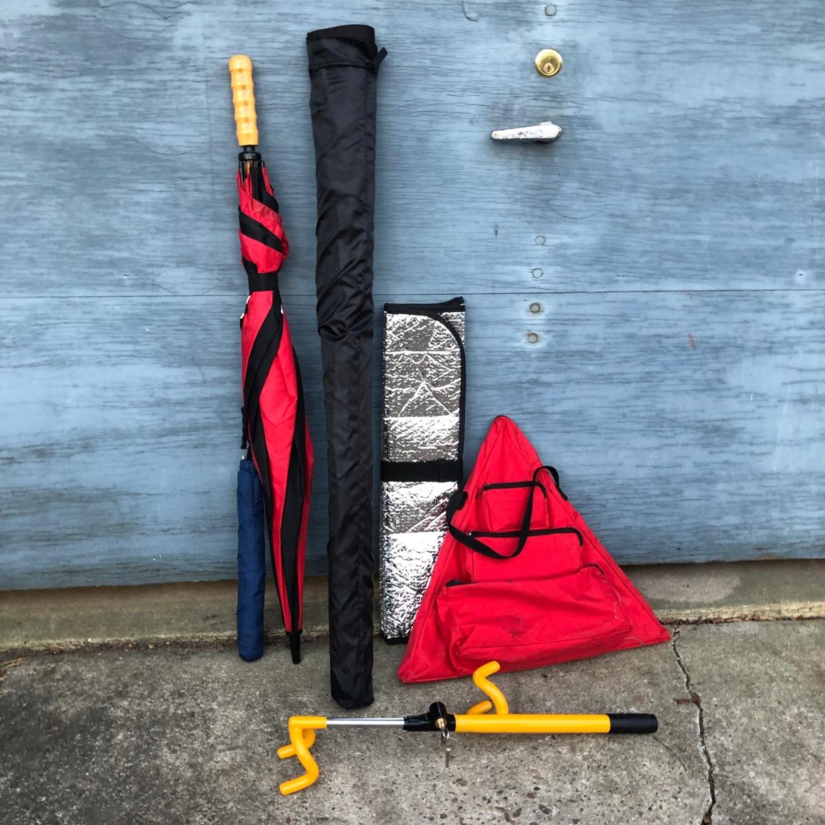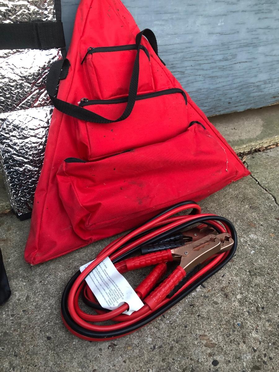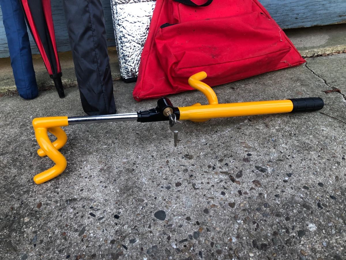 LOT 425G: Car Essentials - Emergency Road Kit, Frost Guard, Reflective Cover, Steering Wheel Lock & Umbrellas