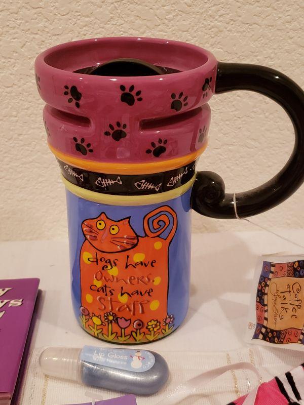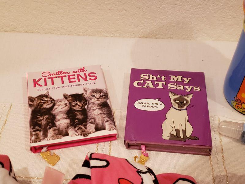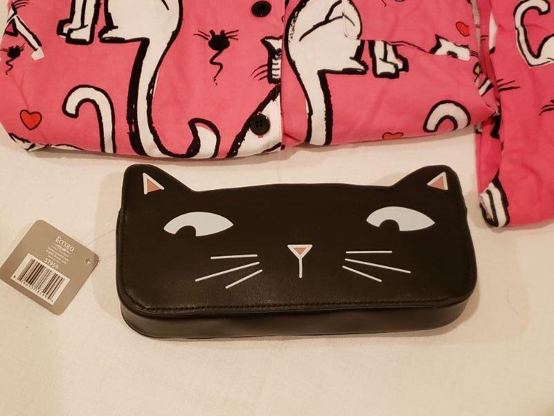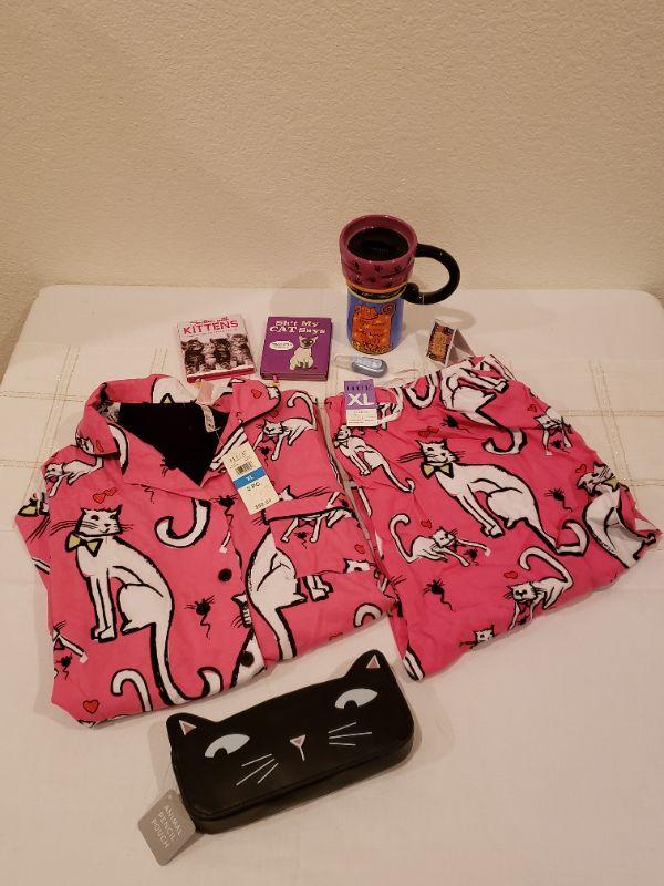Lot 426: NEW Cat PJs (Ladies XL), Cat Zipper Pouch, Travel Ceramic Coffee Cup & 2 Mini Cat Books