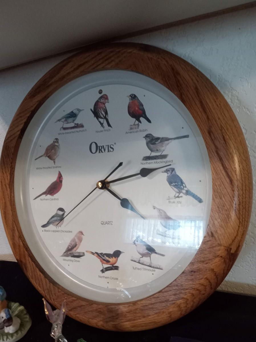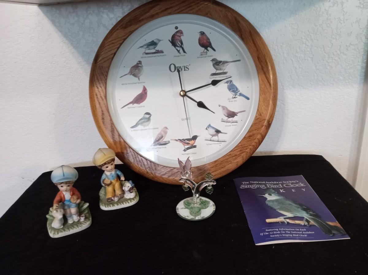 LOT 426 SINGING BIRD CLOCK, FIGURINES AND GLASS HUMMINGBIRD FIGURE (Kitchen)