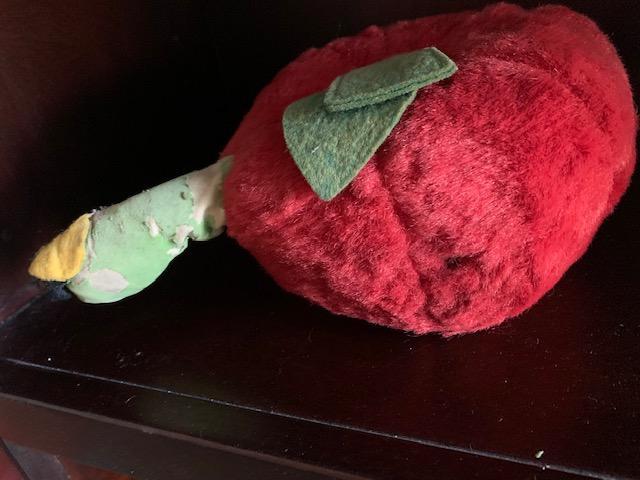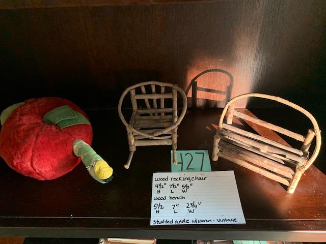 3 items: wooden rocking chair and bench, stuffed apple with worm wind up toy no key as is