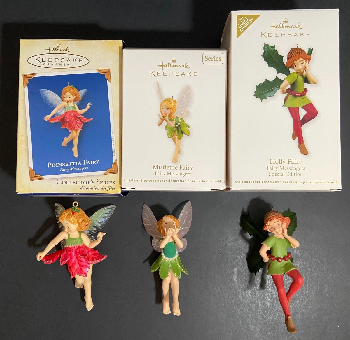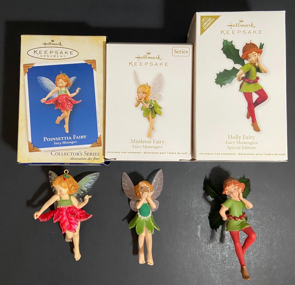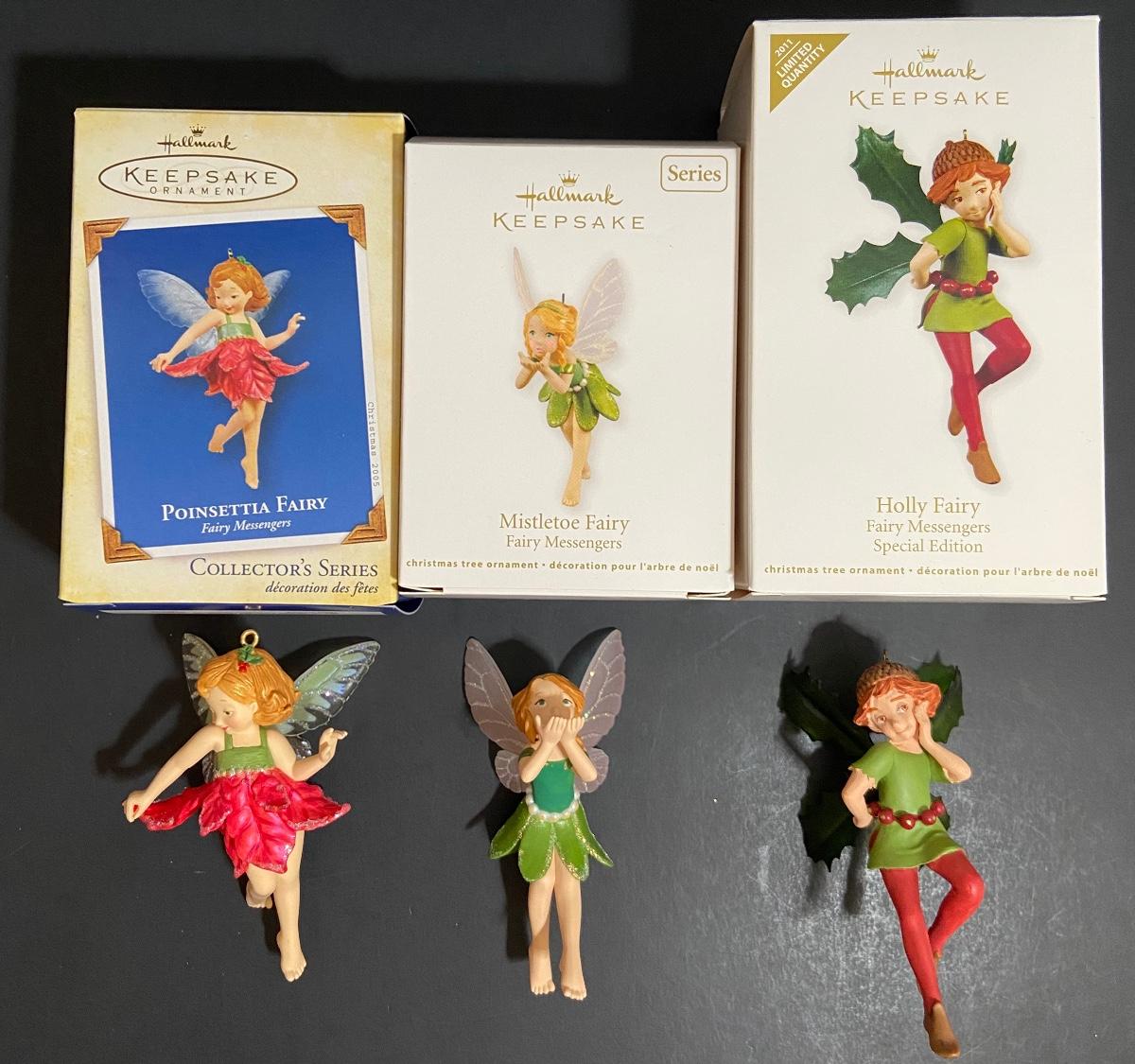 Poinsettia, Holly and Mistletoe Fairies. All Holiday items in this auction are as-seen. The client collected a lot of holiday pieces and some are new in box, some were displayed once and come with original box, and some have been displayed and come with no box. They are all pre-owned in some fashion and have been stored in an attic or on shelf in library. Please see all pictures. The pictures show condition, measurements if taken, and what is included in the lot. Due to the large amount that we photograph and the time frame, we are not always able to take measurements. All items unless noted, are pre-owned and have been used. Thank you