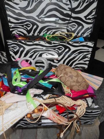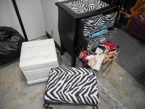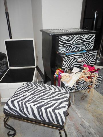 Lot 428 - Zebra Nightstand Full of Goodies, Zebra Stool, White Cube Footed Stool