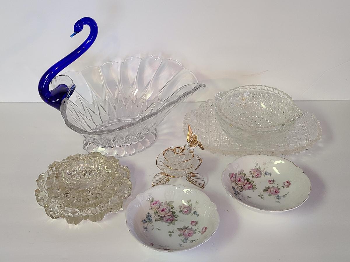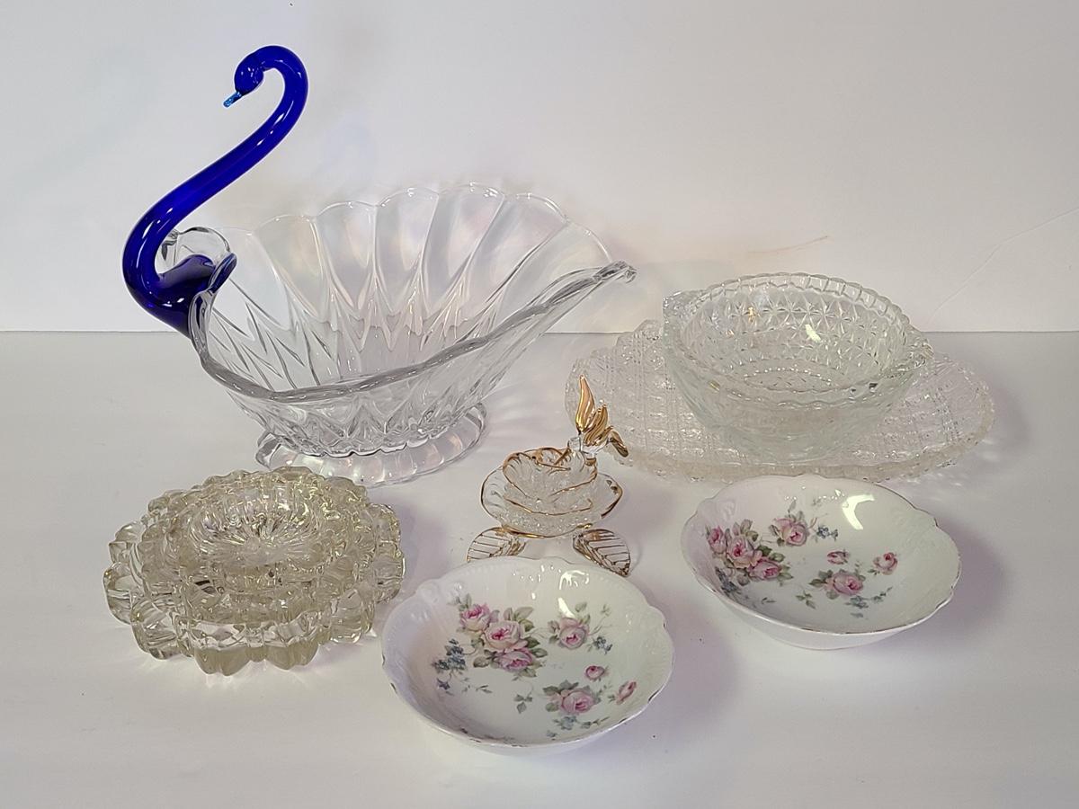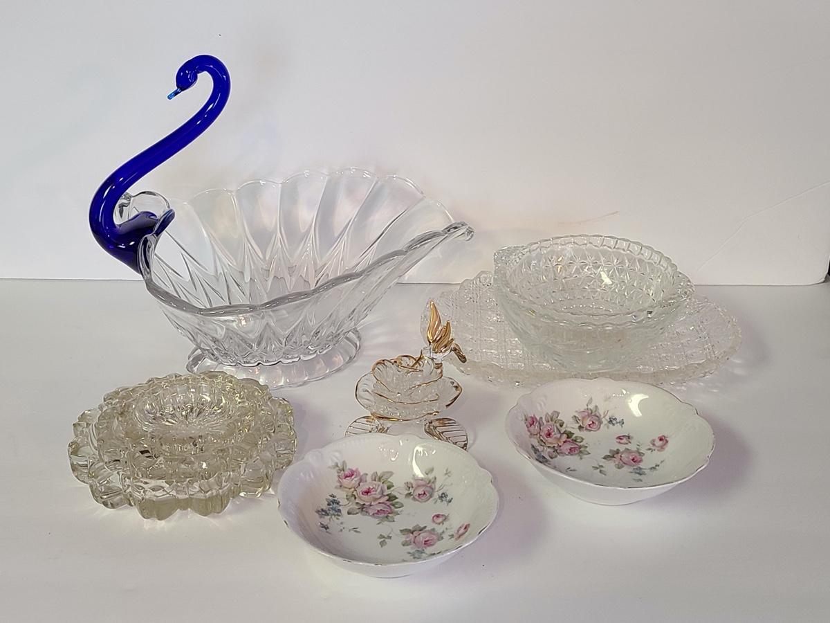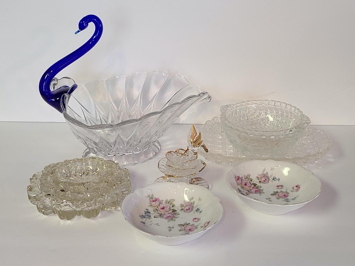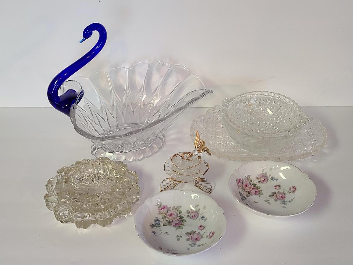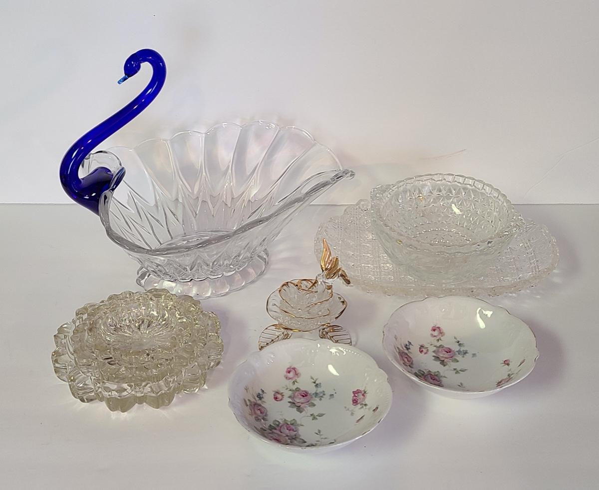 Lot 429: Blue Neck Swan Glass Server & Dainty Vintage Glass