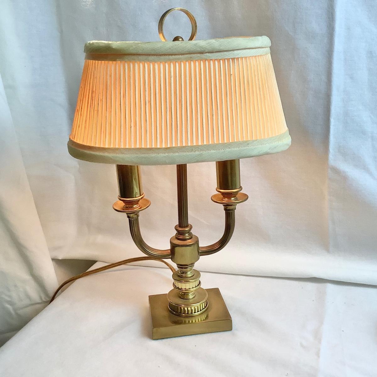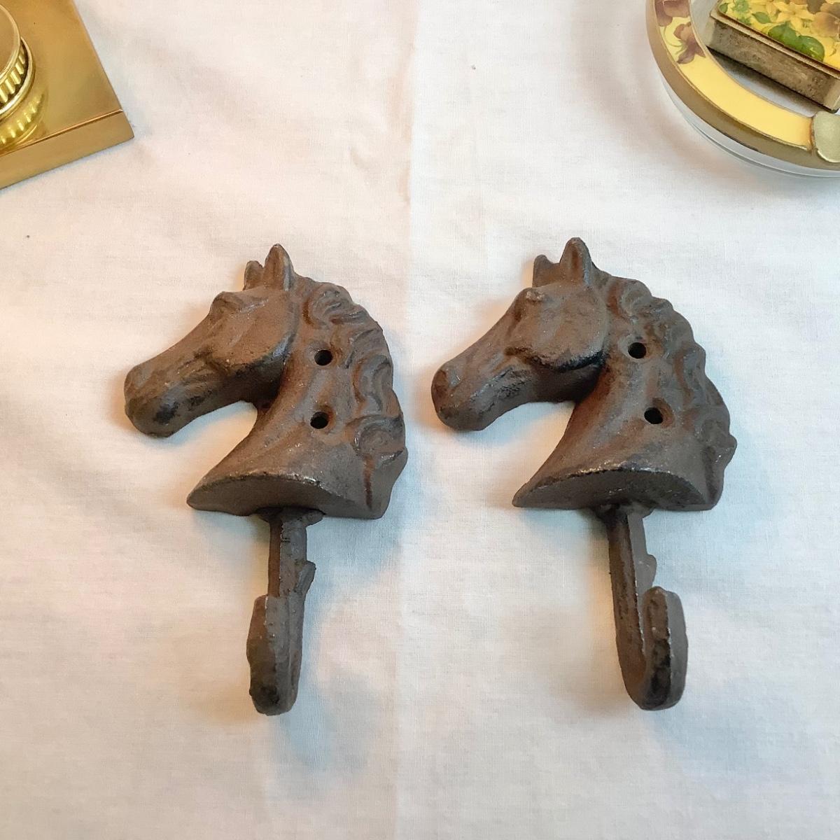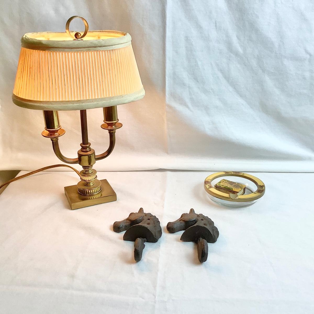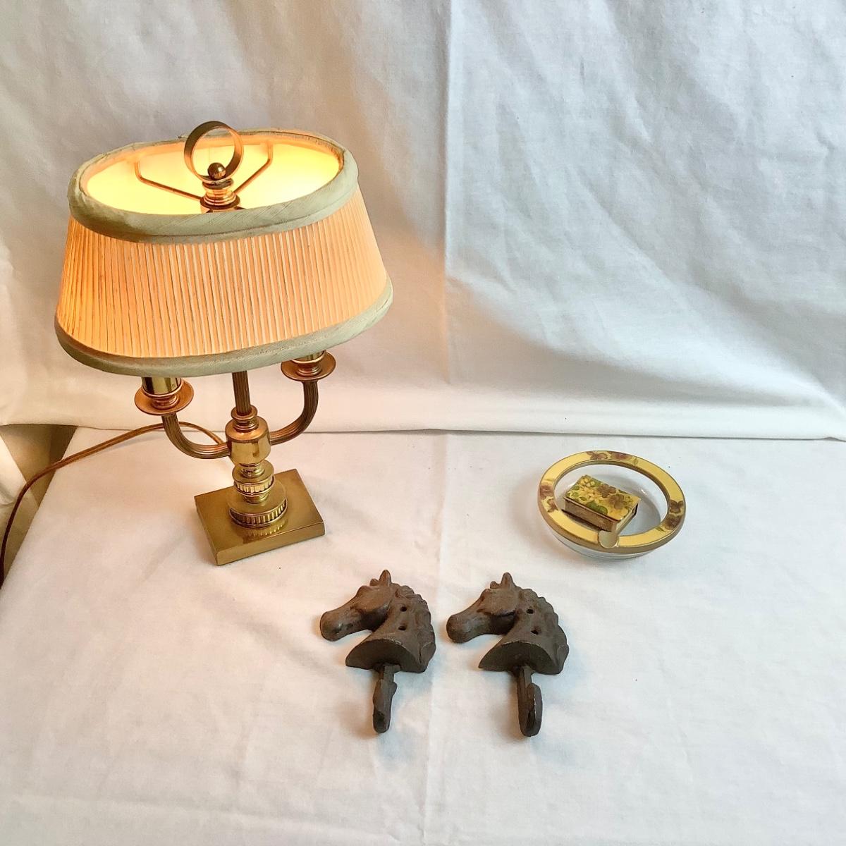 Lot 429. Small Brass Desk Lamp, Pair of Cast Iron Horse Hooks, Small Glass Ash Tray with Floral Decorative Trim and Matching Match Case