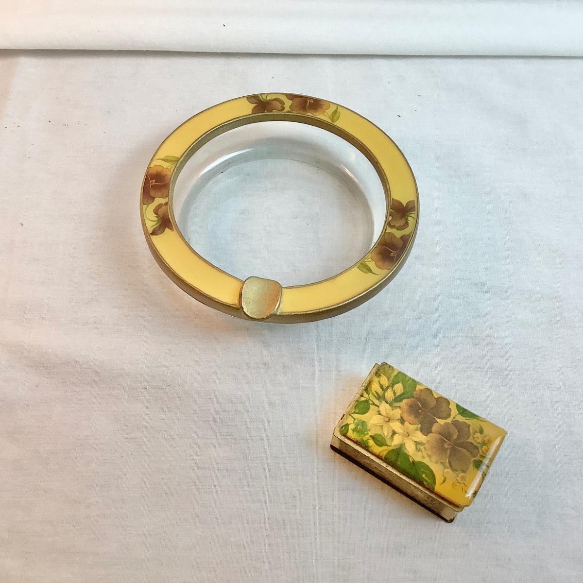 Small Glass Ash Tray with Floral Decorative Trim and Matching Match Case